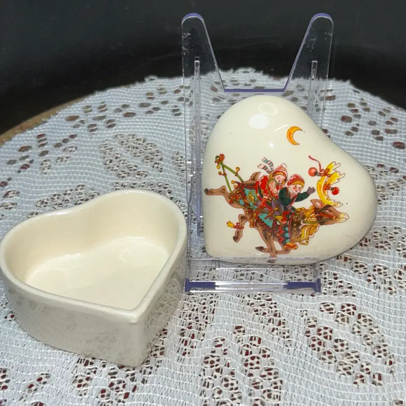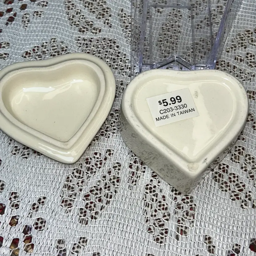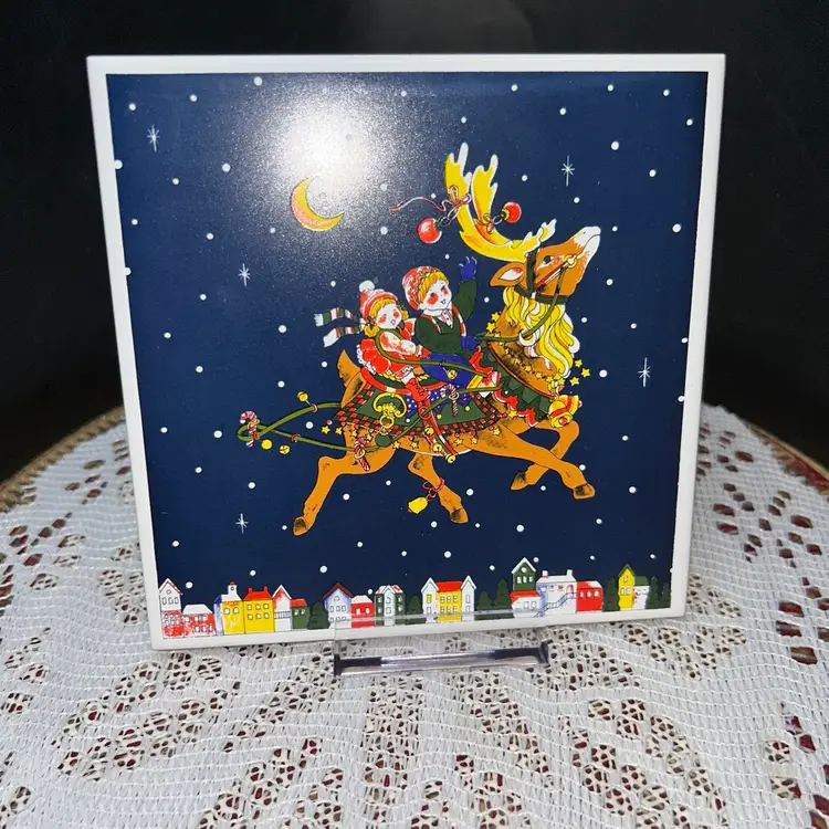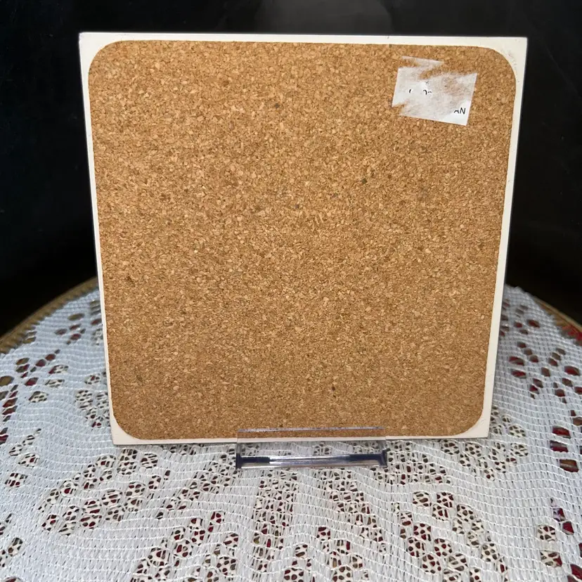 Both are made in Taiwan. Tile is approximately 6” x 6” square. It is backed with cork. Trinket box is 3.25” wide at widest, 3” tall, and 2” deep. Excellent condition. No chips or cracks. Sold together.