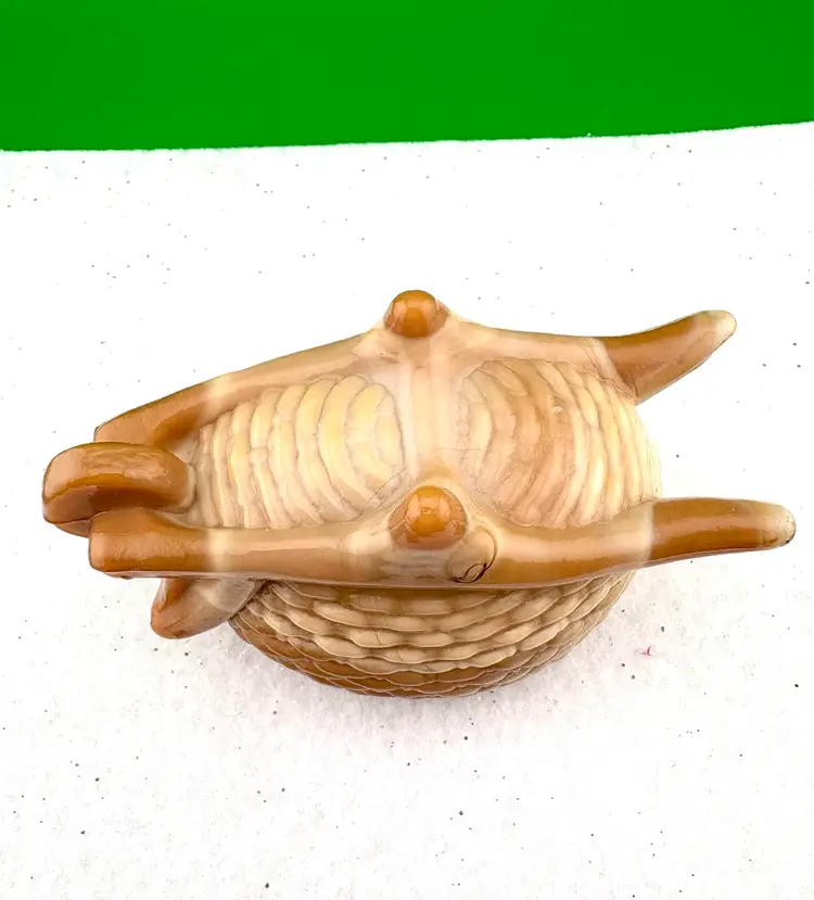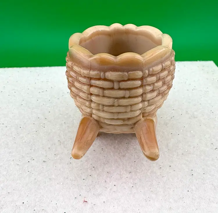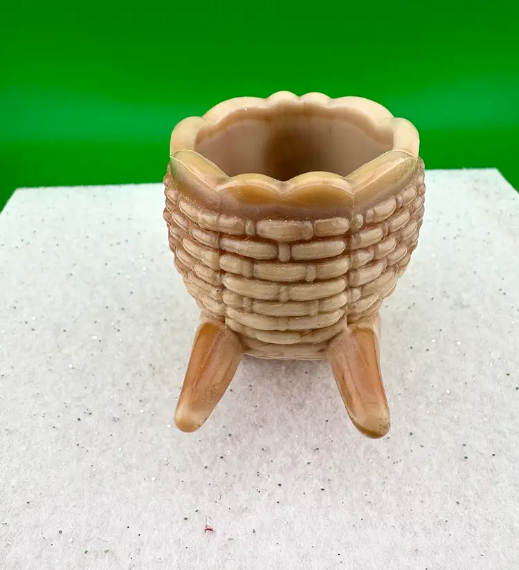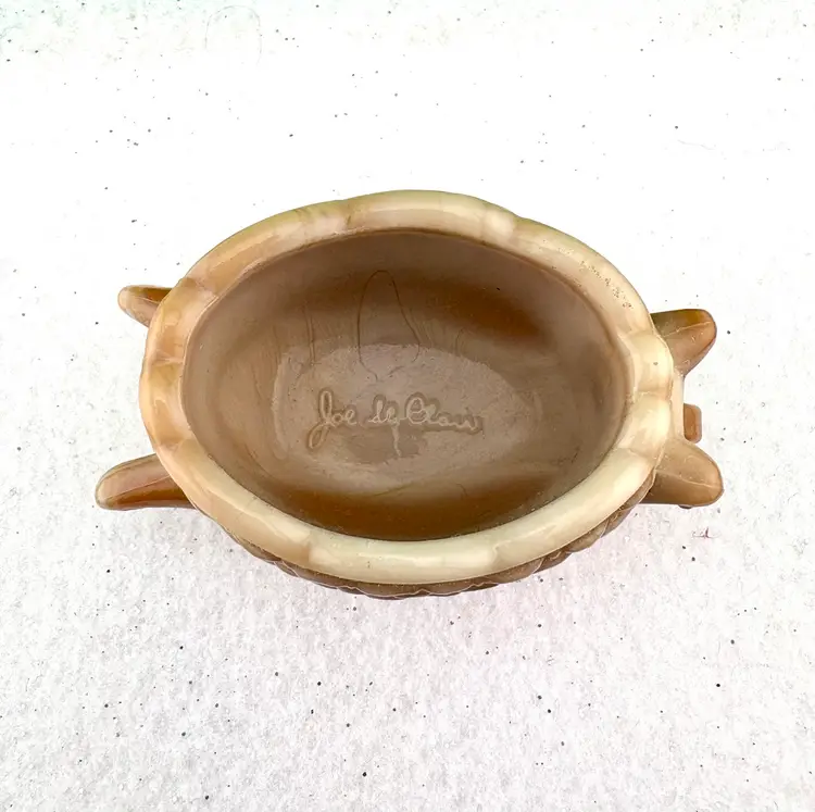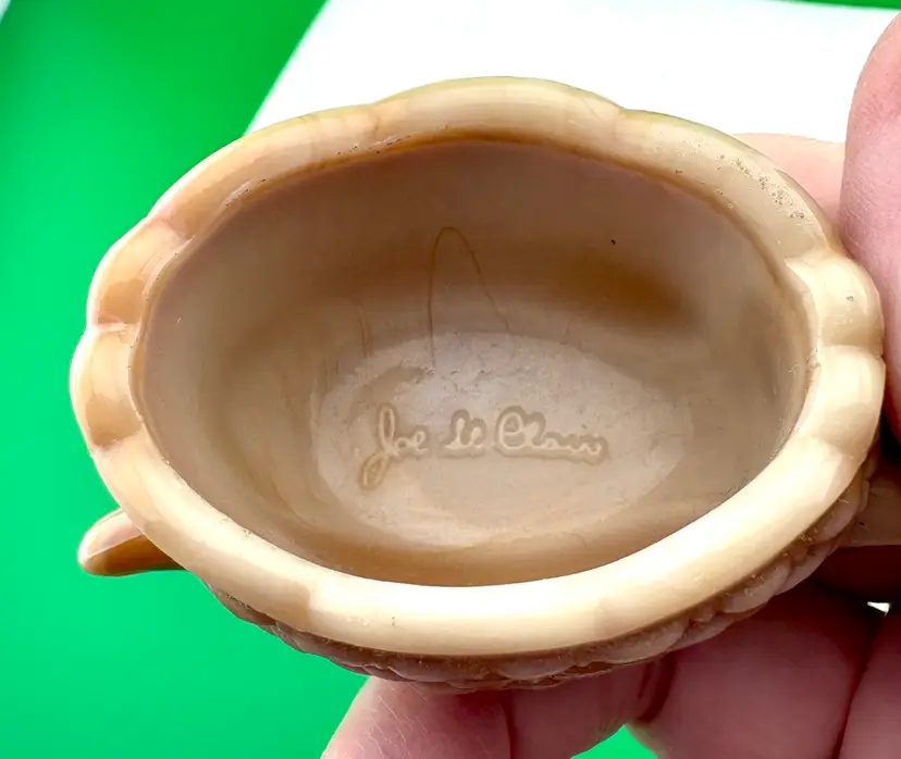 These are beautiful pieces and are marked Joe St Clair inside the wheelbarrow. One is lighter than the other. One has a bit of roughness on the inside of the handle. There are no chips or cracks.