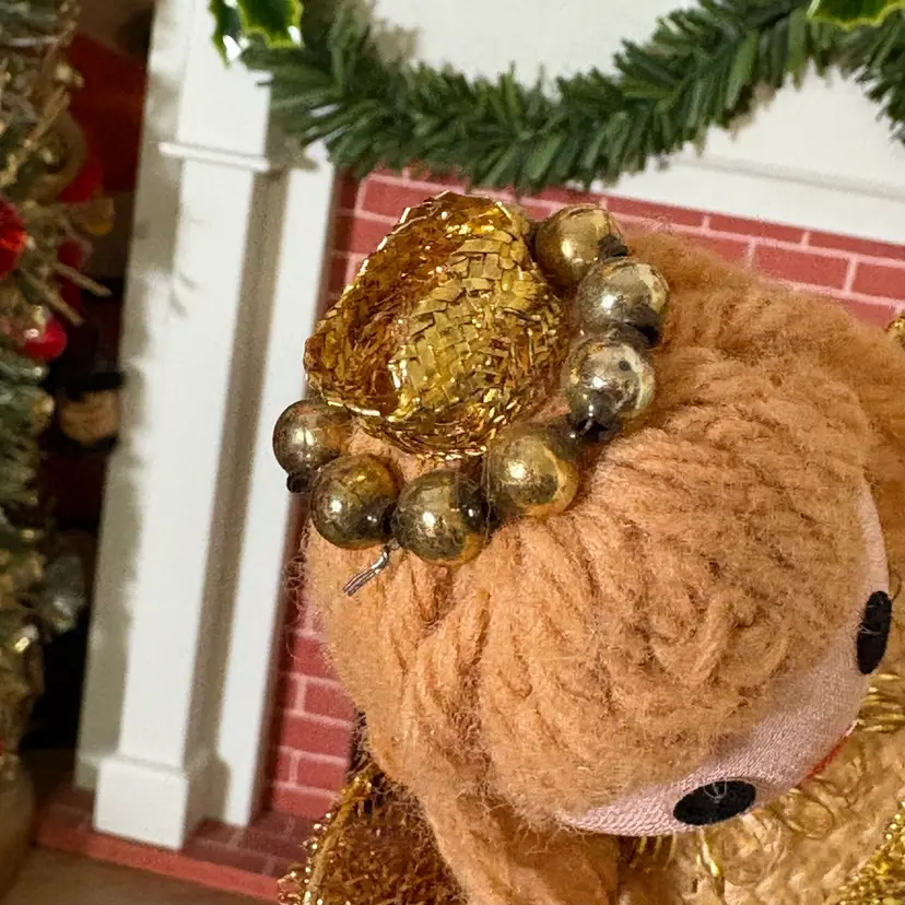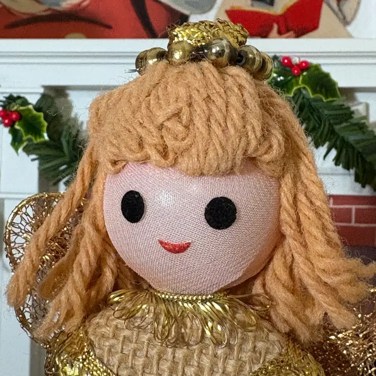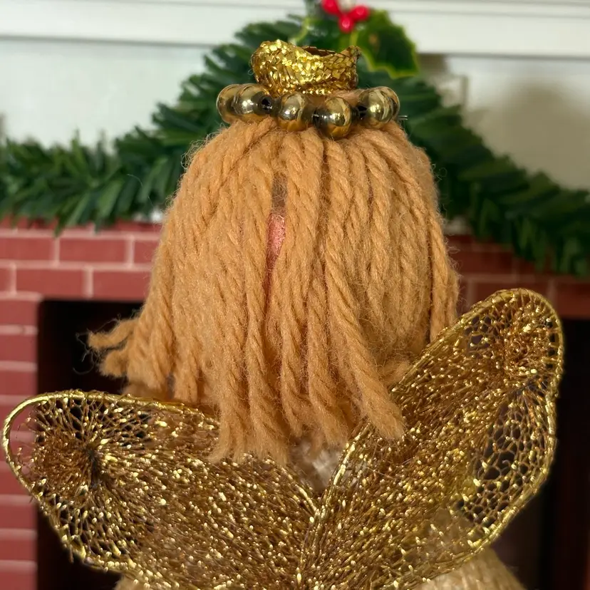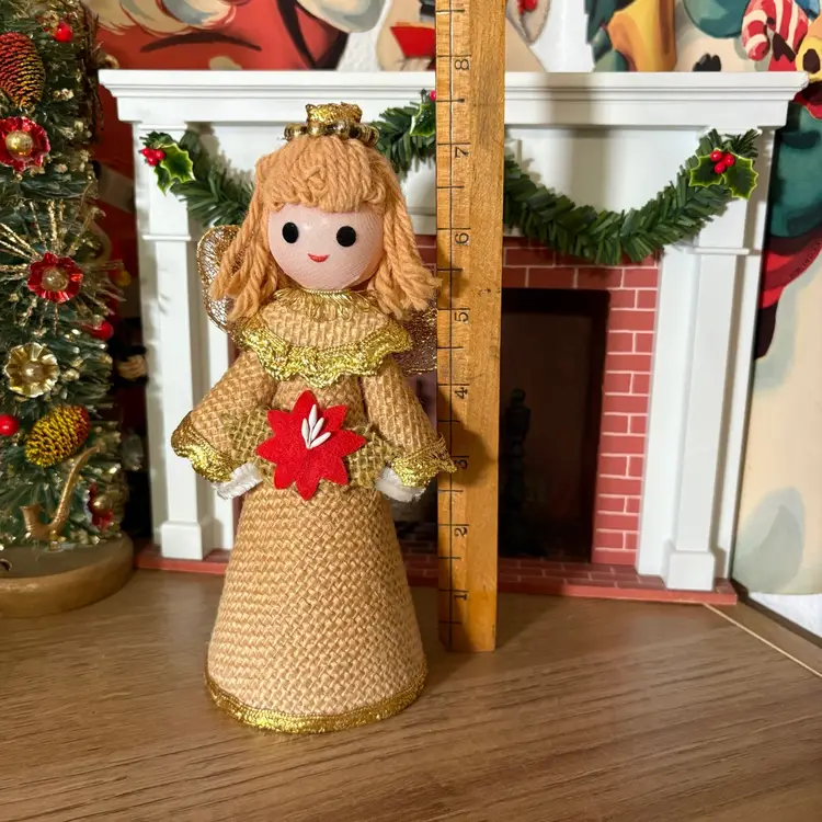 Beautiful burlap girl holding a poinsettia with yarn hair, gold crown and mercury glass bead halo.