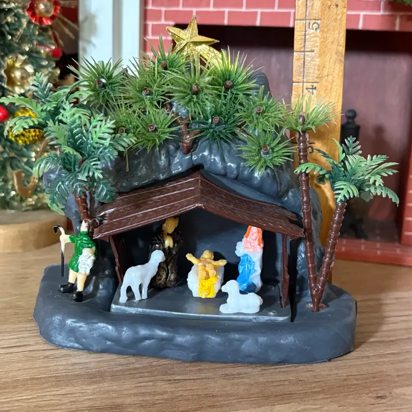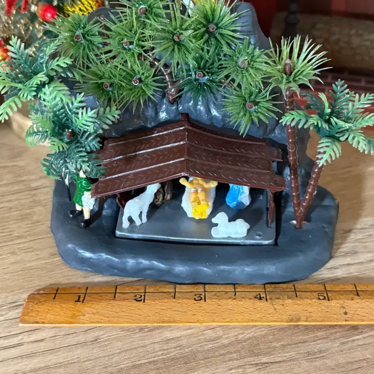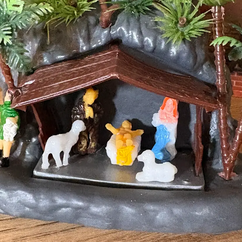 Very sweet plastic blow mold manger scene surrounded by trees. Mary, Joseph, Jesus, Shepard and 2 sheep present. Gold star on the roof looks like a repair. Would be a great addition to your winter holiday collection.