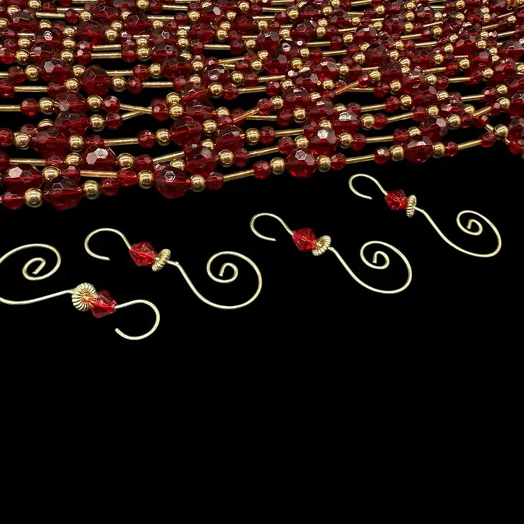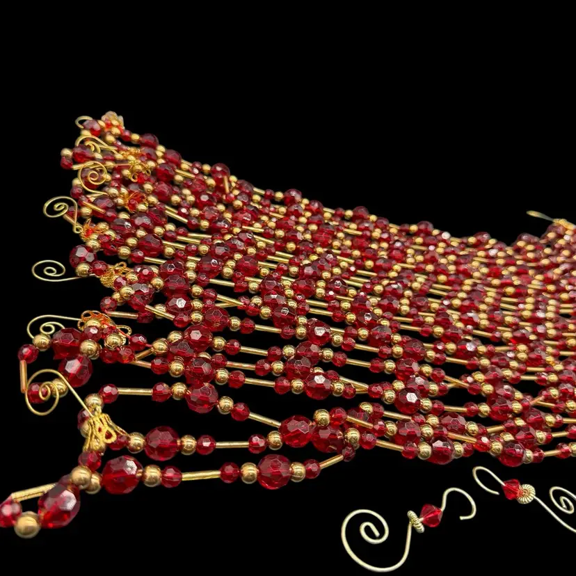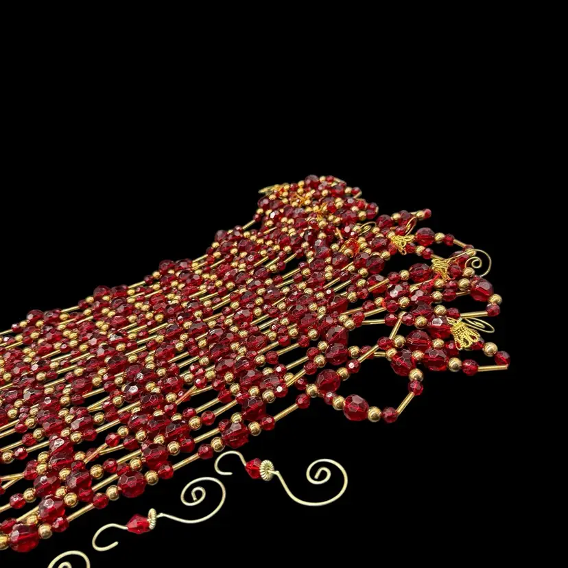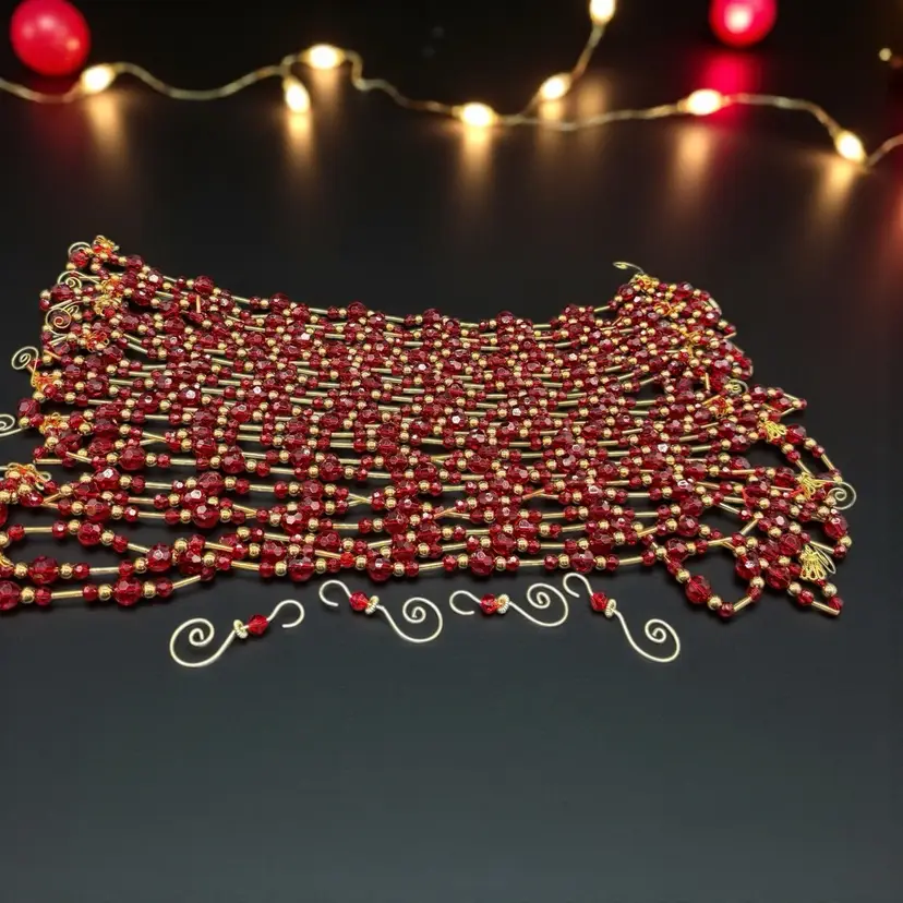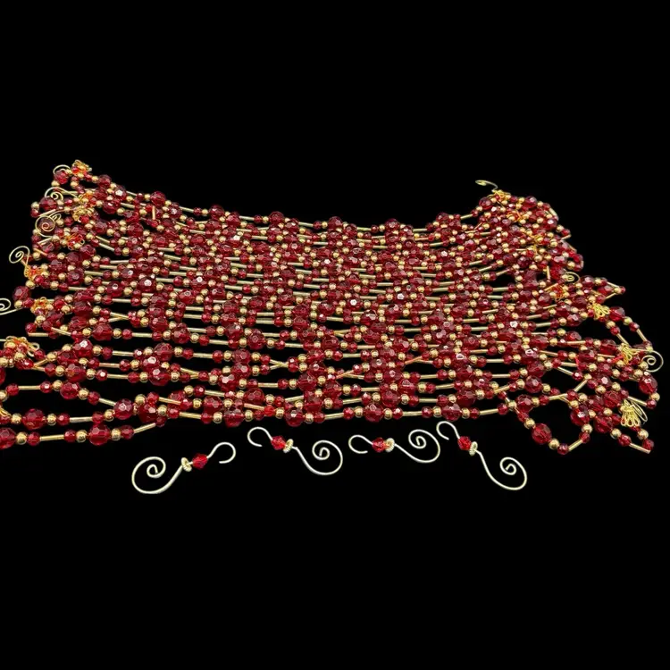 This product is a set of eight triple strands of vintage Christmas garland swags and 4 connectors made with red and gold faceted plastic beads. The garlands are artificial and designed for holiday decorating, making them a festive addition to any Christmas tree or home decor. With their intricate beadwork and classic color combination, these garlands are perfect for collectors or anyone looking to add a touch of vintage charm to their holiday celebrations.