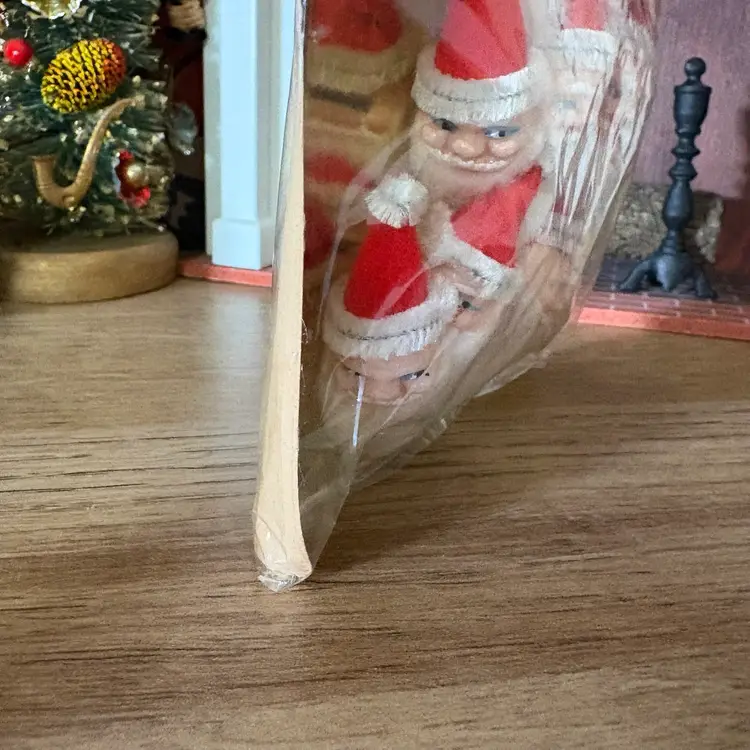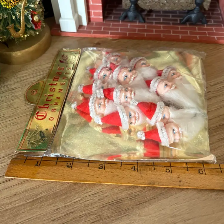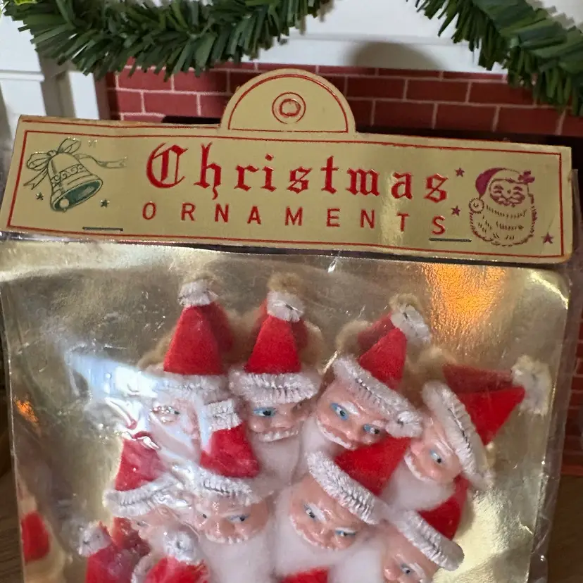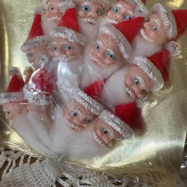 Still sealed, package decor. Plastic Santa Heads on pipe cleaners. Some bends to the gold backing. Perfect for Christmas, Holiday assemblages, dioramas and displays.