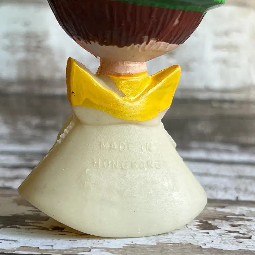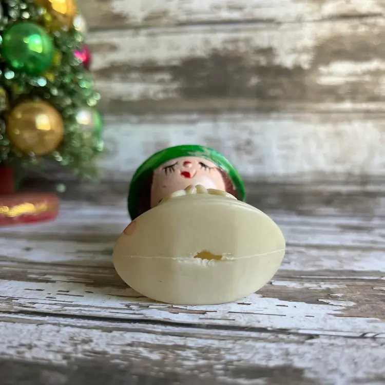 Super sweet plastic girl ornament with an adorable vtg holiday green Christmas tree hat. She'll definitely look great on your kitschy aluminum tree, in any assemblage or winter decor vignette.