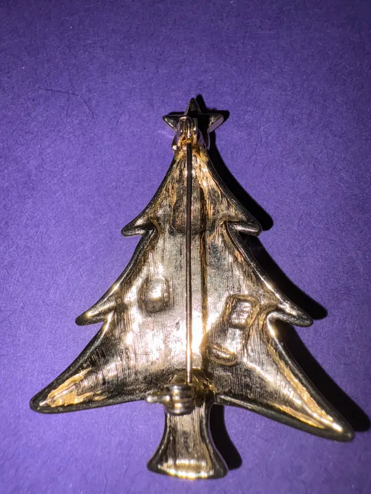 This is a cute Christmas tree brooch. It has a snowman, Santa and reindeer on the front. It is in great pre-owned condition.