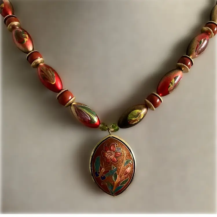 Vintage cloisonne butterfly and flower oendant necklace. The necklace itself is created with natural carnelian, metal and hand painted traditional beads. Necklace length measures 20 1/2” long. It fastems with a pretty flower design pinch clasp.