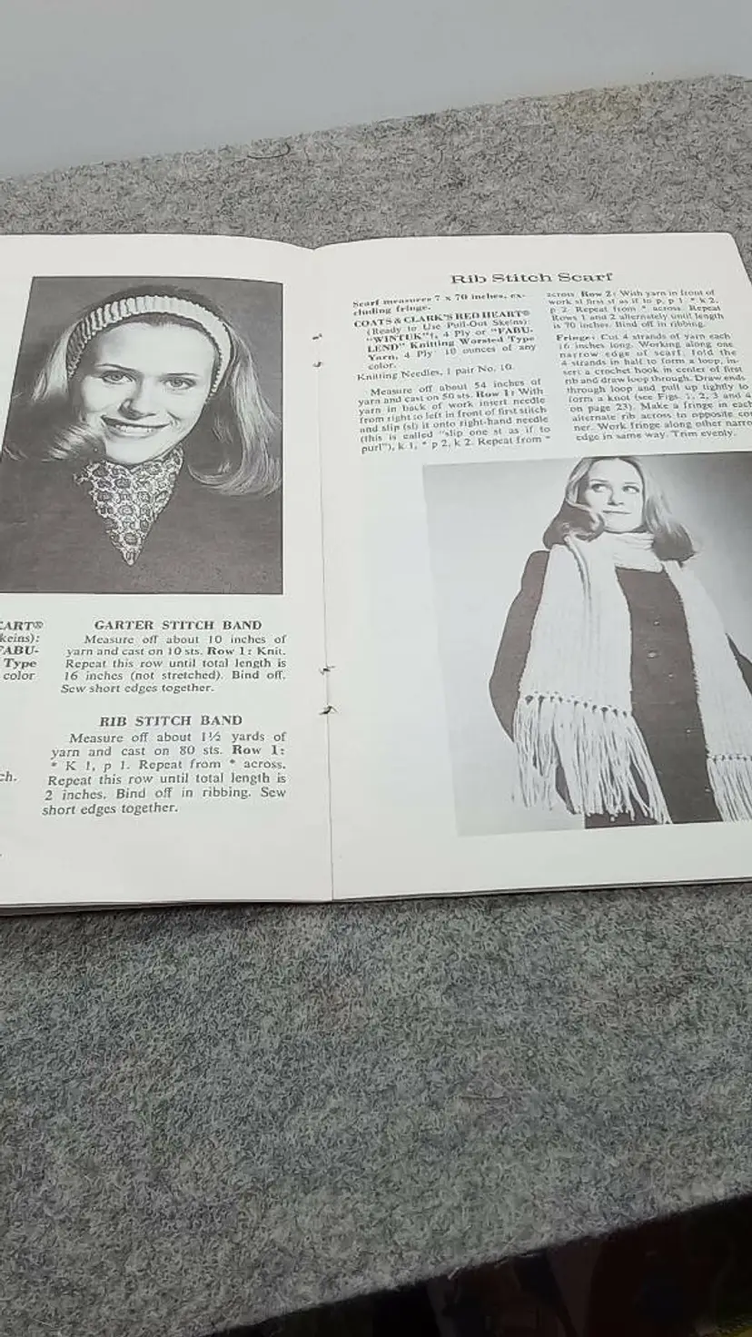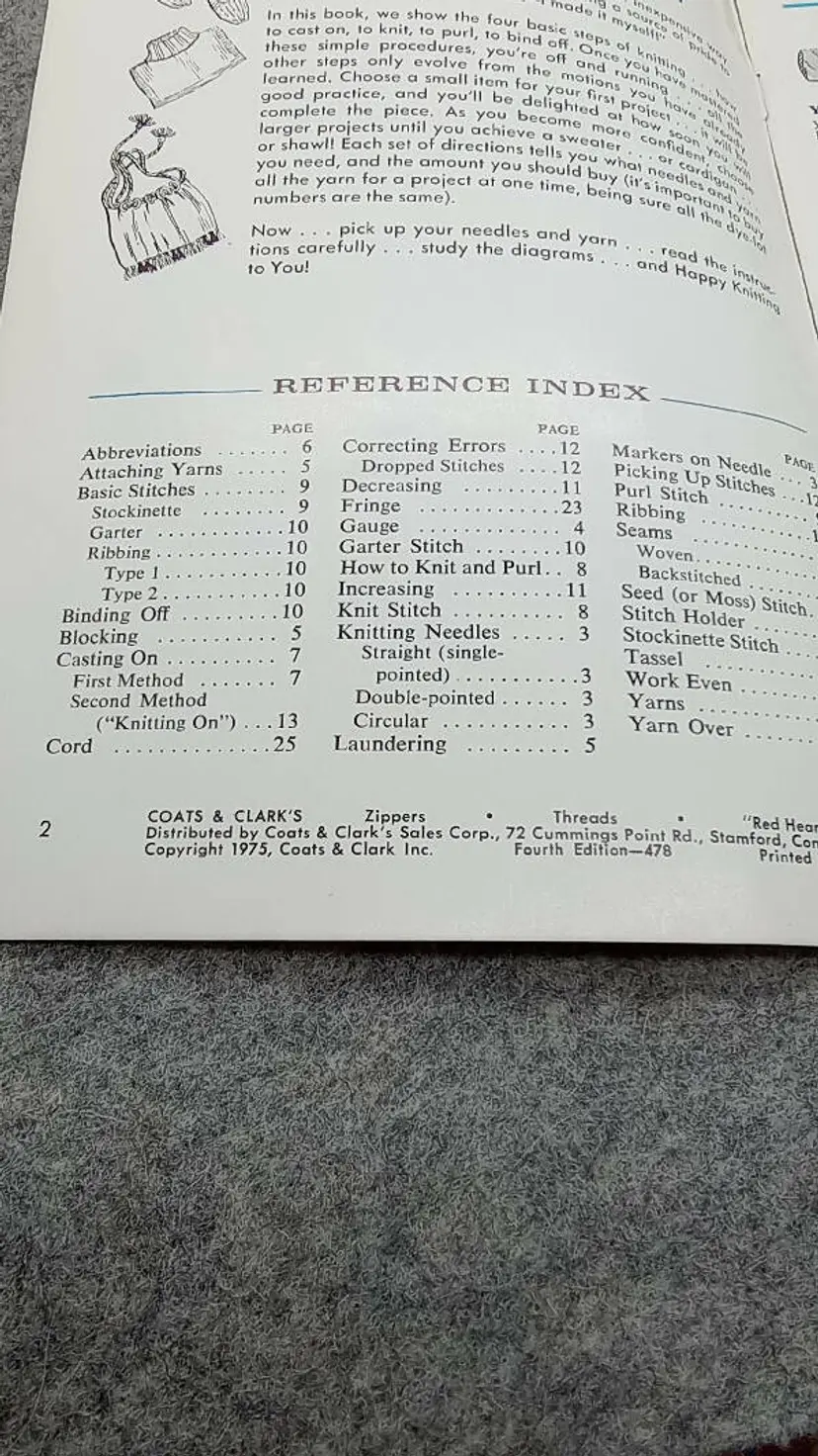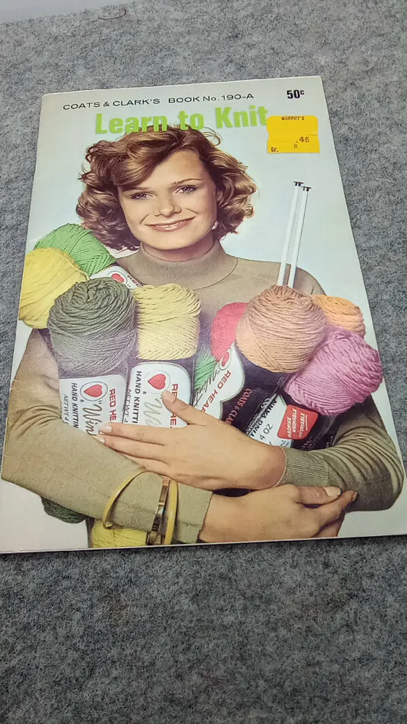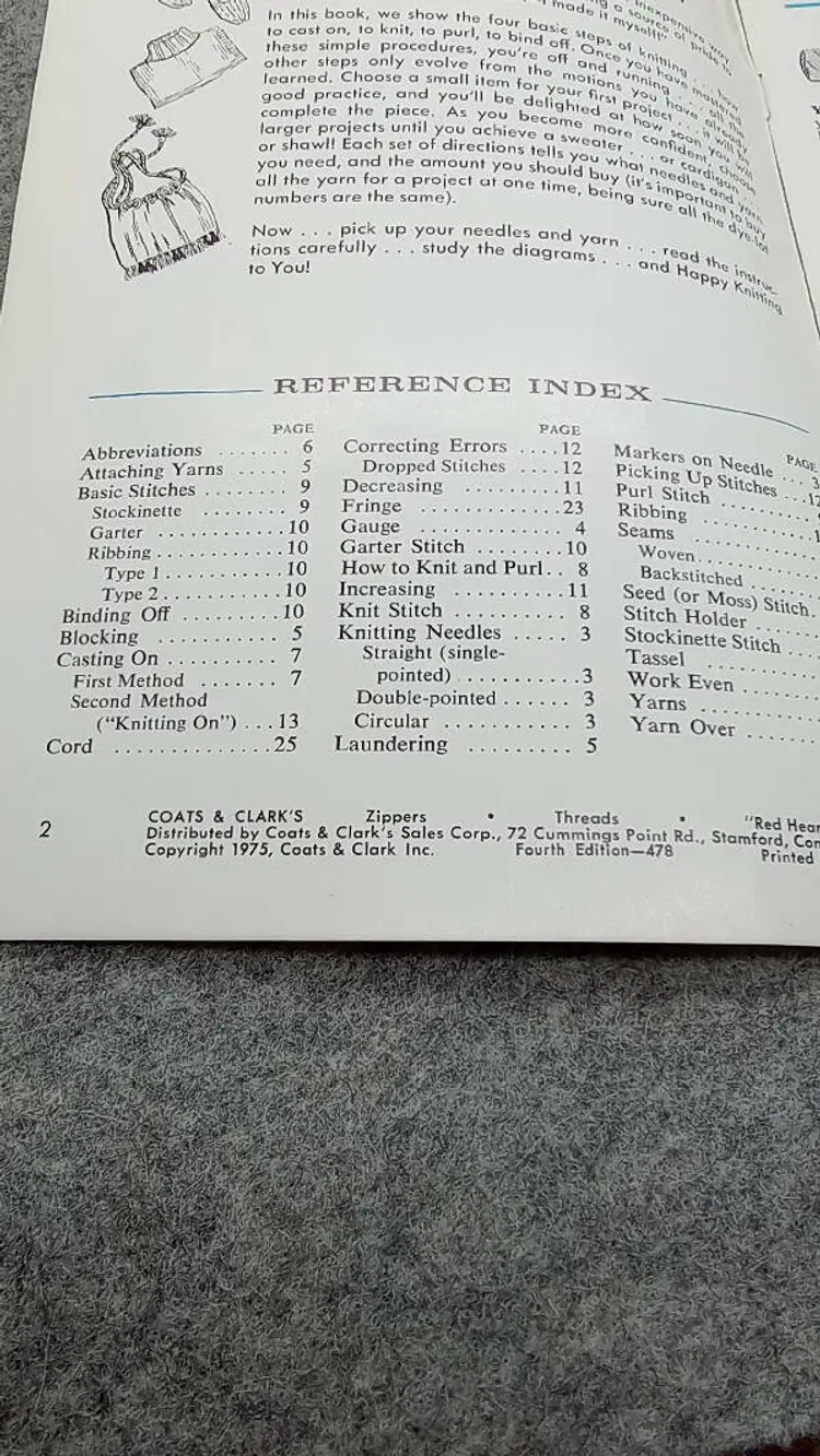 Vintage, Coats & Clarke Learn to Knit, Booklet # 190-A, copywrite 1975. 35 pages. Basic knitting information and patterns for scarf, slippers, purse, men's vest, turtleneck dickey, rib stitch cap, raglan cardigan, shawl and more. Instruction pictures in black & white. ID13990317