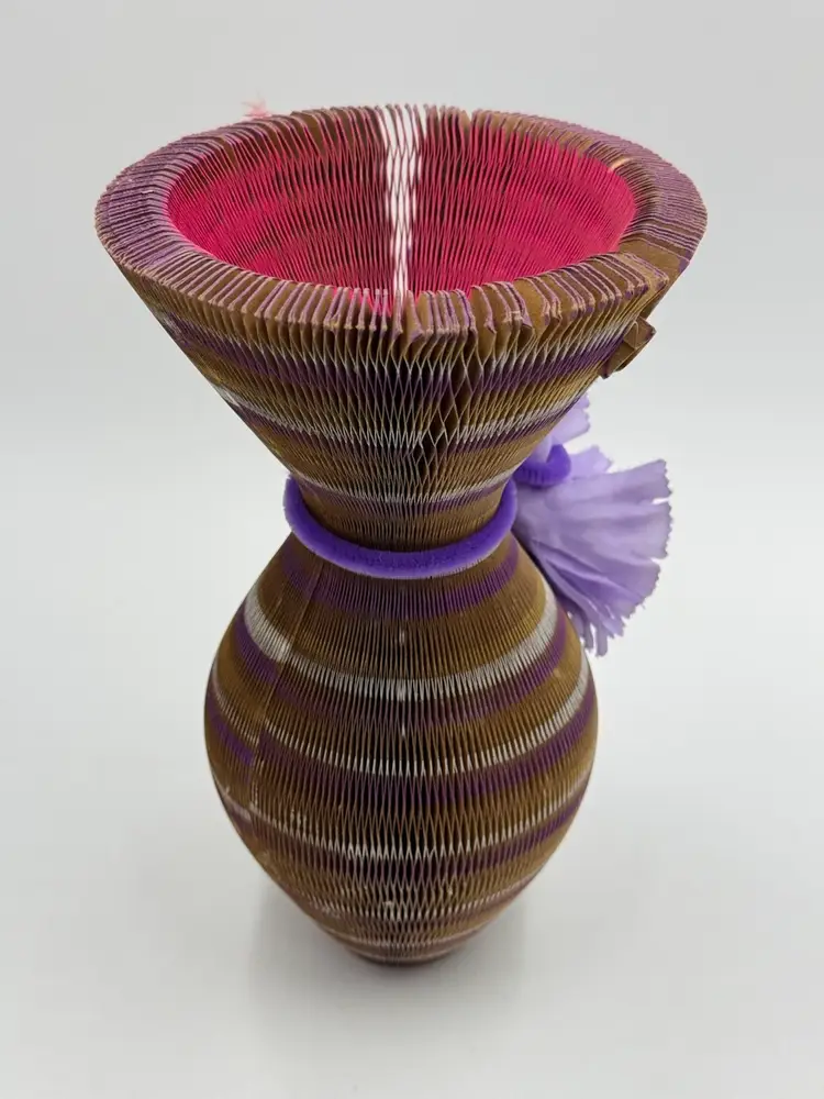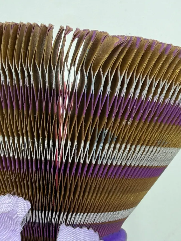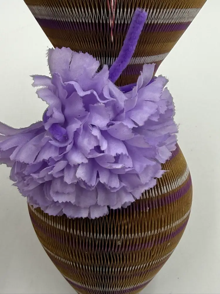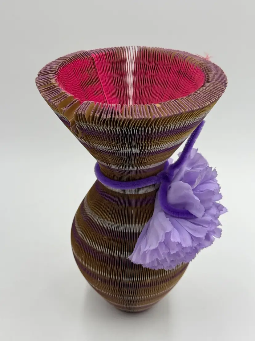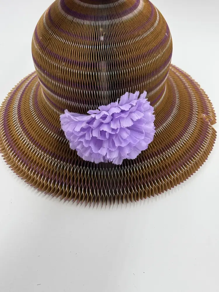 These types of expanding paper vases (also known as "flip-flop" hats) were popular novelty items primarily in the 1960s and 1970s. They were inexpensive, often made in Japan, and sold in stores as fun, foldable decor or as practical items that could be used as either a hat or a vase cover.