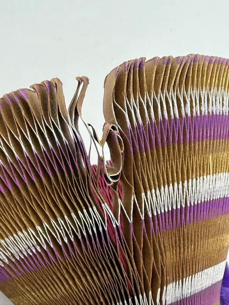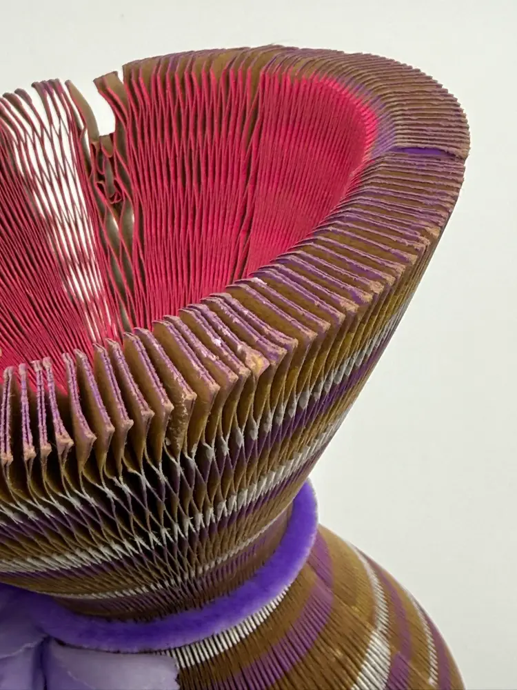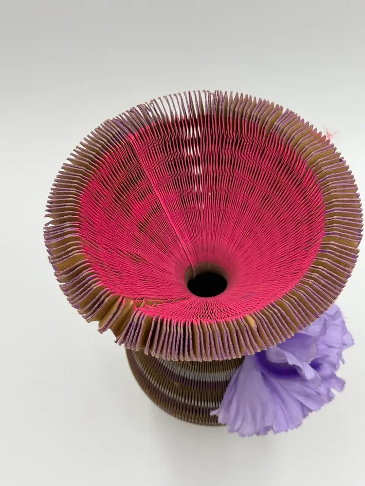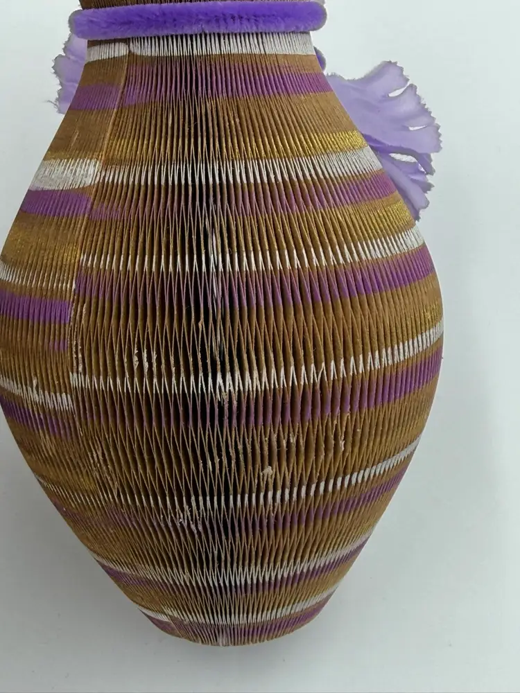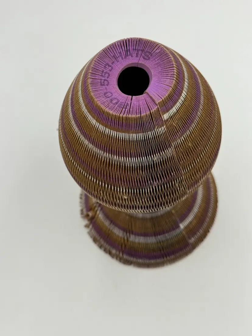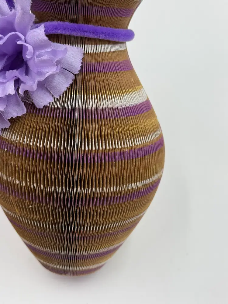These types of expanding paper vases (also known as "flip-flop" hats) were popular novelty items primarily in the 1960s and 1970s. They were inexpensive, often made in Japan, and sold in stores as fun, foldable decor or as practical items that could be used as either a hat or a vase cover.