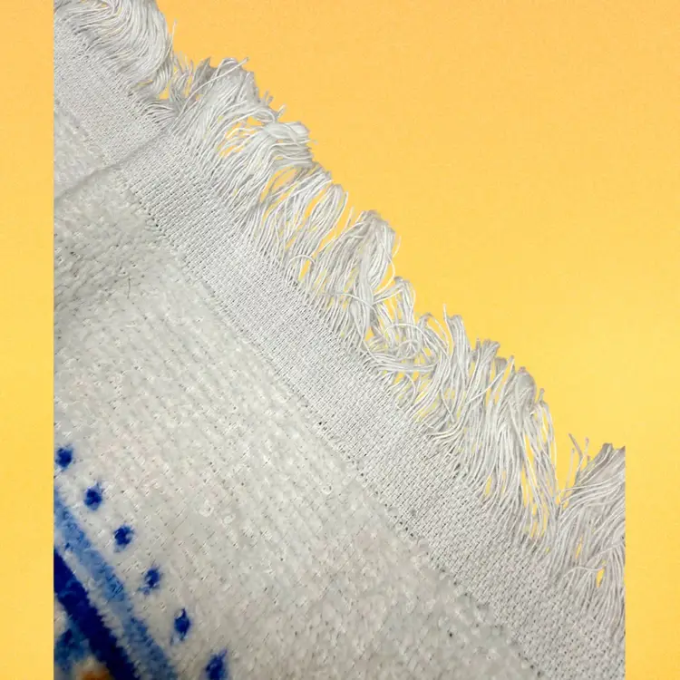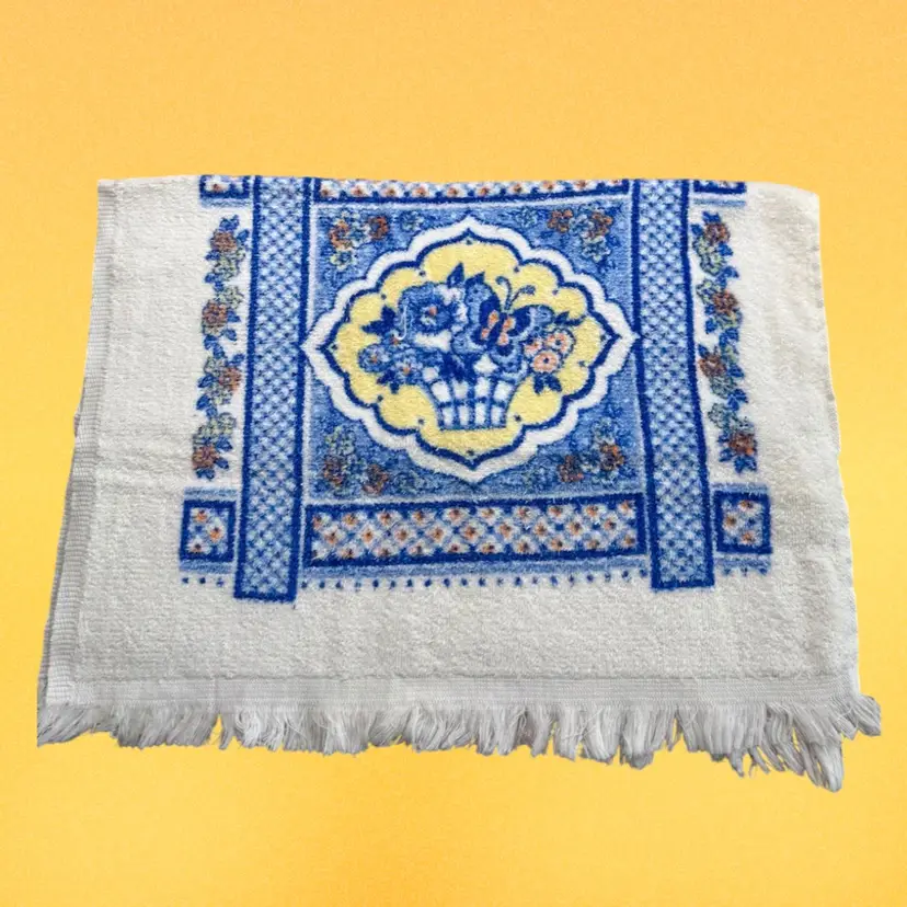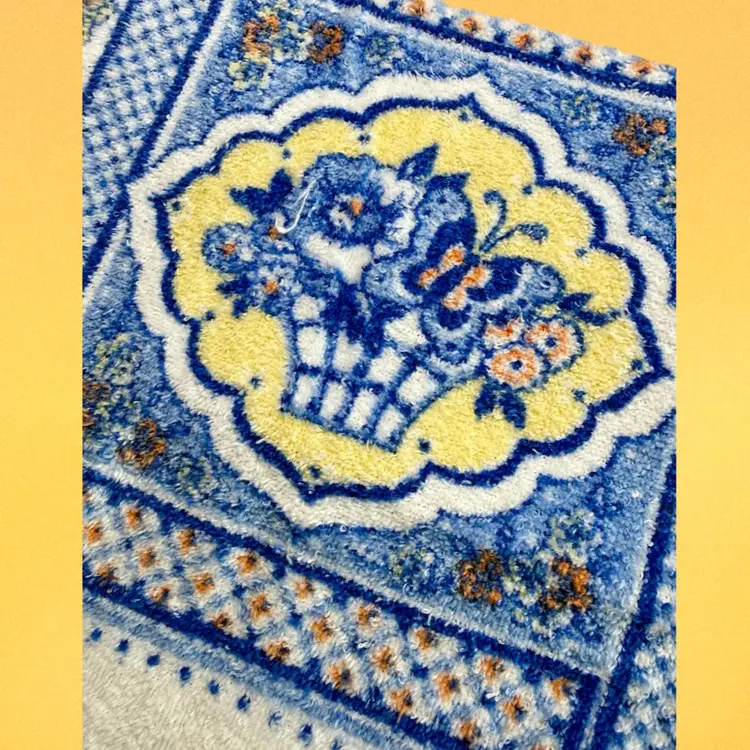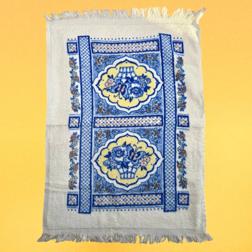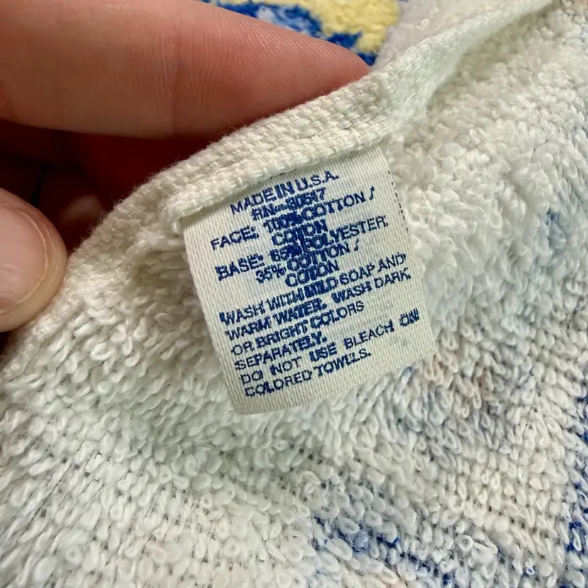 17”x22”. Vintage cotton hand towel with a blue & yellow design, featuring butterflies & a flower basket/arrangement. Edges have fringe. No major issues, rips or stains. Has a tag, but no brand on tag. Design is on one side of towel.