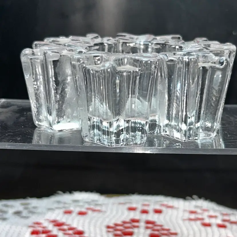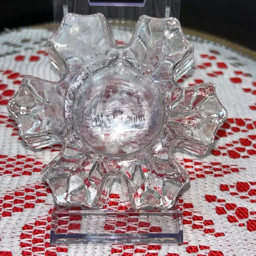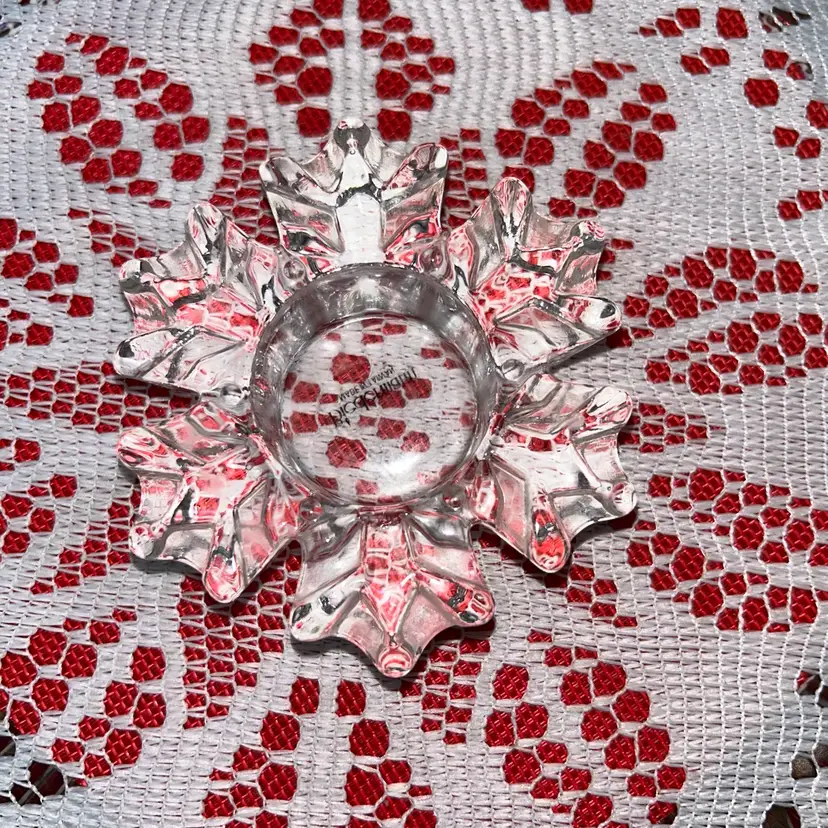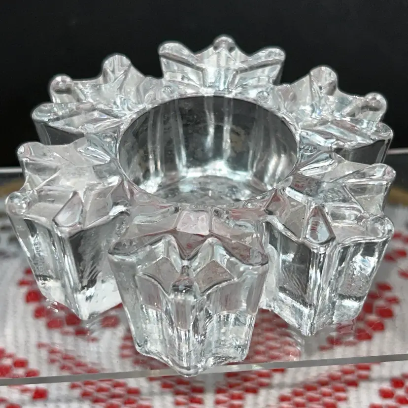Snowflake measures 4” wide, 1.25” tall, and votive opening is 1 1/8” in diameter. New condition with tag.