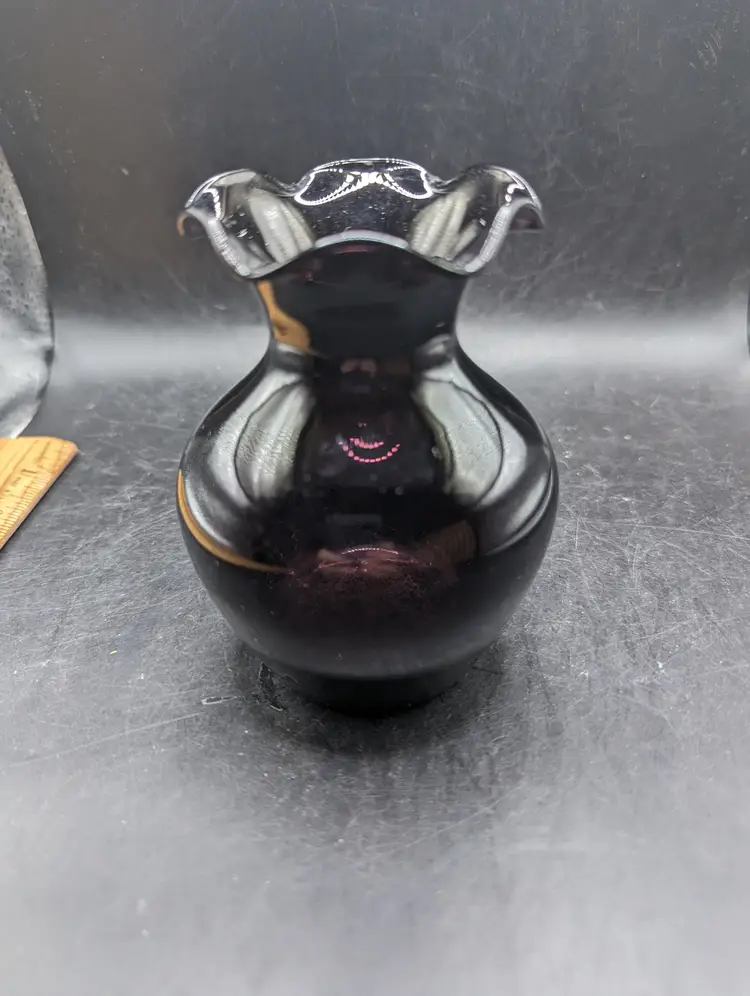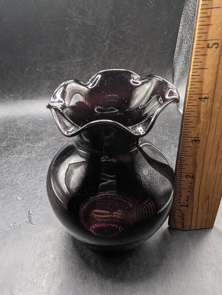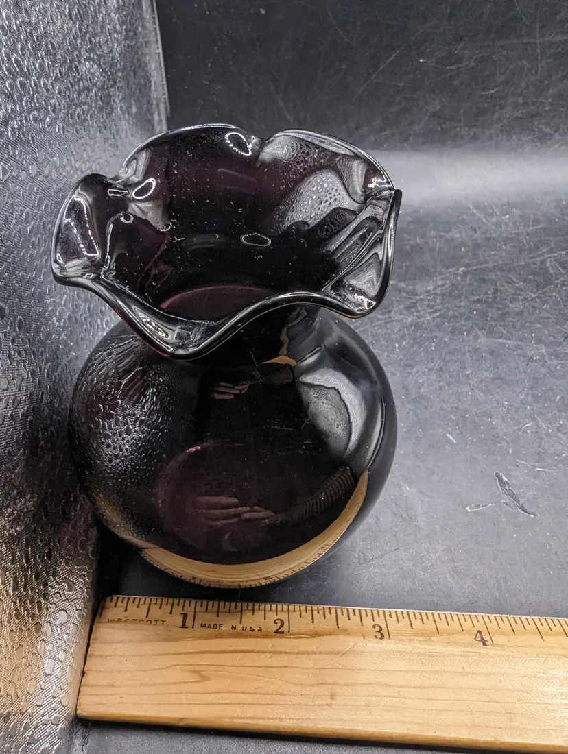 Vintage Dark Amethyst Glass Vase With Ruffles Edge. No chips or cracks. Please see all pictures for condition and measurements.