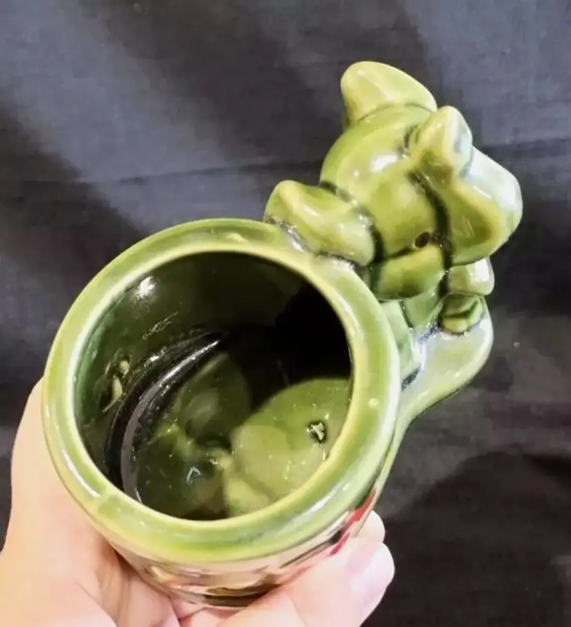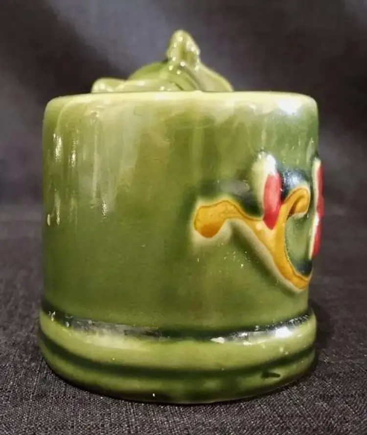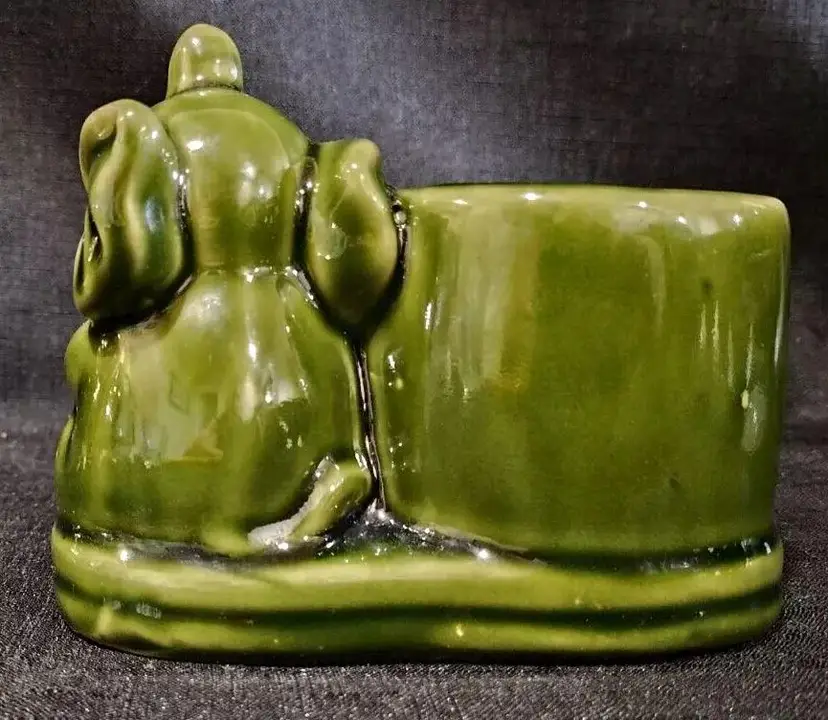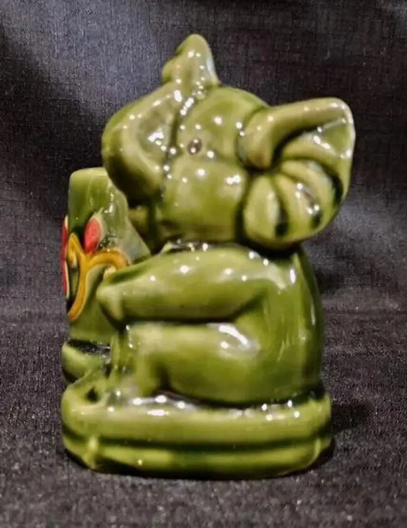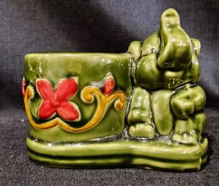 Adorable little ceramic planter with a charming elephant design with a raised trunk and a beautifully contrasting red flower with yellow vine design. Measures 5.25 inches in length, 4 inches in height, and 3.25 inches in width. It is a lovely addition to any collection of decorative collectibles and a great gift for anyone who loves elephants or unique home decor.