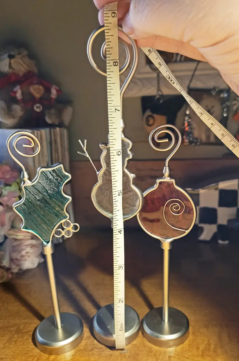 I am unable to confirm if these are glass or not, sorry I've had them for a while. Made in China. As Is: the snowman is missing one of his arms. No chips or cracks, and from a smoke free home. Please refer to the pictures for its condition and size. Approx. 1.75x6.5x1.5 for the holly and ornament holders, and 2x8.75x1.5 for the snaowman.