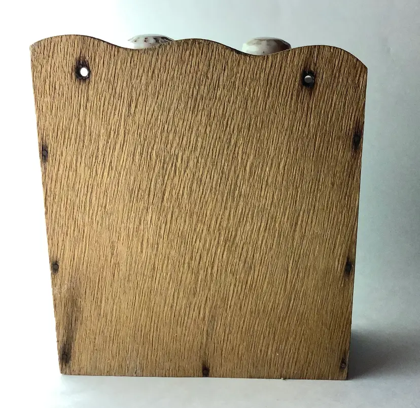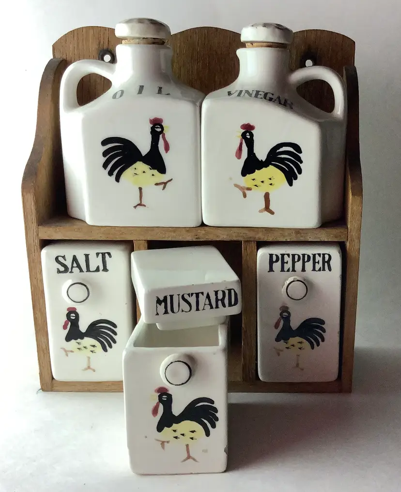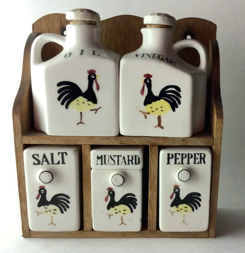 Natural wooden shelf with two holes with grommets. Measures 7” x 6.25” x 2”. Ceramic Oil/ Vinegar Jars 3.75” x 2.75” with stoppers. Salt and Pepper Jars 2.75” x 1.5”. Mustard Jar 2 piece 2.75” x 1.5”. Very nice condition. Thanks for looking! I ship UPS 3 day when possible. Bubble wrapping very carefully for safe transit. ❤️👍🏼😎💥