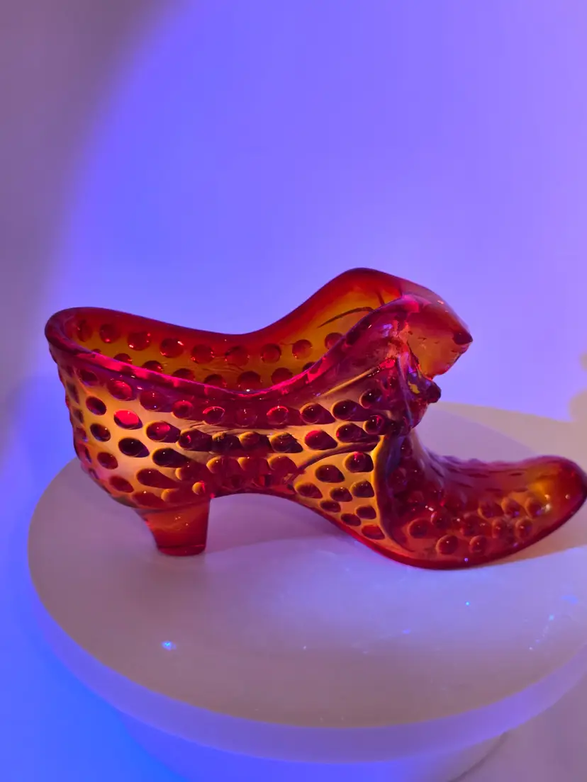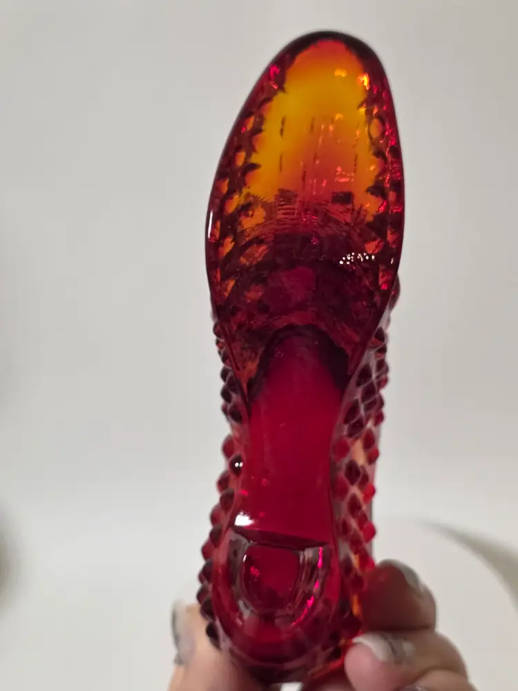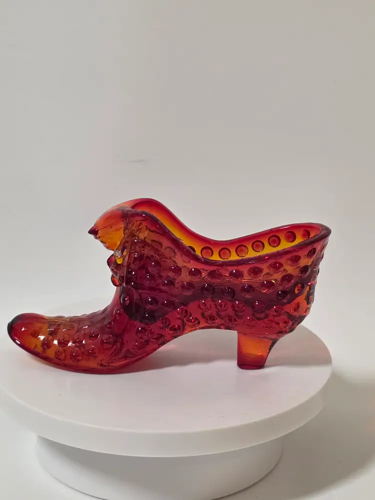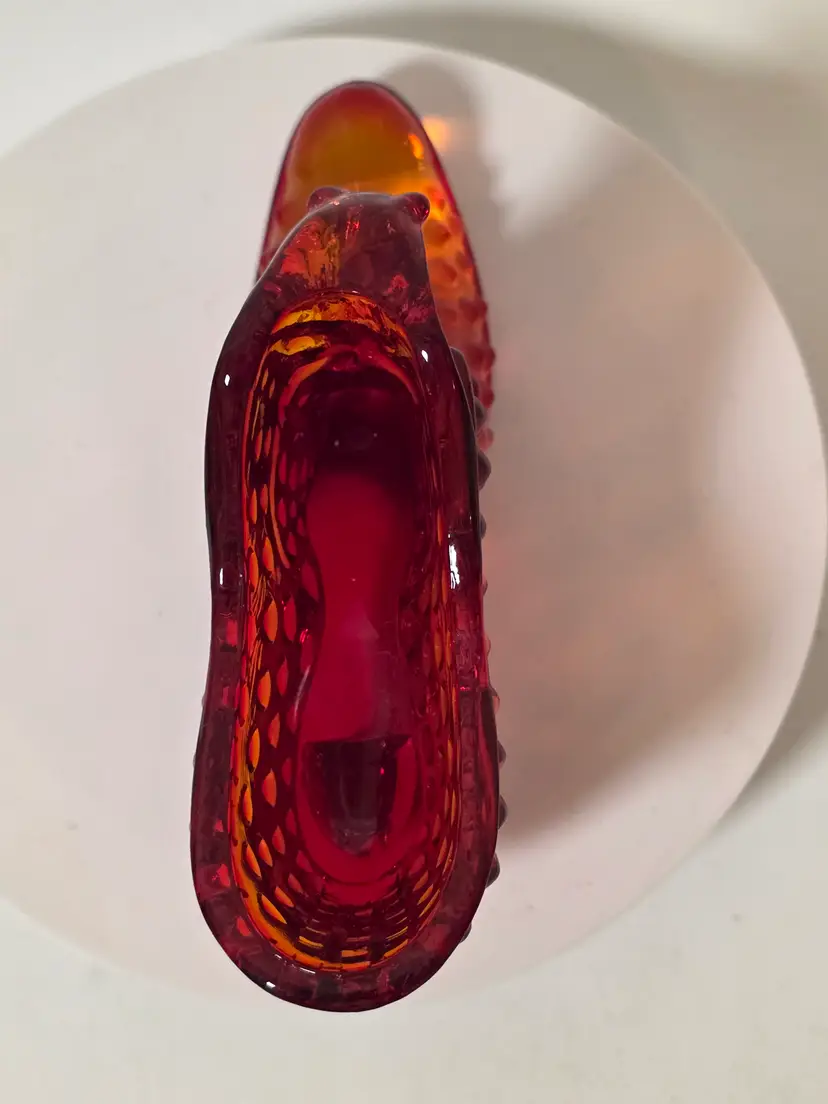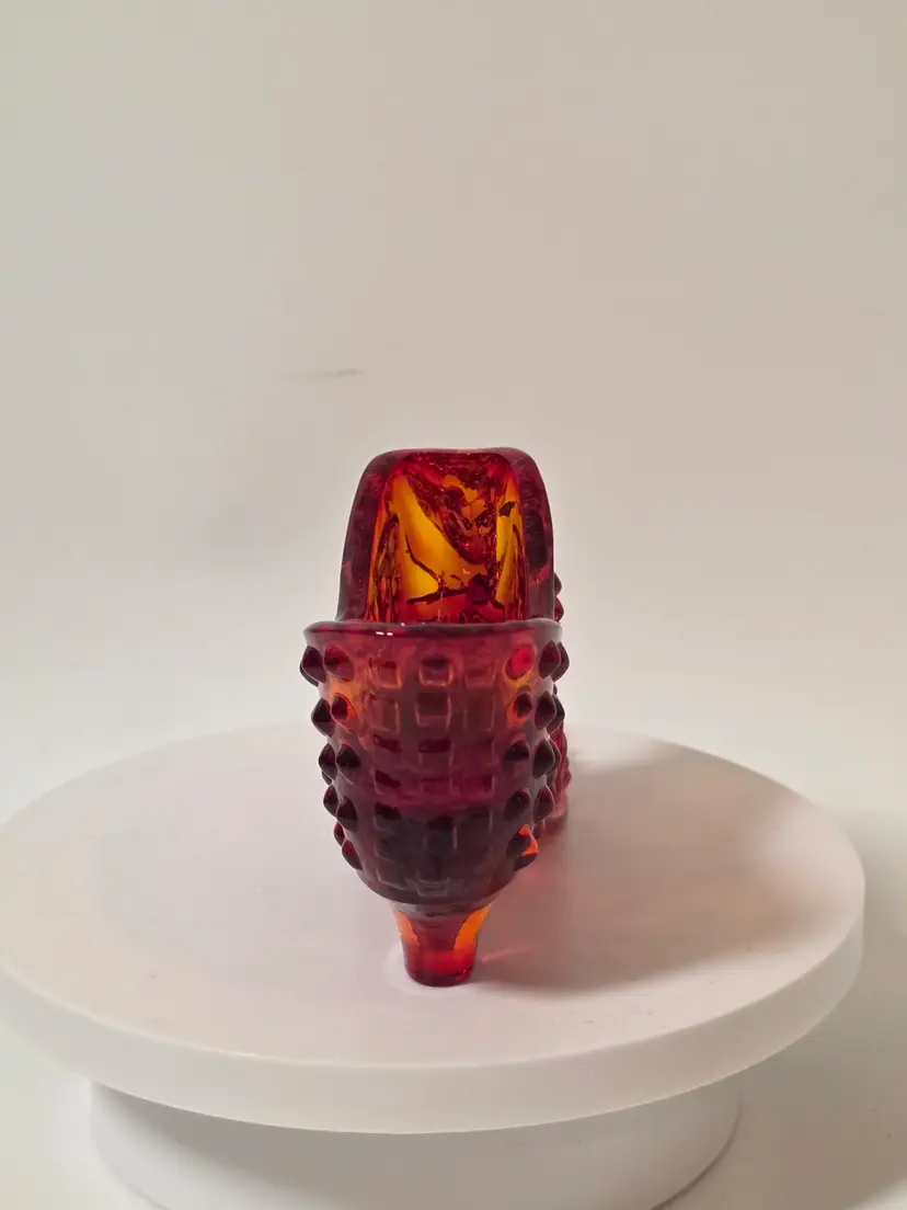 The product is a vintage Fenton Amberina red orange hobnail cat head shoe figurine, made of glass in North America. It features a decorative 3D effect with a color-changing finish, a high gloss texture, and is part of the Fenton brand's art glass production style. This collectible piece showcases an all-over pattern with a glossy finish, perfect for adding a touch of nostalgia and elegance to any decor.