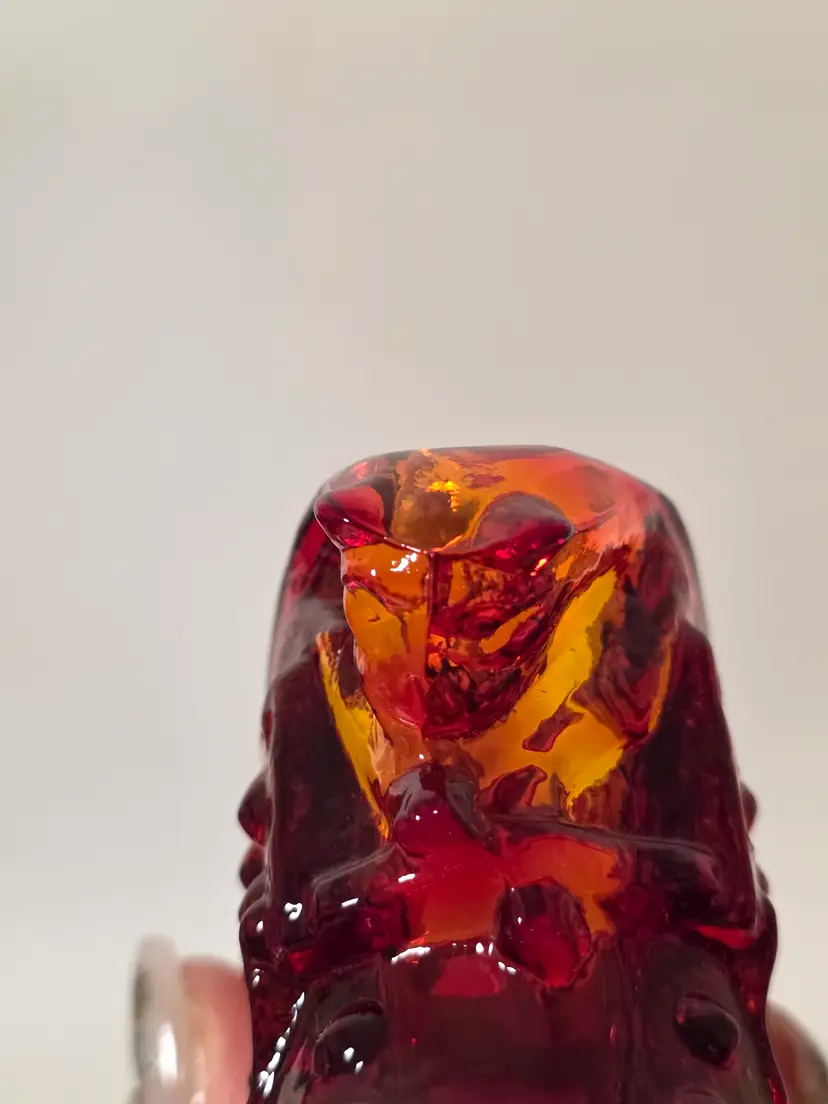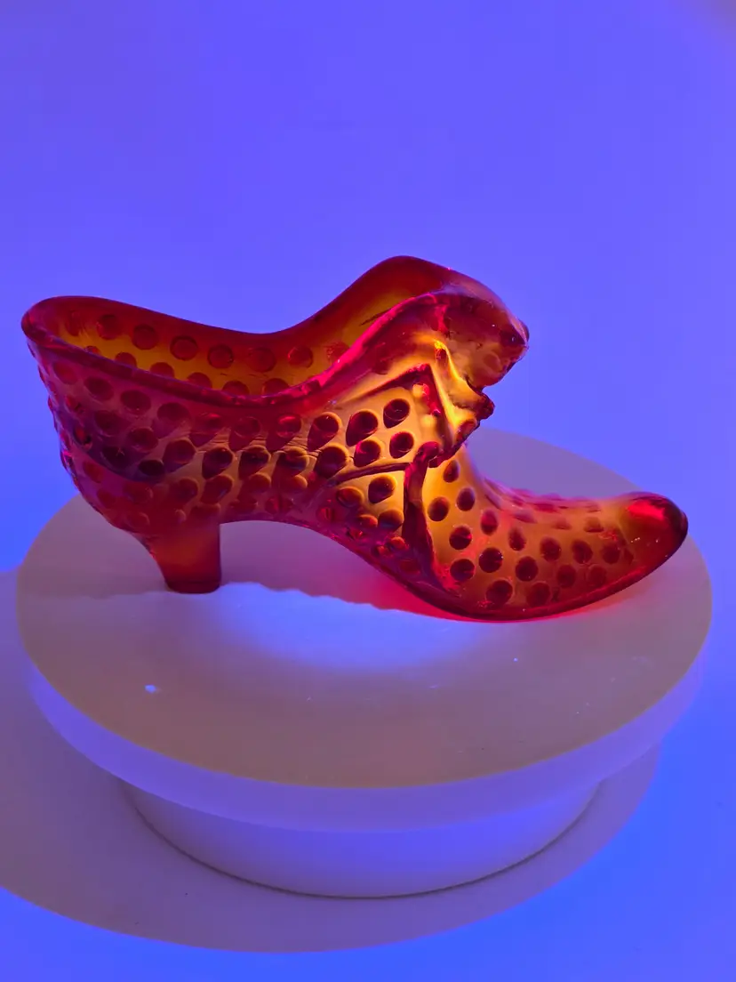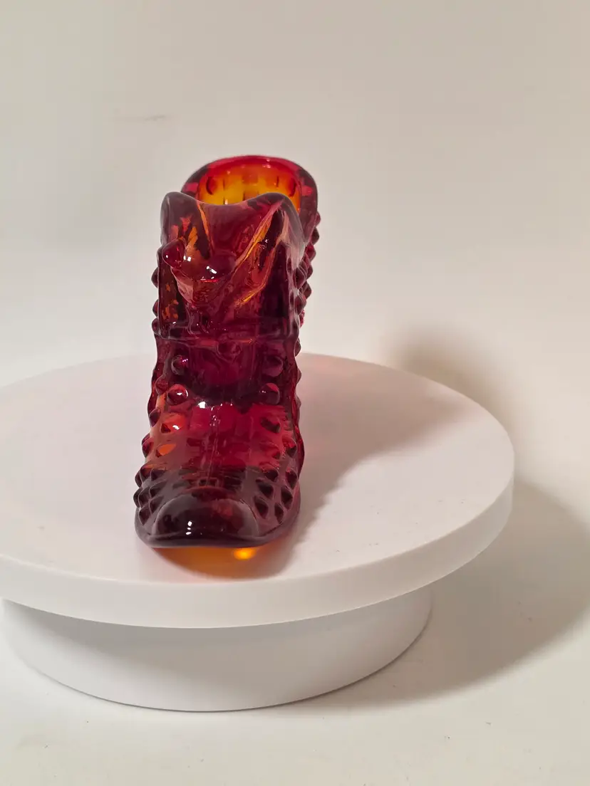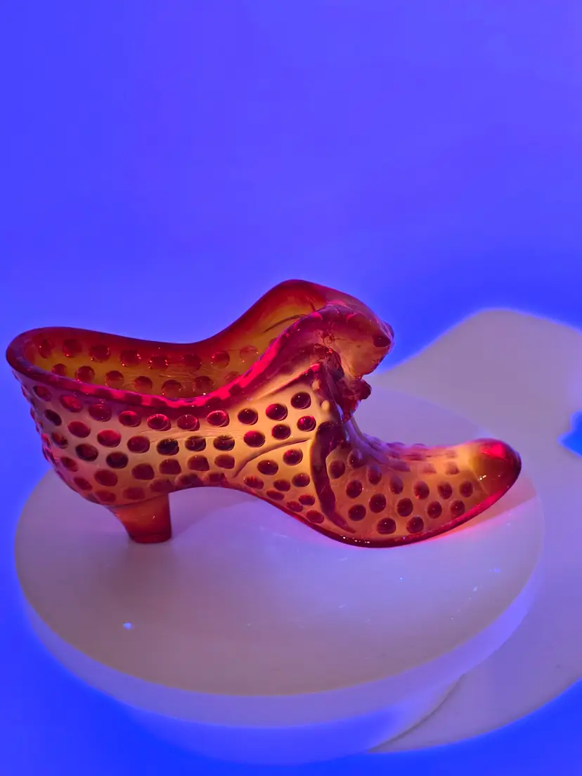 The product is a vintage Fenton Amberina red orange hobnail cat head shoe figurine, made of glass in North America. It features a decorative 3D effect with a color-changing finish, a high gloss texture, and is part of the Fenton brand's art glass production style. This collectible piece showcases an all-over pattern with a glossy finish, perfect for adding a touch of nostalgia and elegance to any decor.