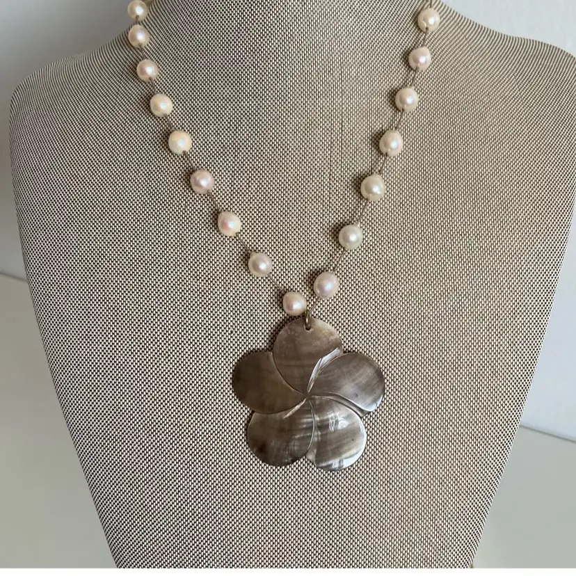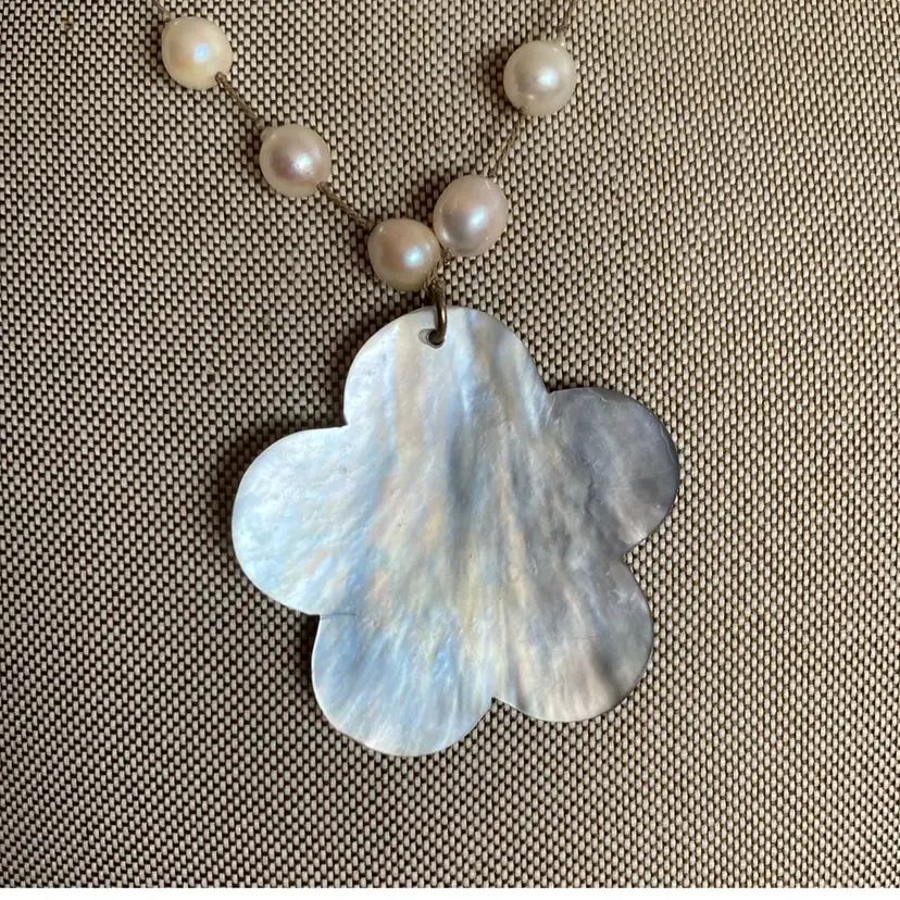 Vintage pearl knotted necklace with carved mother of pearl flower pendant. Necklace length is 17”. Pendant measures 2” x 2”.
