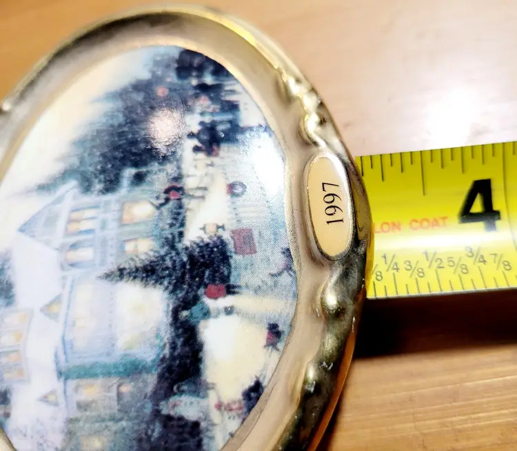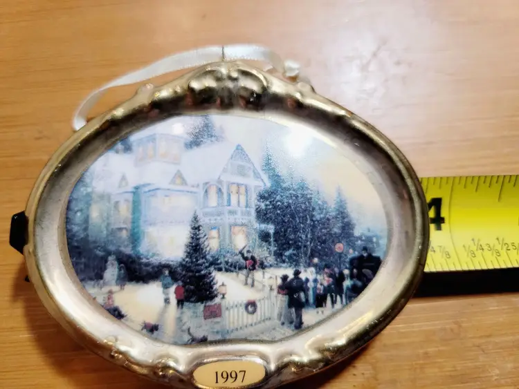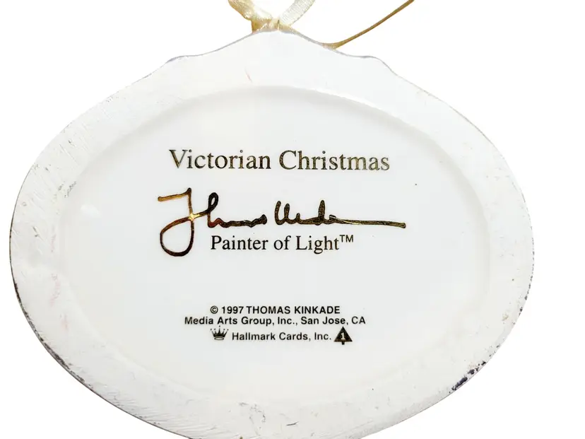 • Features a Victorian Christmas scene by Thomas Kinkade • Gold-tone ceramic oval frame with ribbon for hanging • Marked and dated 1997 on both sides • Measures approximately 4 inches • Original Hallmark craftsmanship 3.75" wide, 3" tall No cracks or chips