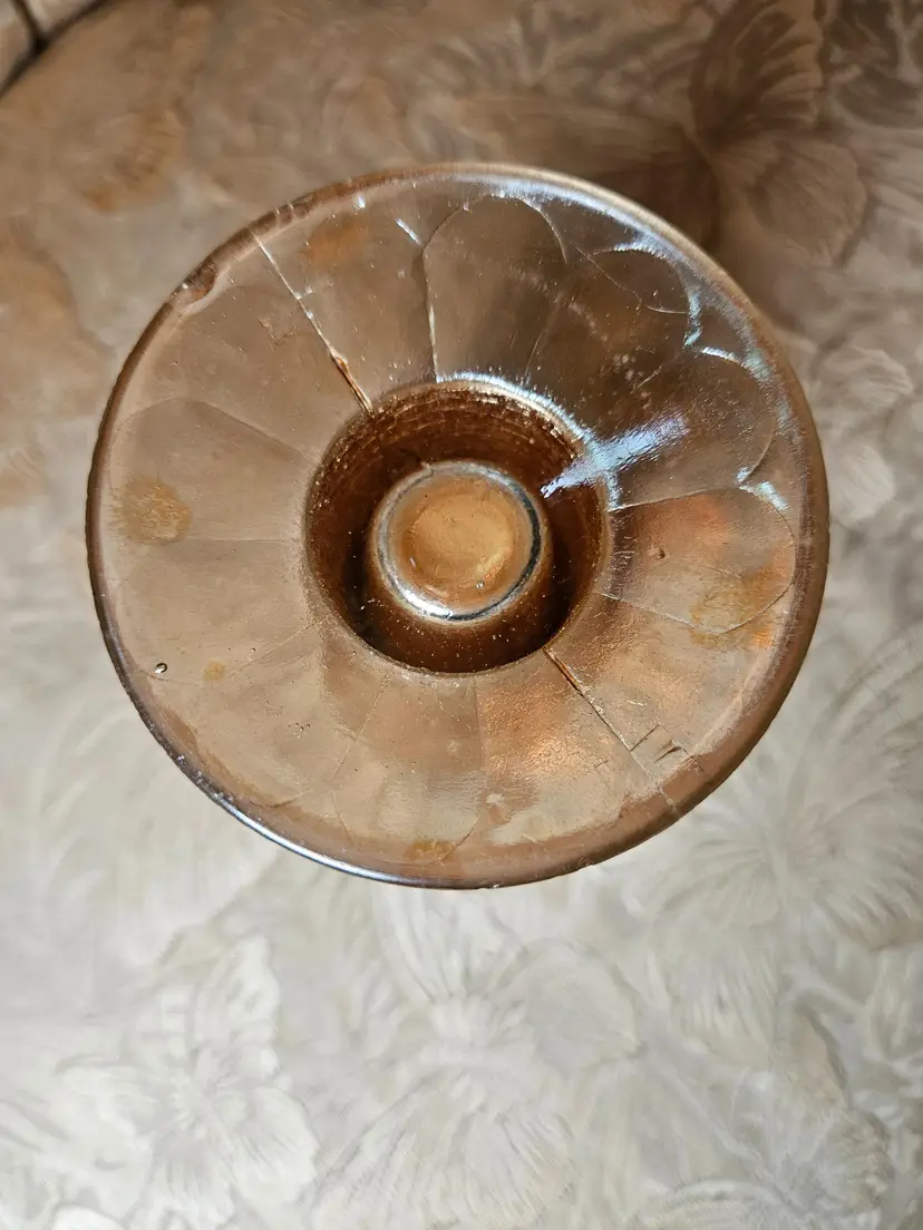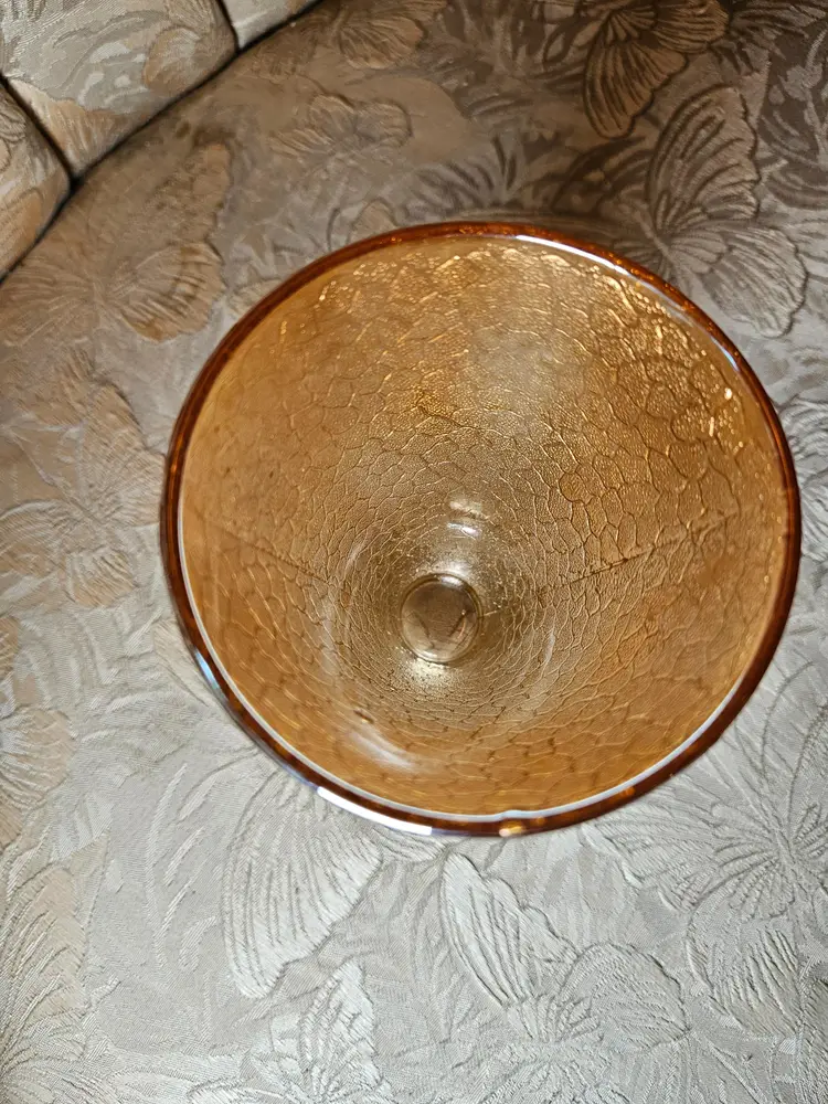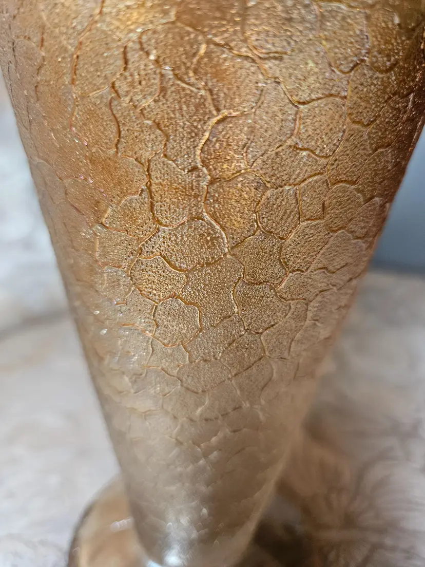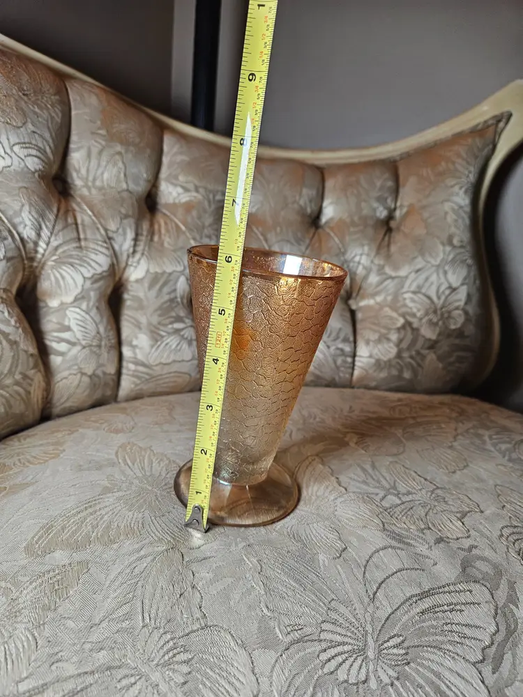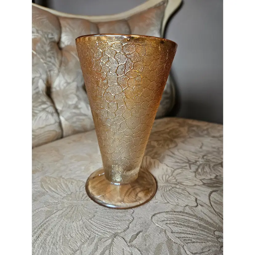 Elegant vintage marigold crackle glass vase or tumbler glass. This piece has a beautiful textured design and is in excellent condition with no chips or cracks. Perfect for adding a touch of vintage charm to any room.