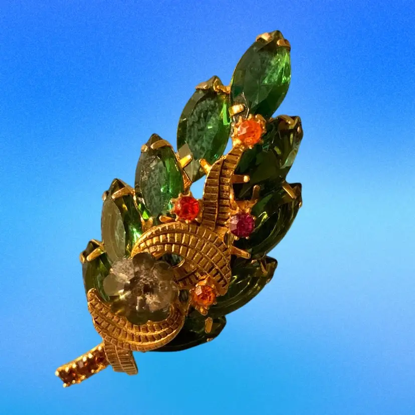 Vintage Leaf Shape Brooch With Prong Set Green Marquis Gold Tone Ribbon , Pink Rhinestones And Red Rhinestones For The Stem