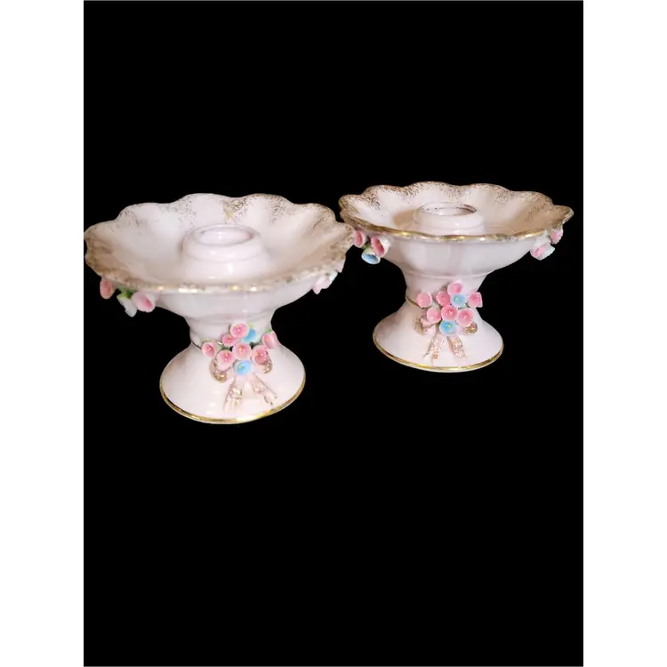 Vintage Lefton China Hand Painted, Raised Florals Set Of 2 , 3x4.5"