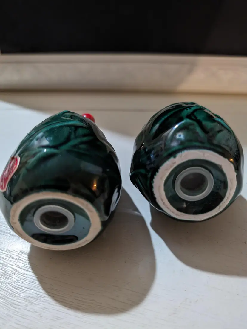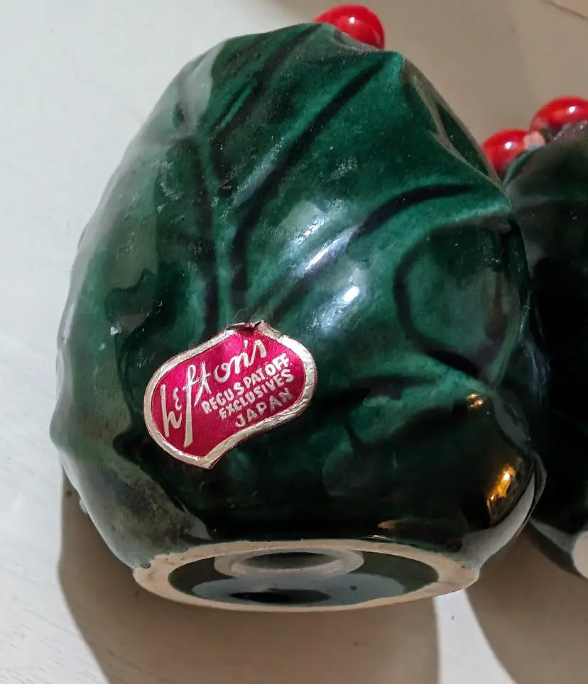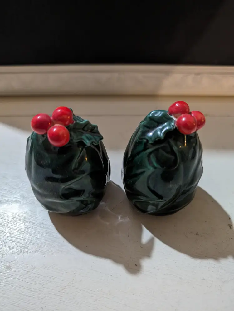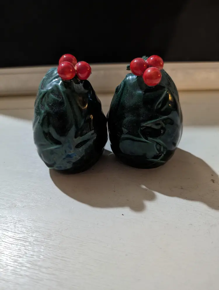 Very nice looking set of Lefton Holly Berries salt and pepper shakers. Piece's are Used but in Amazing condition with no cracks or chips. Color is green with red berries and are approximately 3.5 inches height with a 2 inch width and weights less than a lb together and 1 piece has original markers sticker. Perfect for your holiday season collection.
