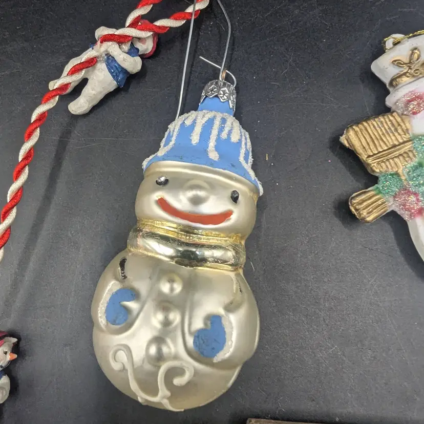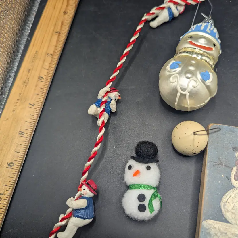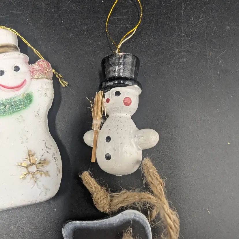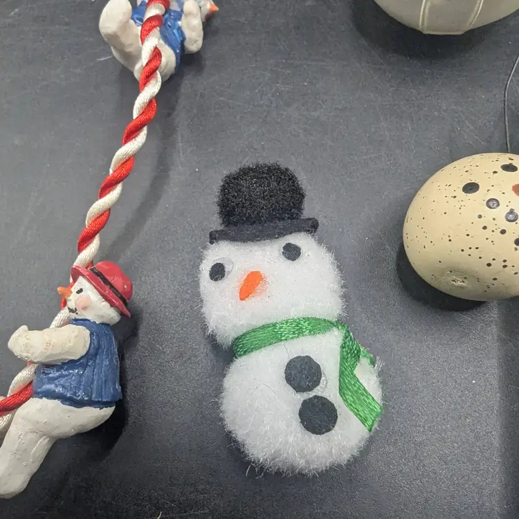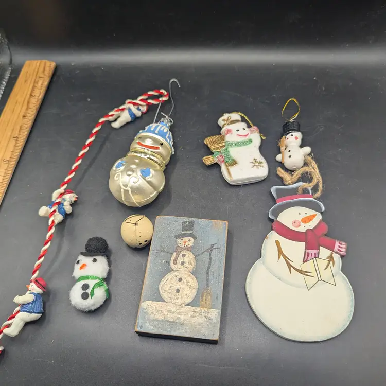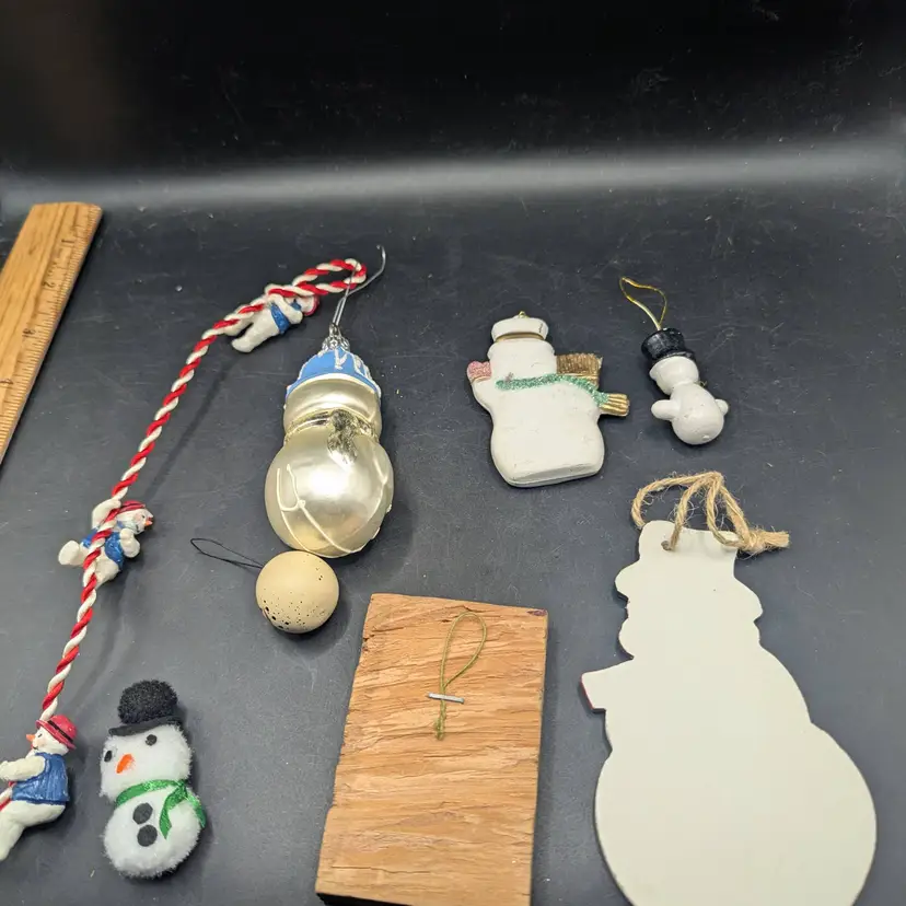 This is a fantastic Vintage Lot Of 7 Snowman Ornaments Various Materials. Please see all pictures for condition and measurements.