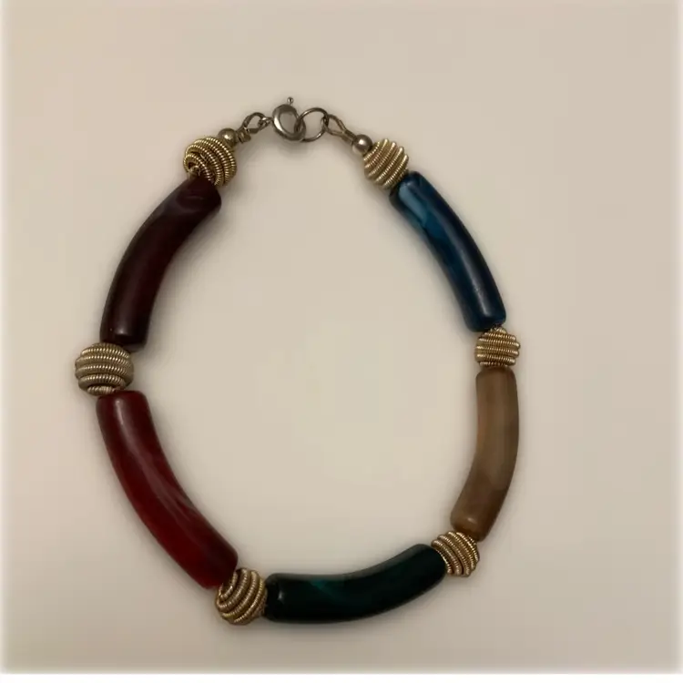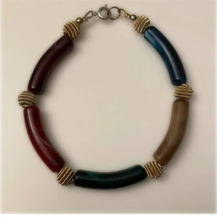 Vintage Lucite or Acrylic beaded bracelet. The spacer beads are a gold coiled metal. Length is 9”. This is an upcycled design using vintage beads and findings.