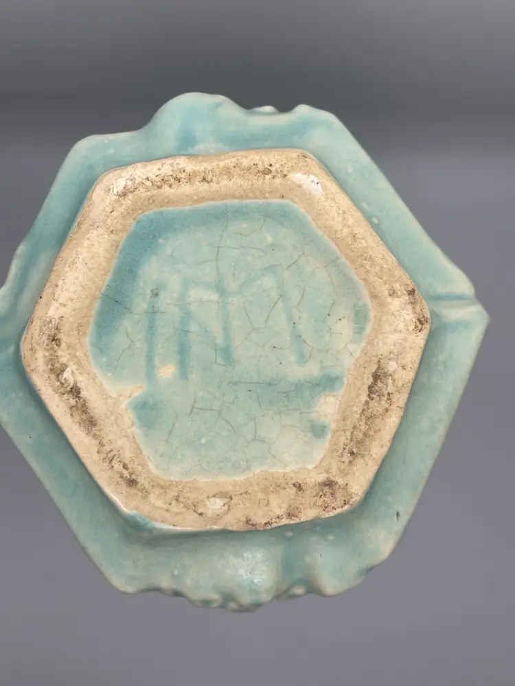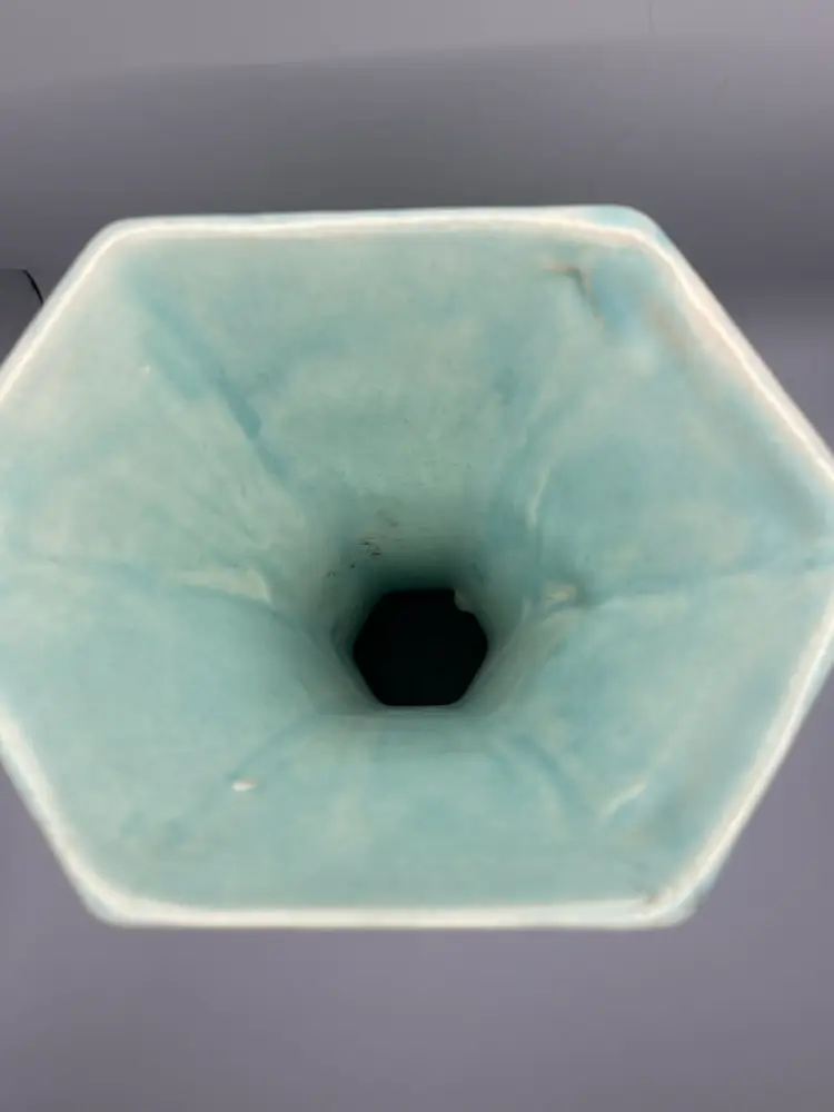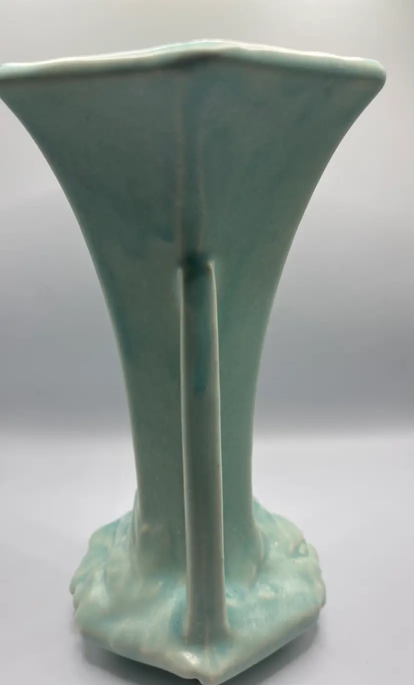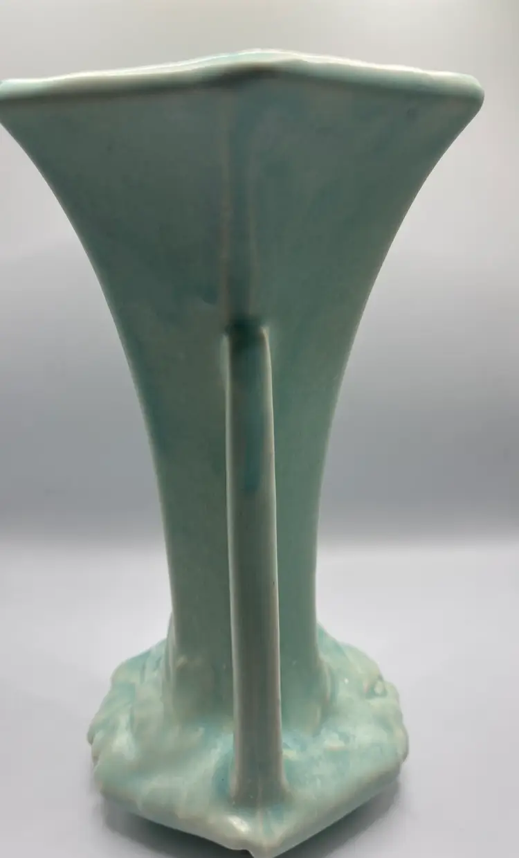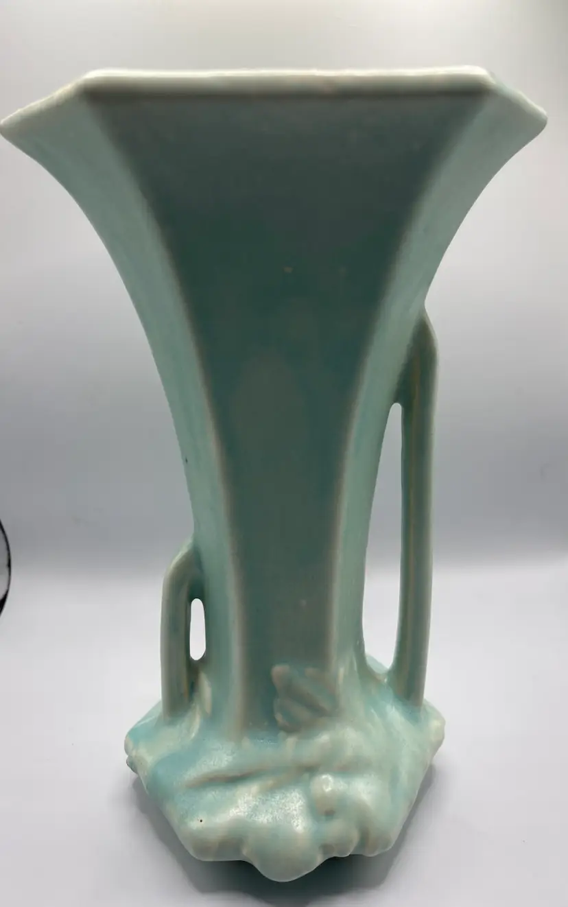 The Vintage McCoy LM Blue Turquoise Art Deco Double Handled Vase is a beautifully crafted ceramic piece with a striking blue color and Art Deco design. Made in the Americas in the early 20th century, this vase features a unique double handled design, standing at 8 inches tall with a glossy finish. The intricate leaf pattern and Art Deco style make it a standout decorative piece for any home, showcasing the craftsmanship and design of the era. Handmade and bearing the McCoy brand, this original vase is a true collectible item for pottery and glass enthusiasts.