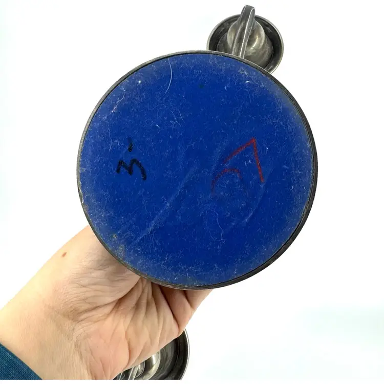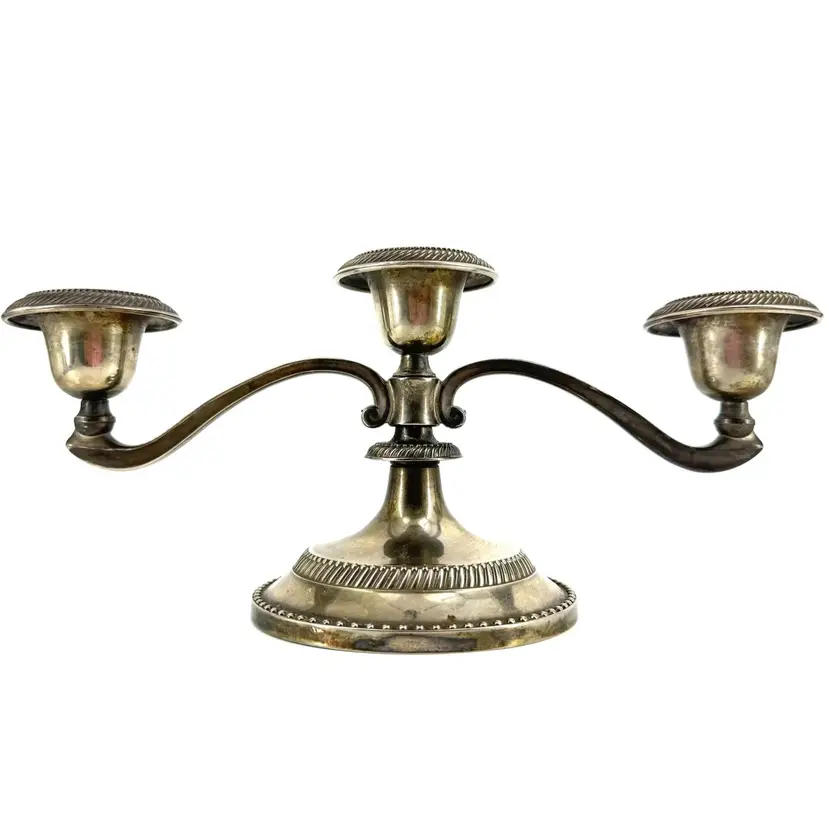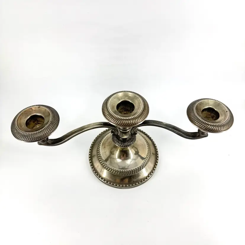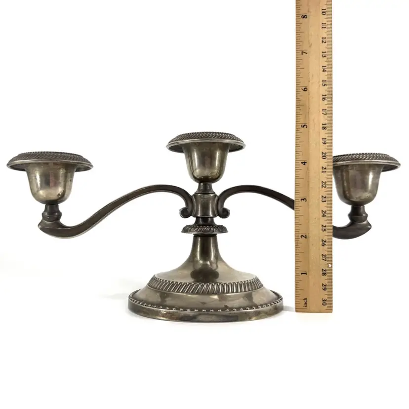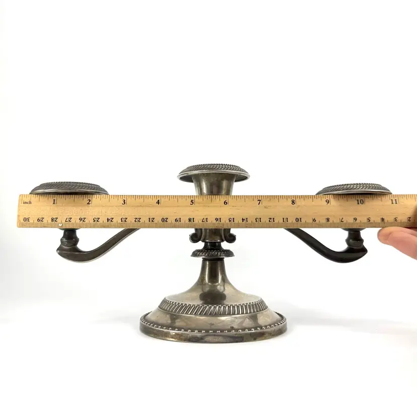 This vintage candle holder is made of a metal and features three candle holders with detailing in the metal. There are no chips or cracks, but some tarnish on the metal. No signatures or markings. Has blue felt padding on the bottom. Candle holder measures approximately 5” tall and 11” long.