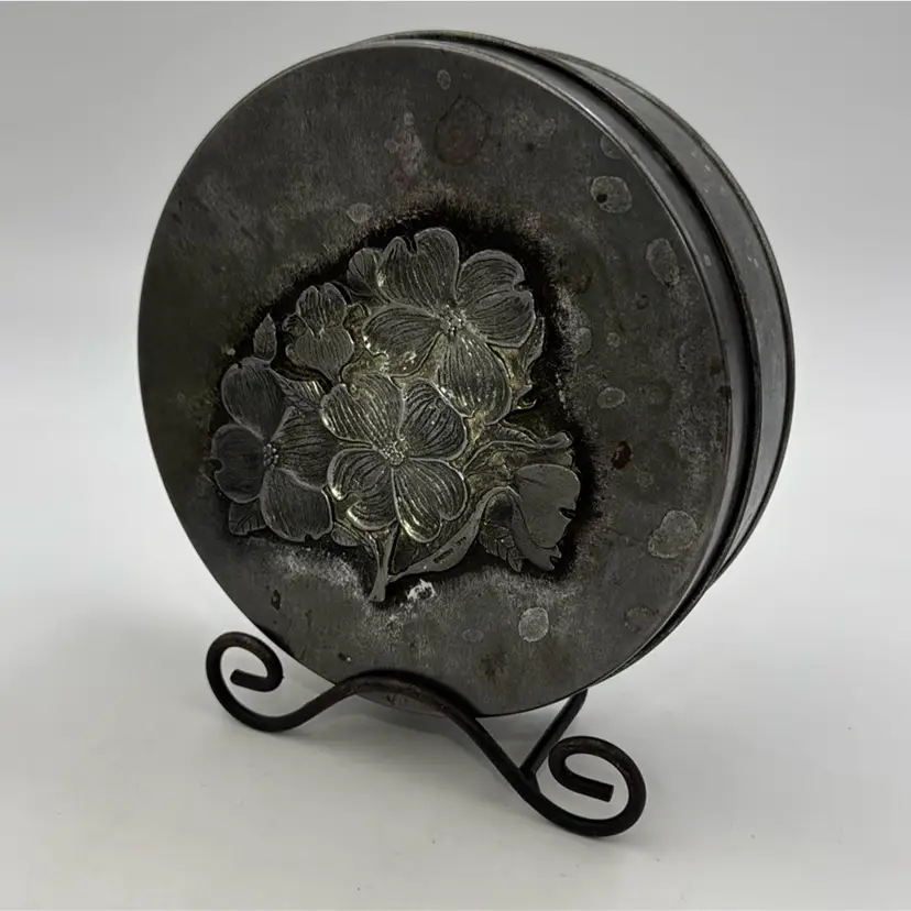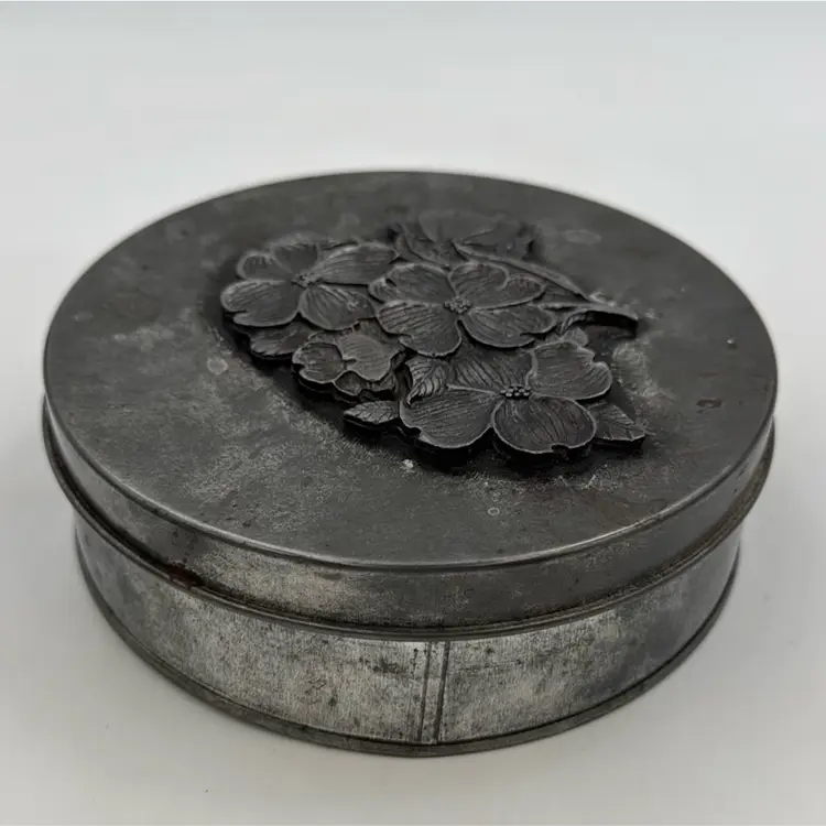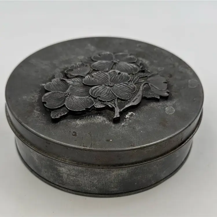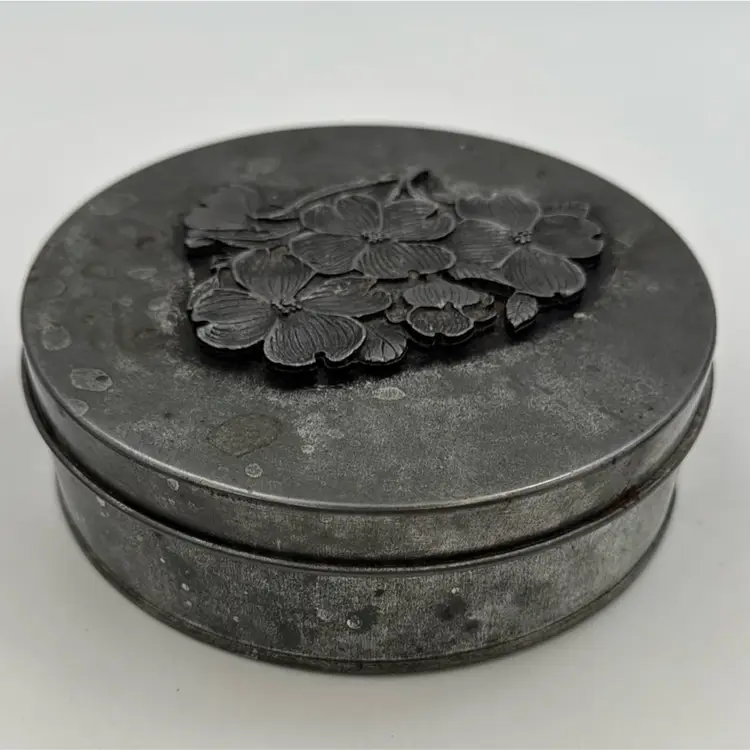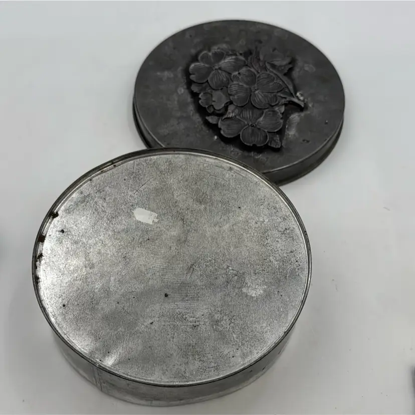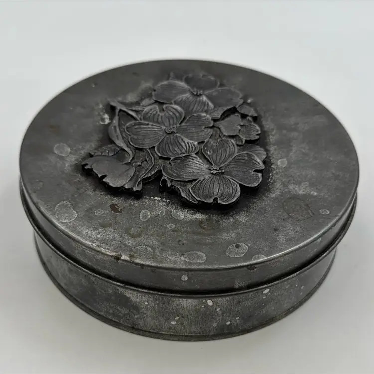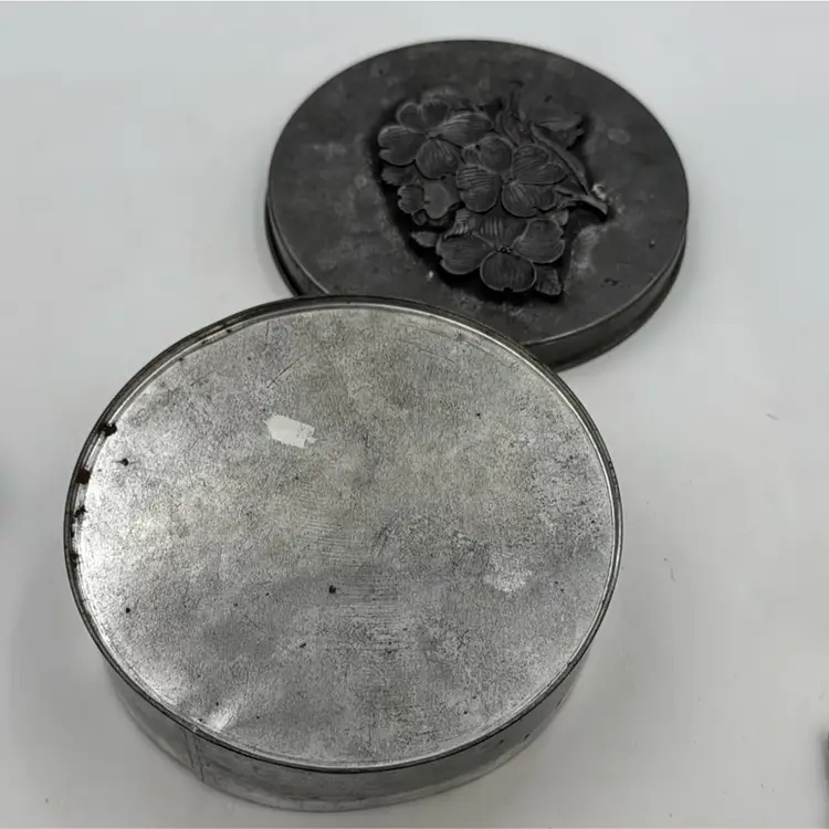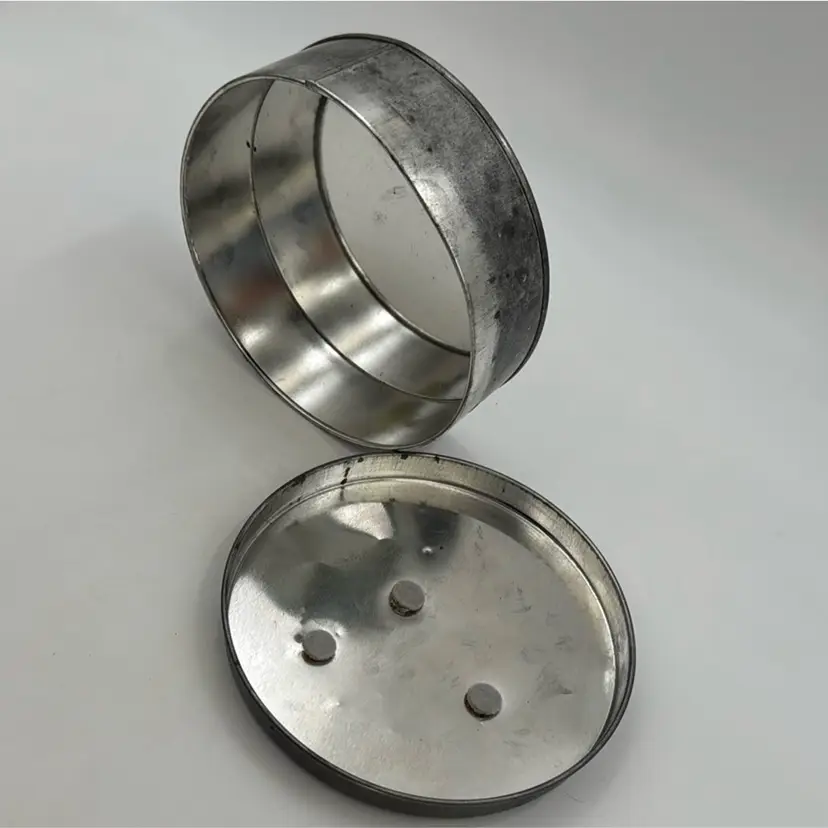 5”Round in nice condition for its vintage age. It does have three pads over the rivets inside the lid. That’s how I purchased it.