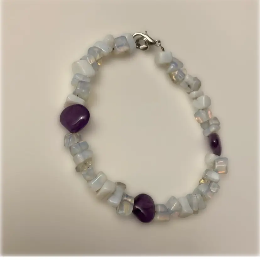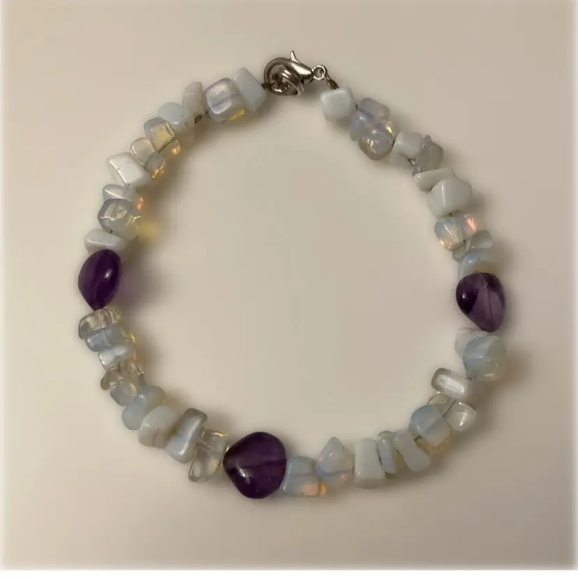 Vintage Opalite and Amethyst beaded bracelet. The bracelet measures 8” long. This is an upcycled design design using vintage beads and findings.