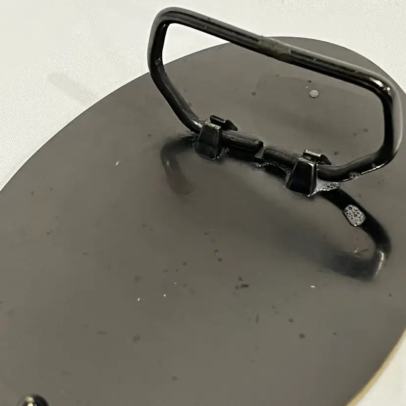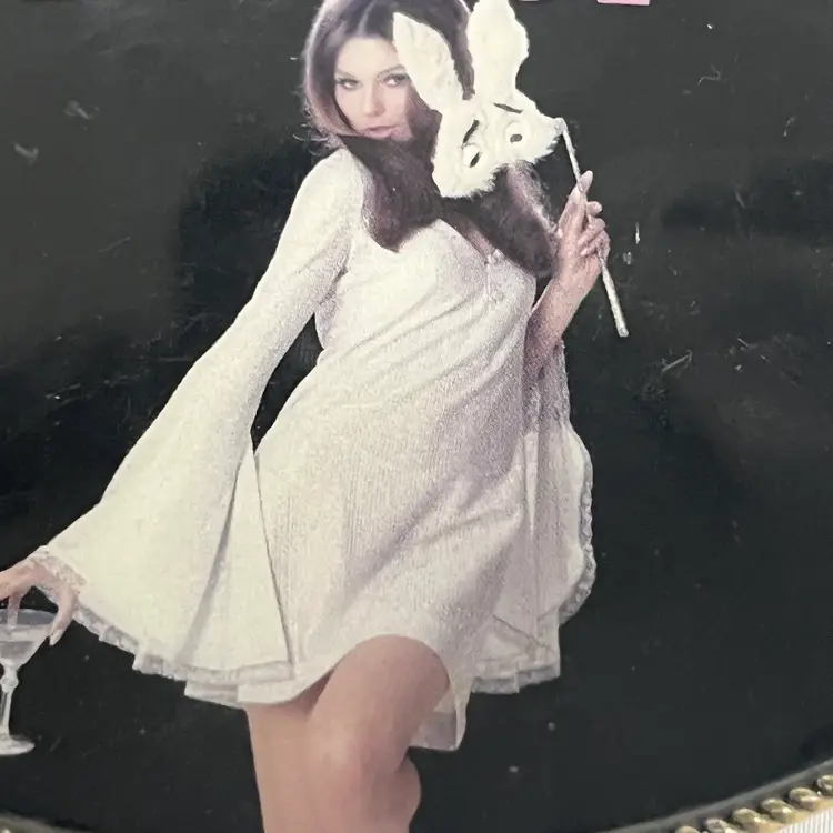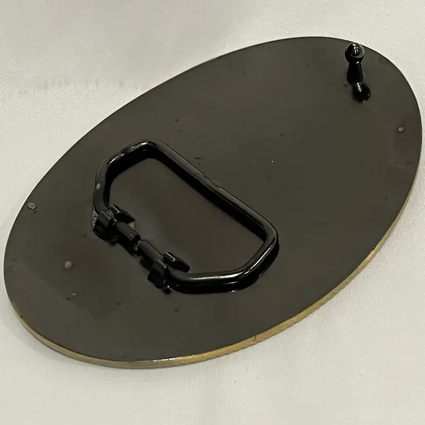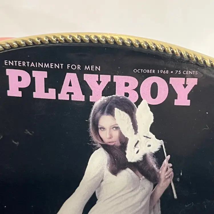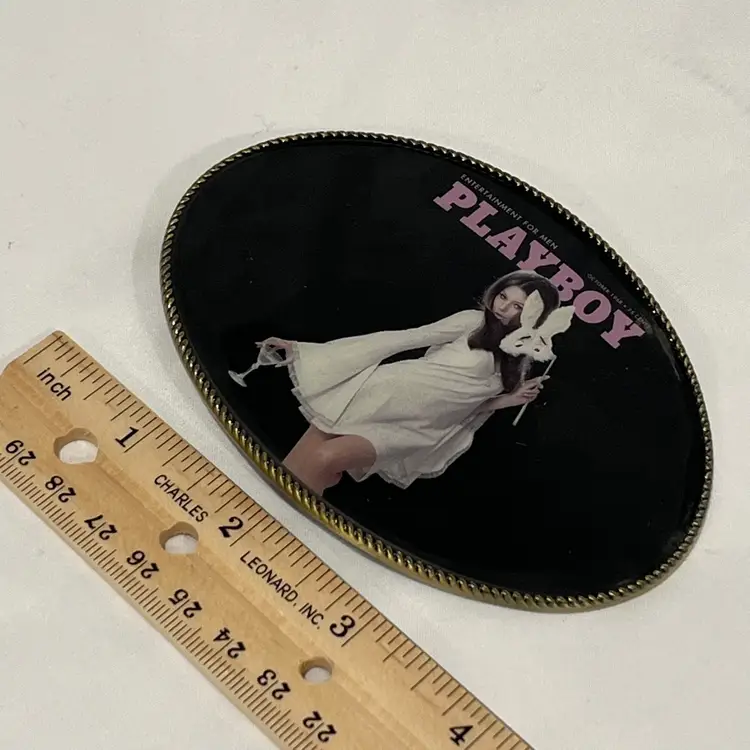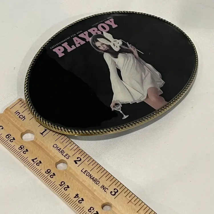 Vintage Playboy belt buckle from October 1968, featuring the iconic pinup cover image. Measures approximately 4.25” wide x 3” tall. Piece shows scratches, surface wear, and could use a more detailed cleaning, as shown in photos. The back hardware is intact.