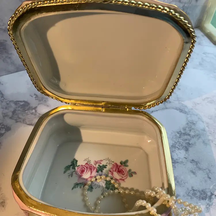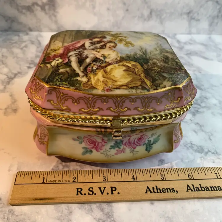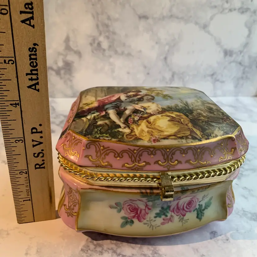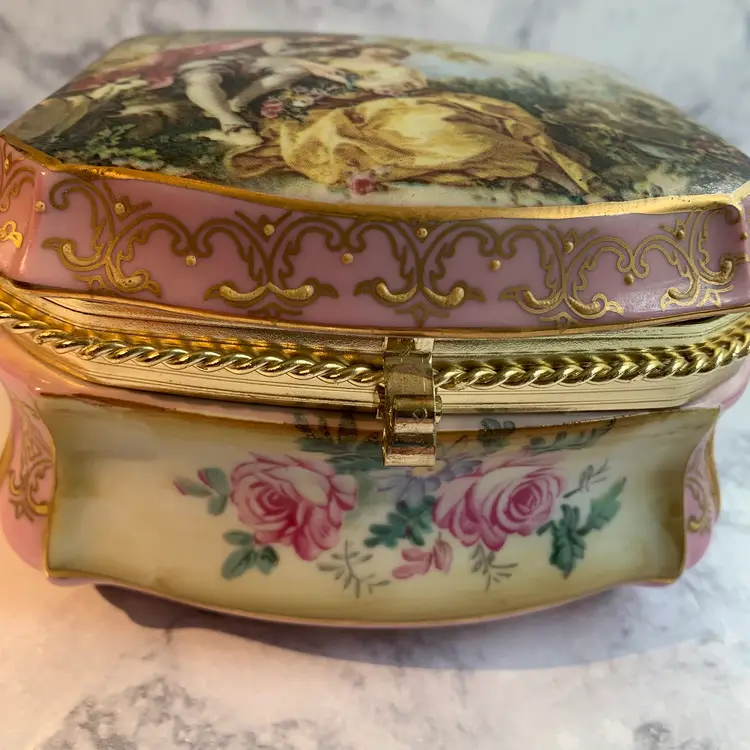 In great condition. No chips or cracks. Beautiful images on box. Lovely for treasures and vintage jewelry.