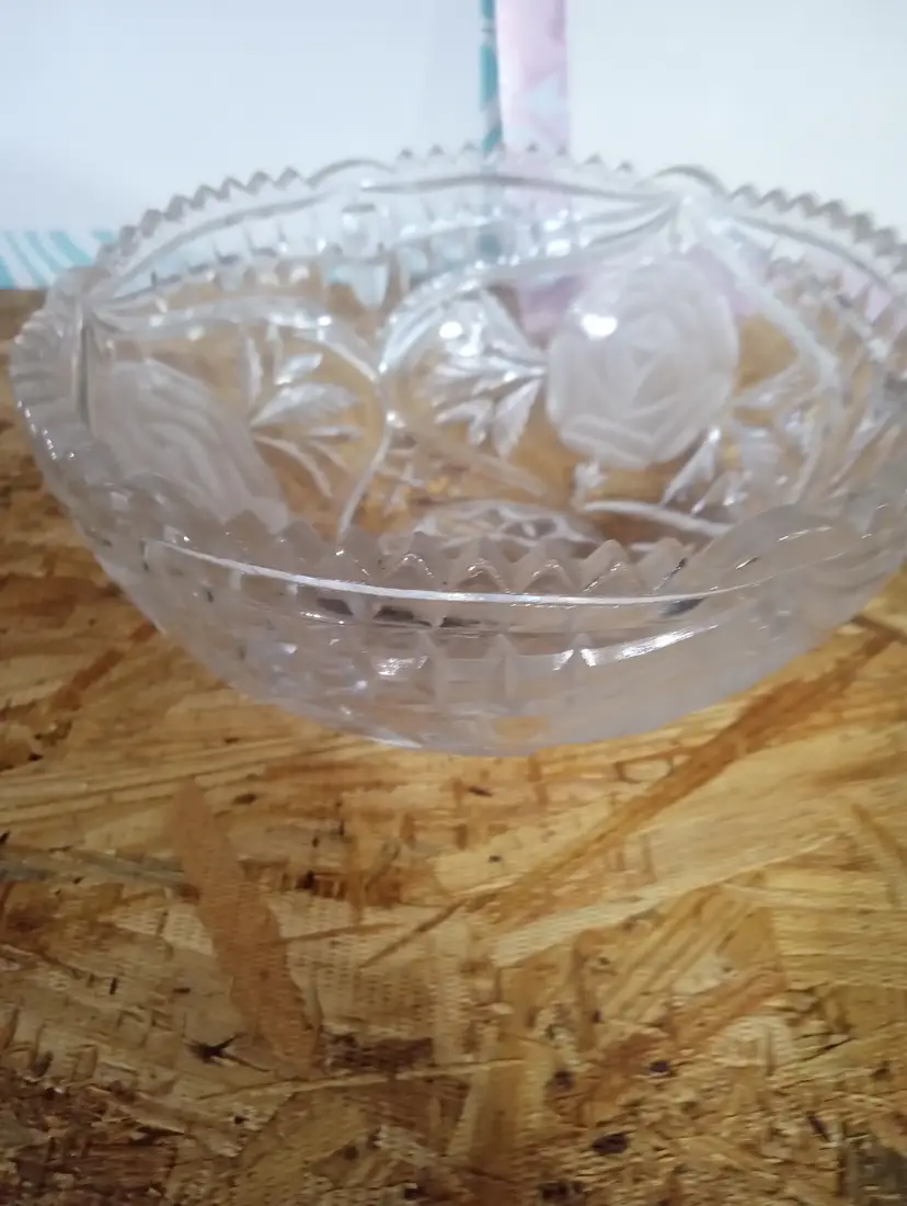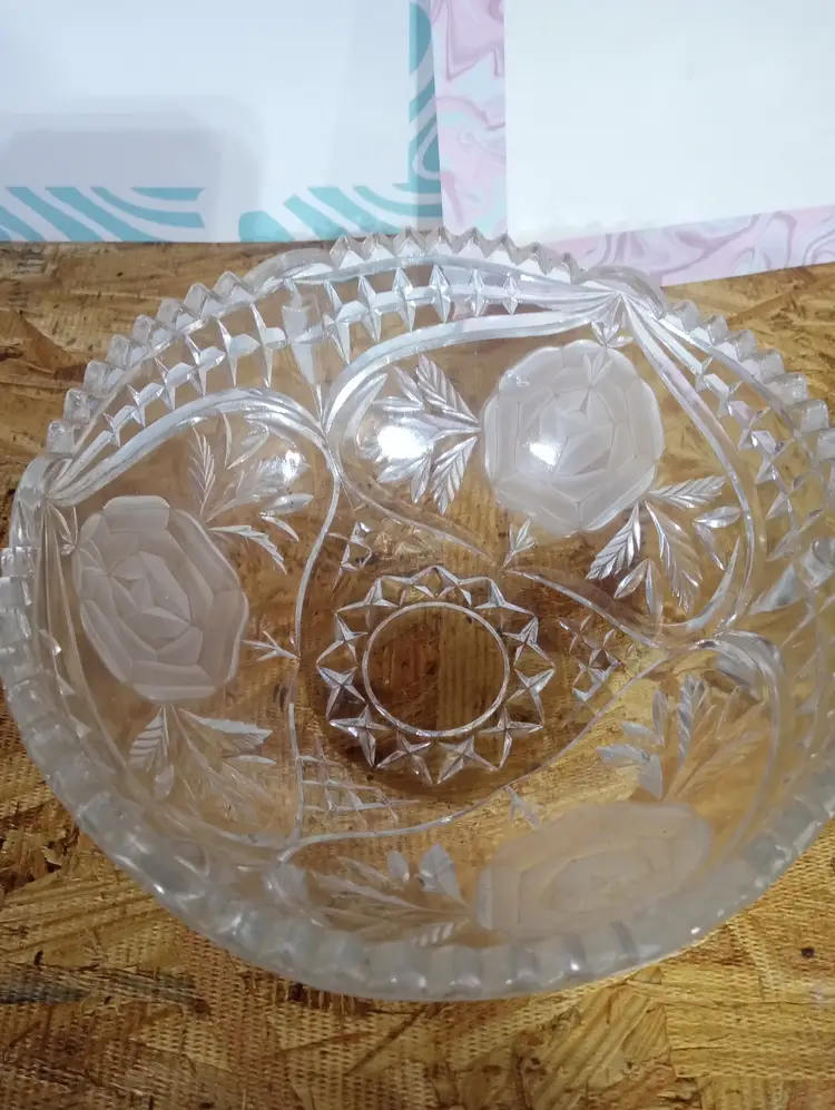 Beautiful vintage clear pressed glass bowl featuring an elegant floral and leaf pattern with a scalloped edge. Perfect for serving candy, fruit, snacks, or for use as decorative glassware in farmhouse, cottage, or vintage-style décor.