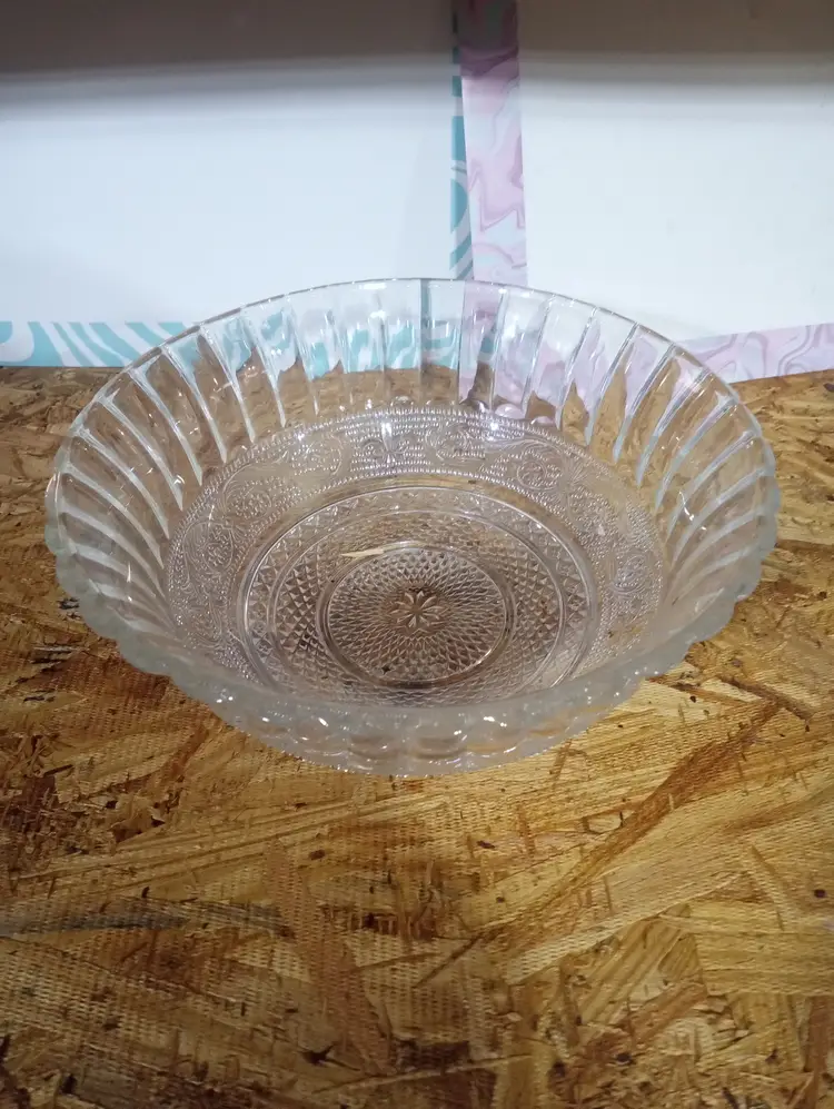 Elegant vintage clear pressed glass serving bowl featuring a ribbed side design with a smooth interior base. Simple, classic style that works beautifully for serving, display, or everyday use. Great addition to farmhouse, vintage, or cottage-style kitchens.