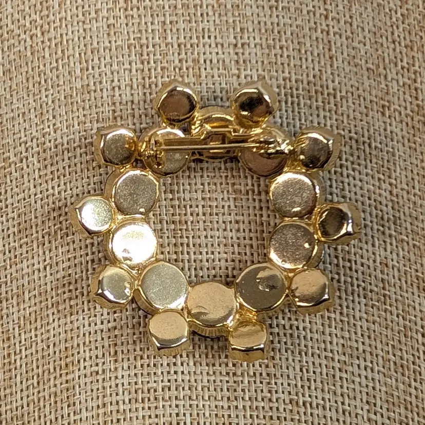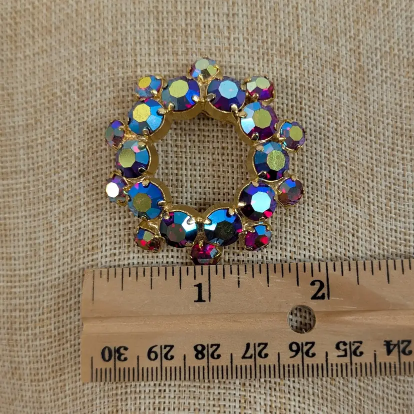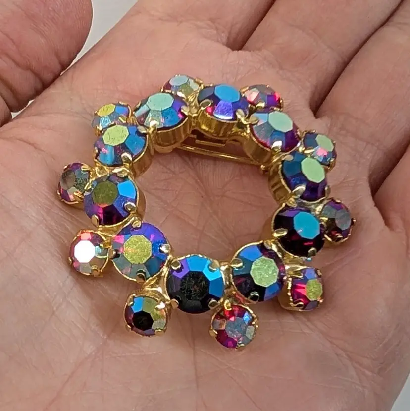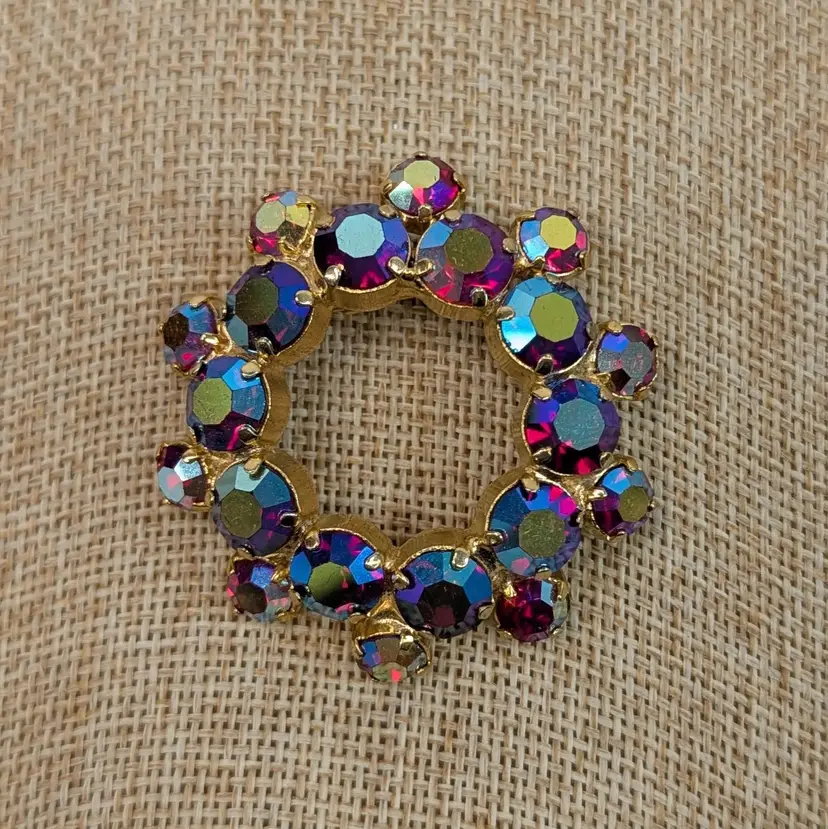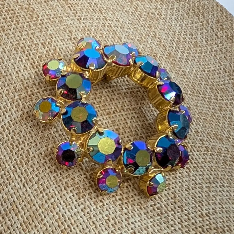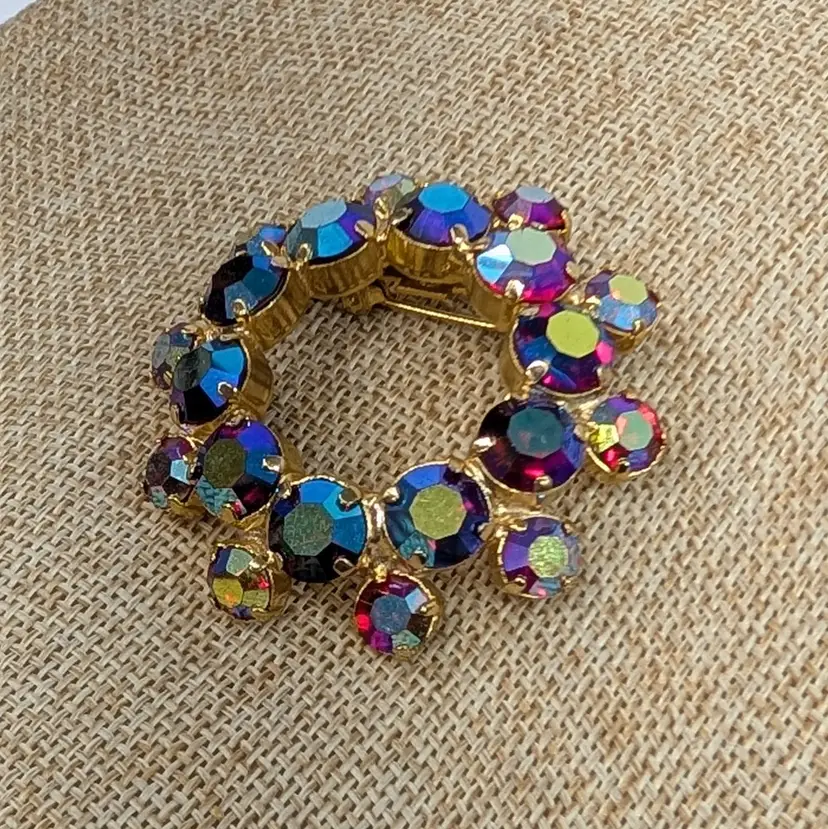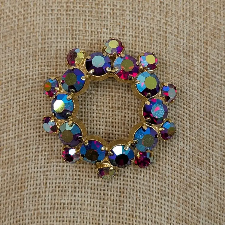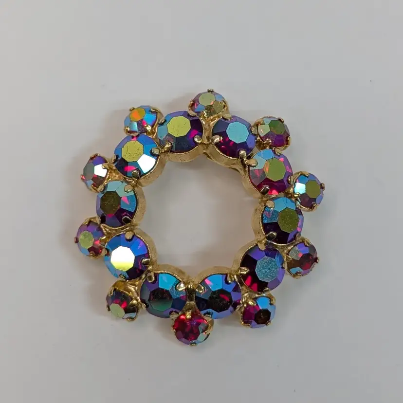 Gorgeous rhinestone brooch with a deep pink or red rhinestone with an AB finish set in a gold tone wreath. It sparkles so nicely! In nice, used vintage condition. Measurements ~ 1.75"
