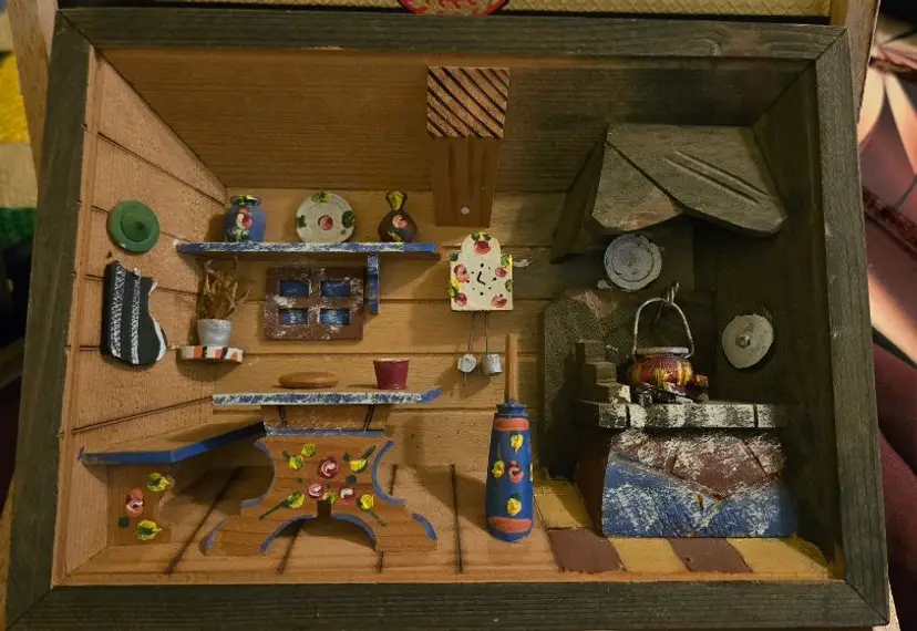 Very well made vintage shadow box folk art.Made in Italy.Measures 9" there is no damage all of the miniature pieces are intact.The back is marked Italy.