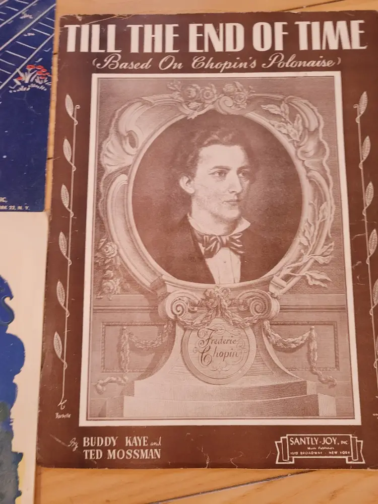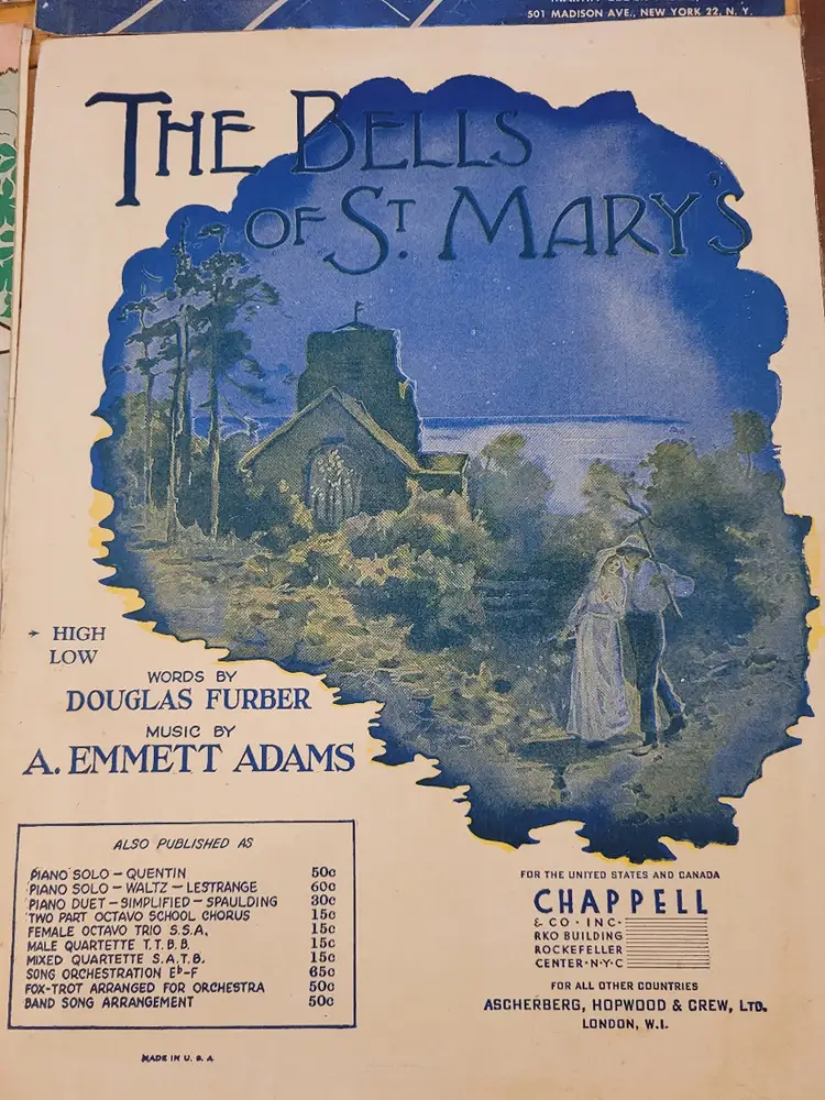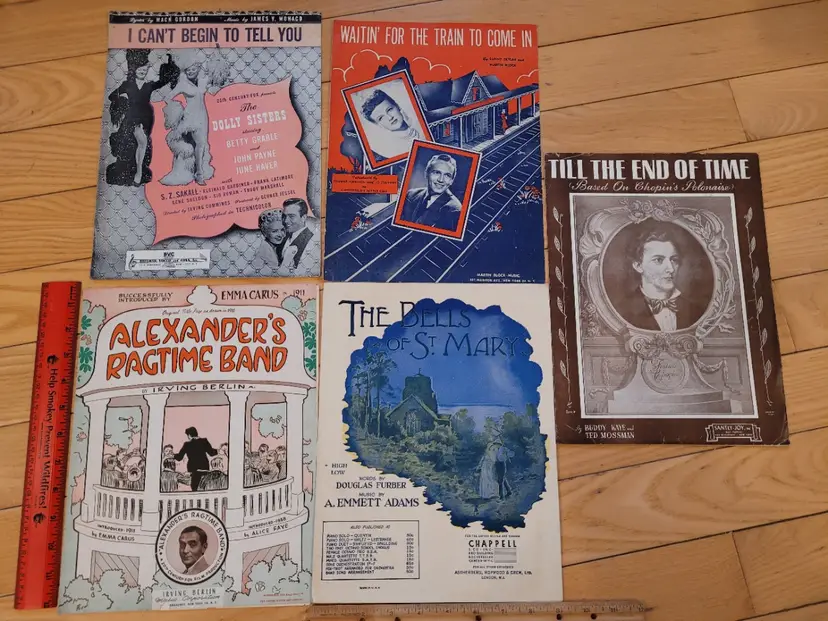 I can't begin to tell you. Waitin' for the train to come in. Alexander's ragtime band. The bells of St. Mary. Till the end of time. 5 pieces of sheet music in good condition. Have been in storage. Thank you for looking.