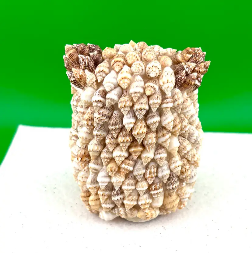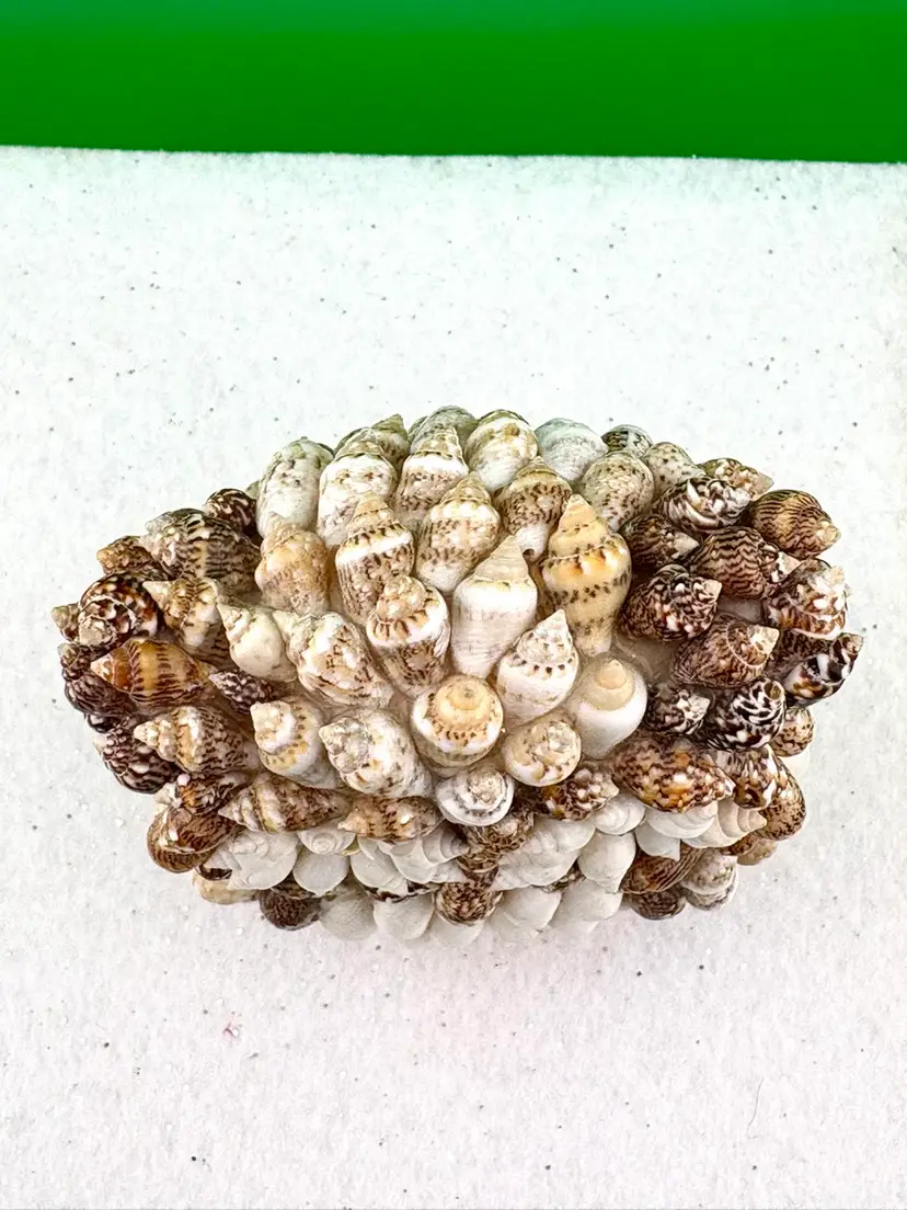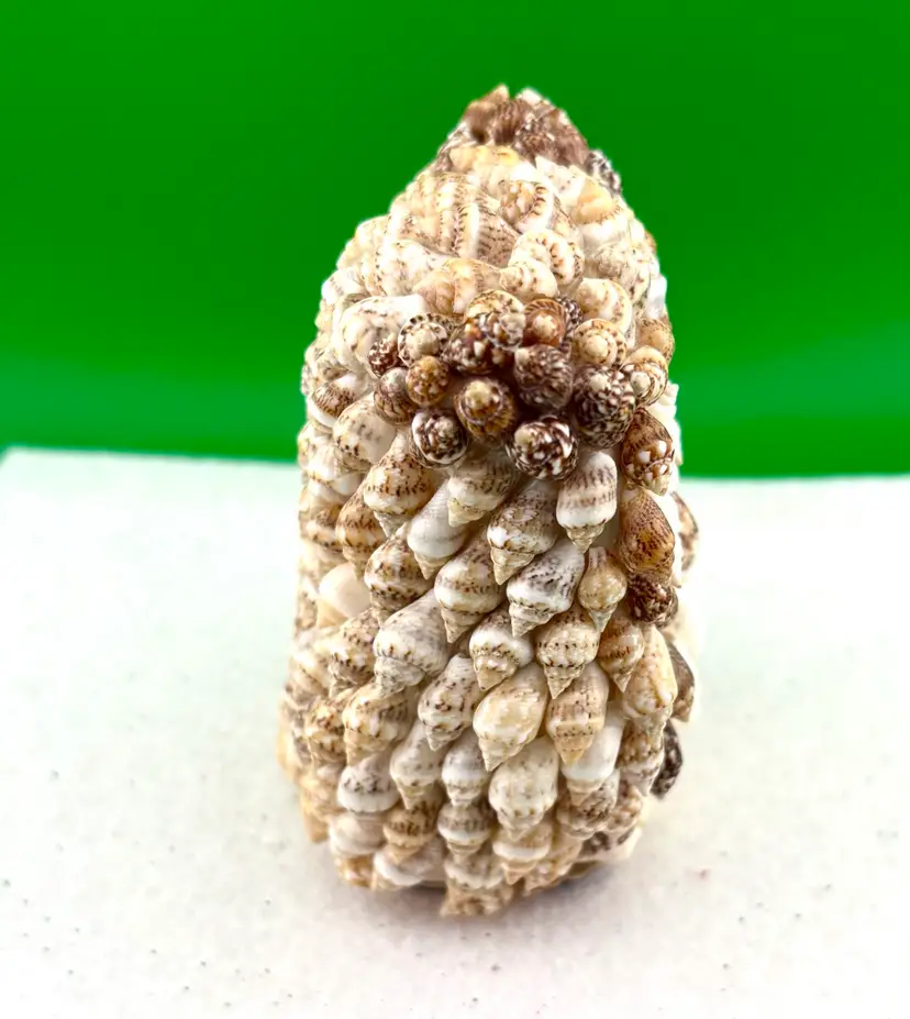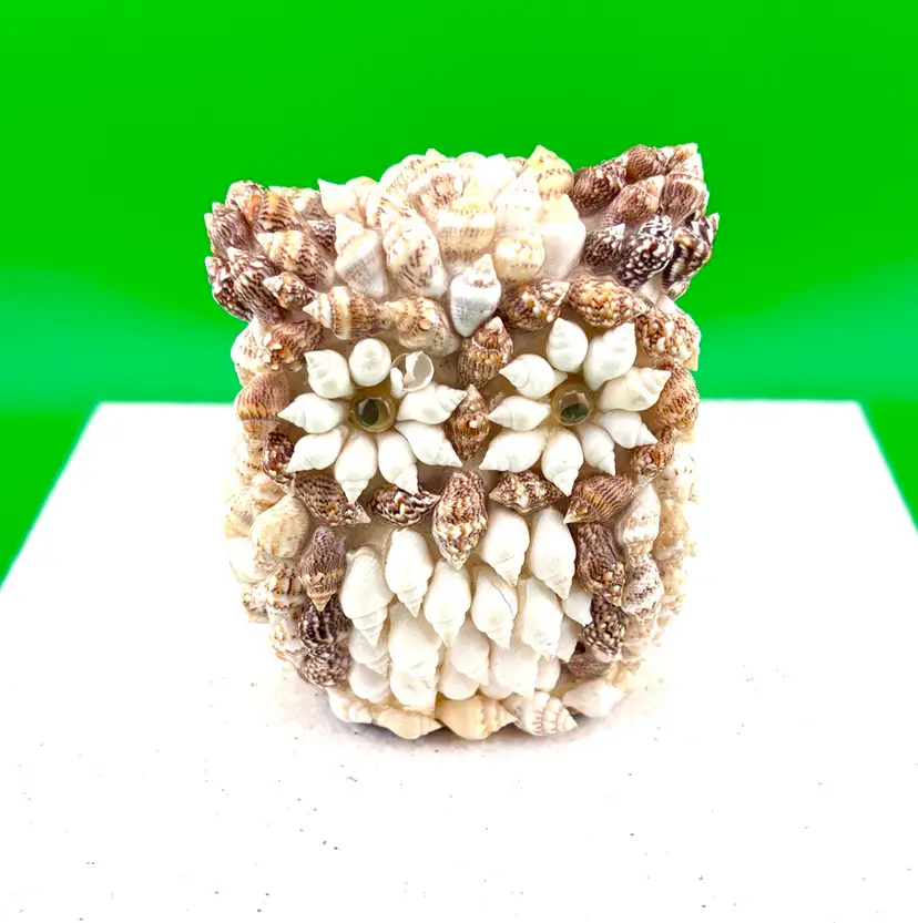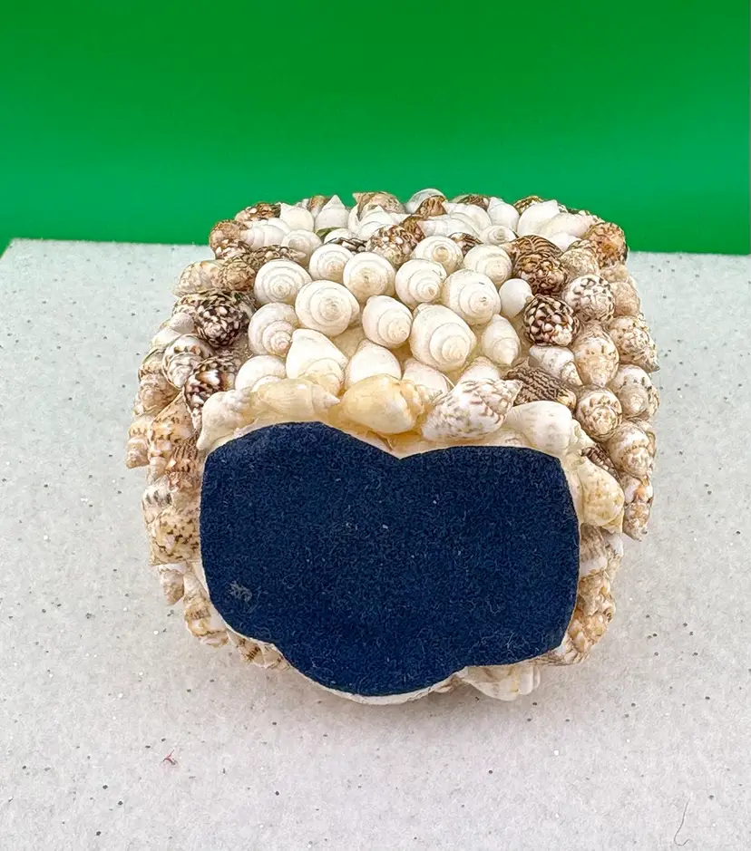 This shell owl has blue felt in the base. It is in good condition with no chips or missing shells.