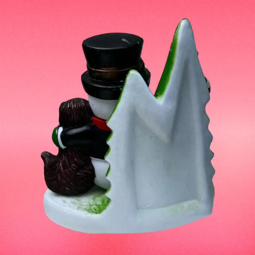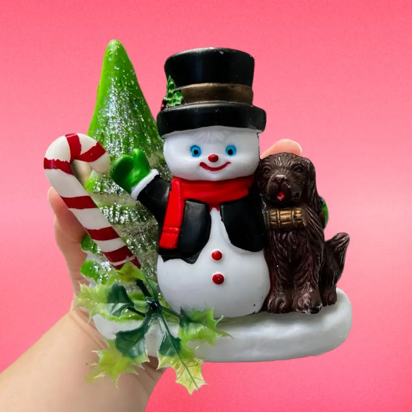 Adorable vintage snowman figurine with a cute dog, candy cane, and glittery tree. Perfect for adding a festive touch to your holiday decor!