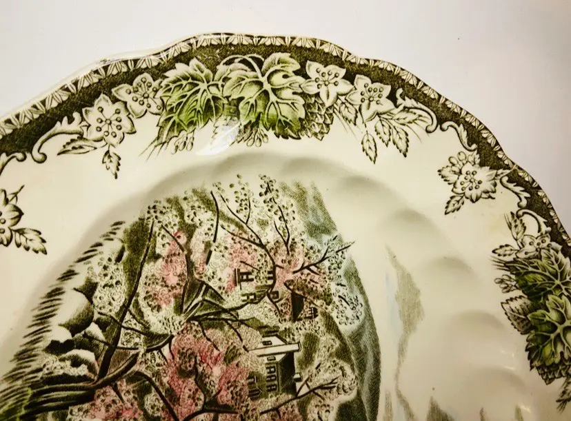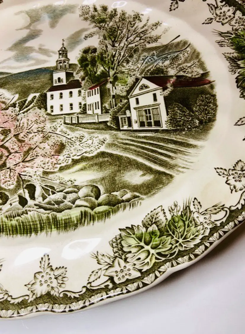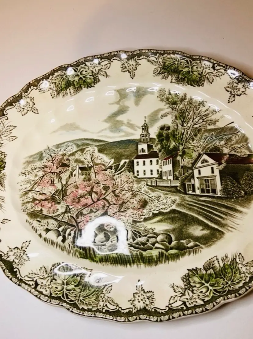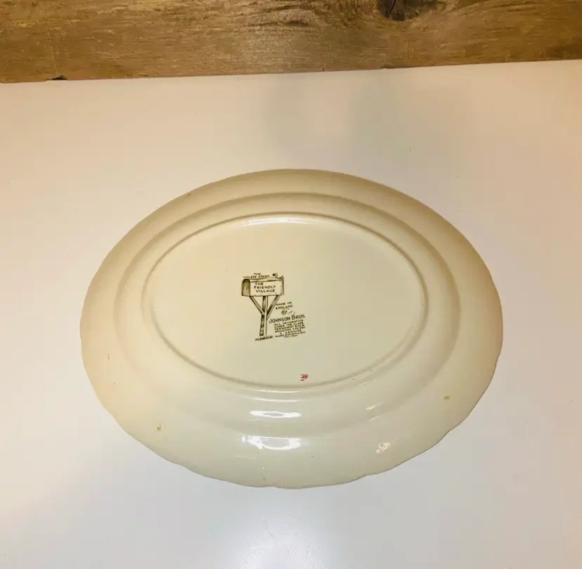 The Friendly Village 12 inch, "The Village Green" oval platter by Johnson Bros. was made in the 1950s. The colors are subtle and really wonderful browns and pinks. It is in good used condition. No chips or cracks.