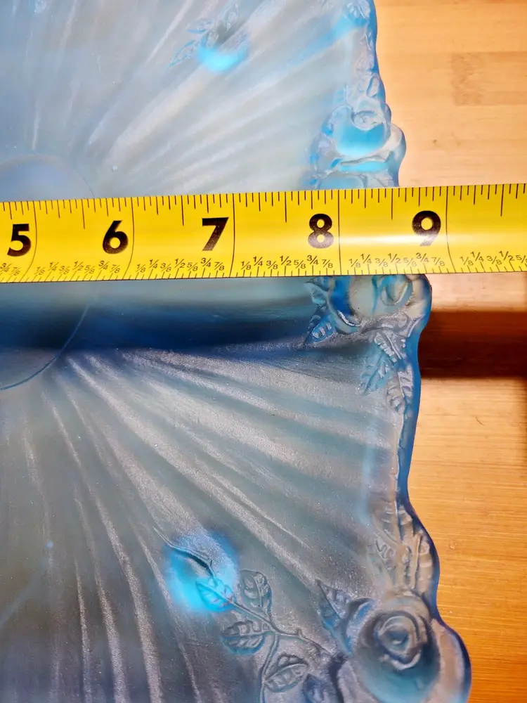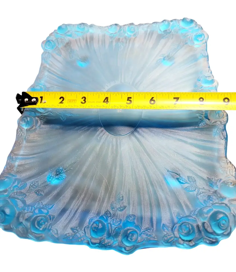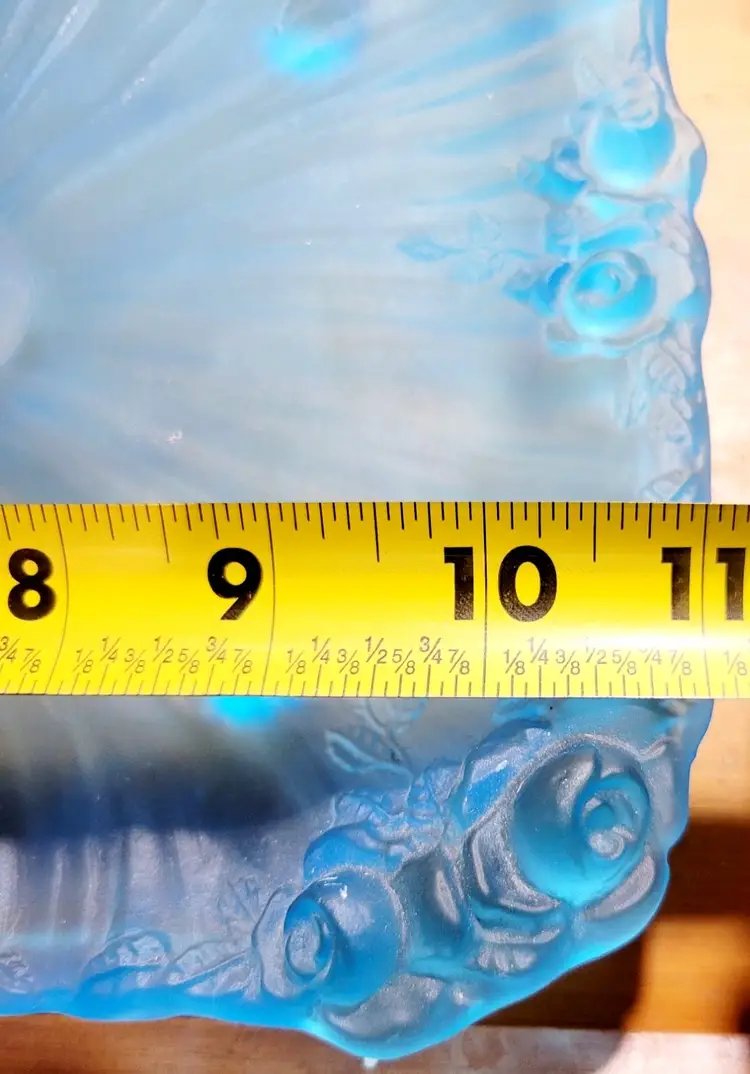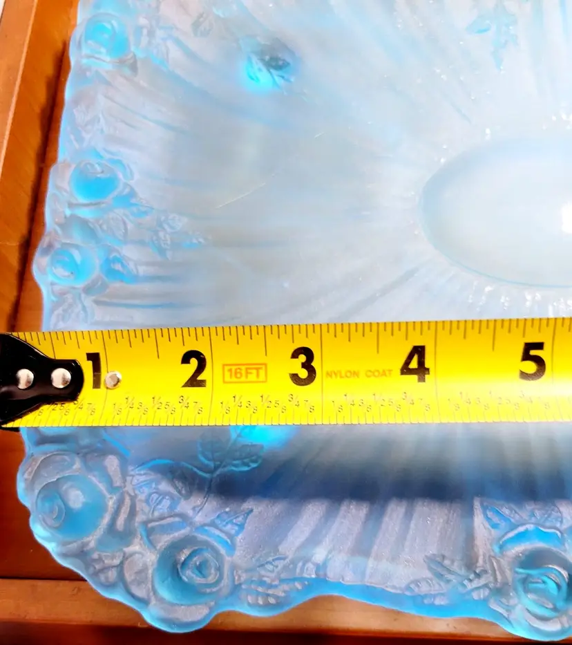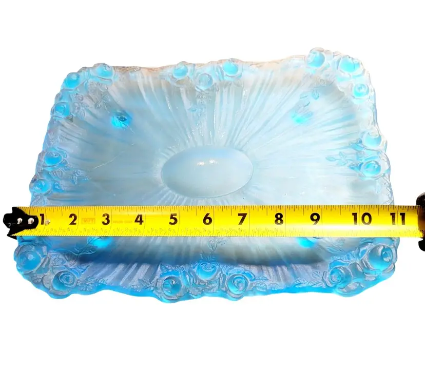 This vintage Tiffin Glass Co. vanity tray is an exquisite piece from a bygone era, showcasing a delicate blue hue that reacts under UV light. Its raised rose edges add an elegant touch, making it a rare find for collectors and enthusiasts of antique glassware. • UV reactive for added charm • Beautifully raised rose edge design • Measures 11 inches by 9 inches • Ideal for display or functional use