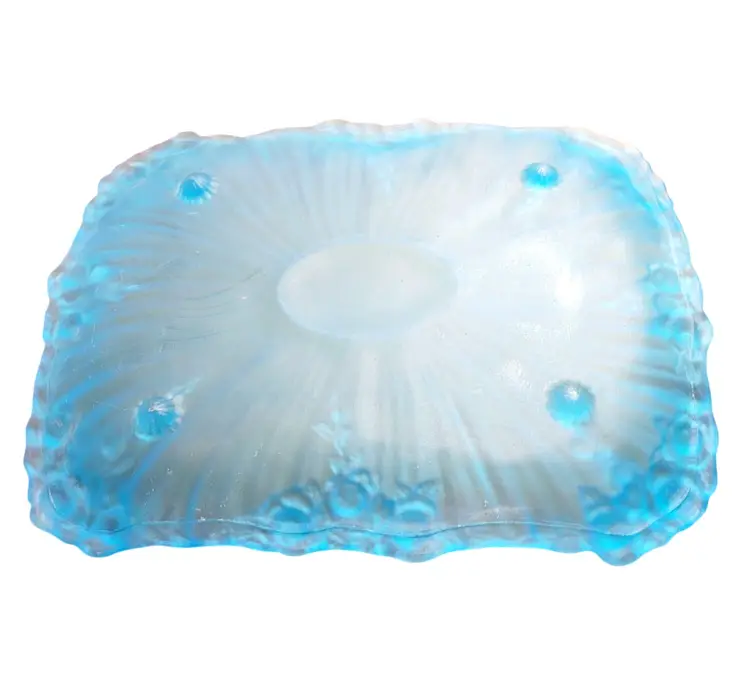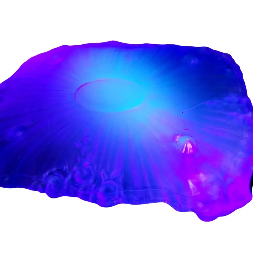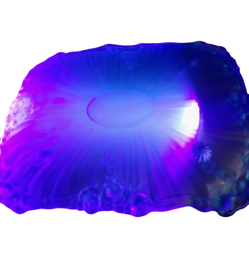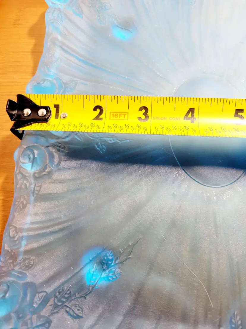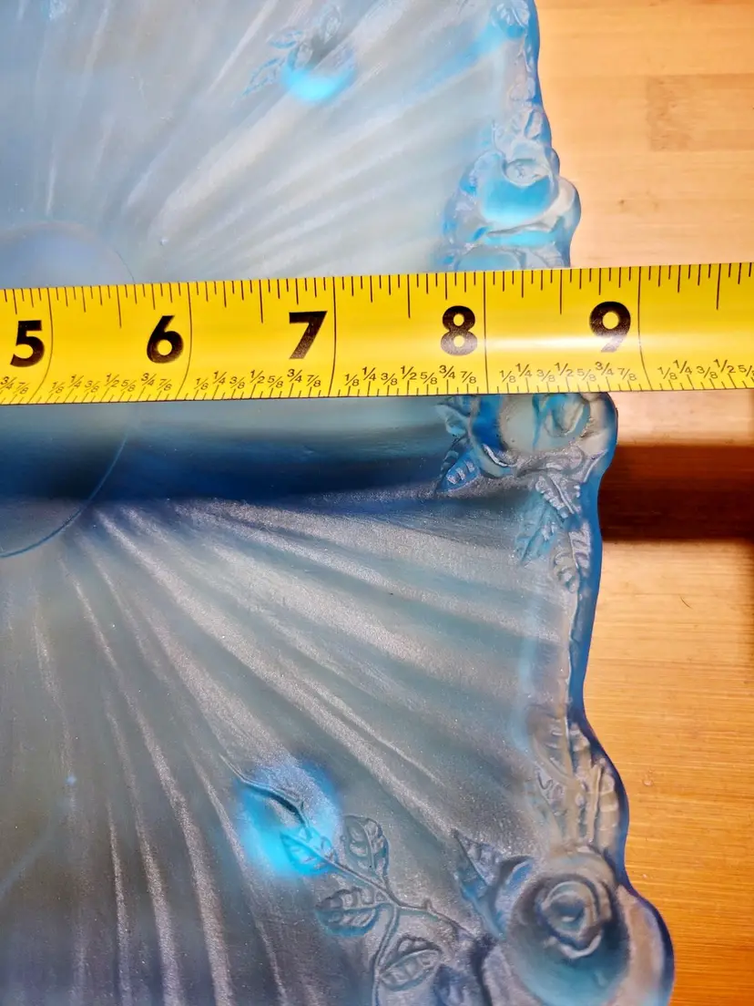 This vintage Tiffin Glass Co. vanity tray is an exquisite piece from a bygone era, showcasing a delicate blue hue that reacts under UV light. Its raised rose edges add an elegant touch, making it a rare find for collectors and enthusiasts of antique glassware. • UV reactive for added charm • Beautifully raised rose edge design • Measures 11 inches by 9 inches • Ideal for display or functional use