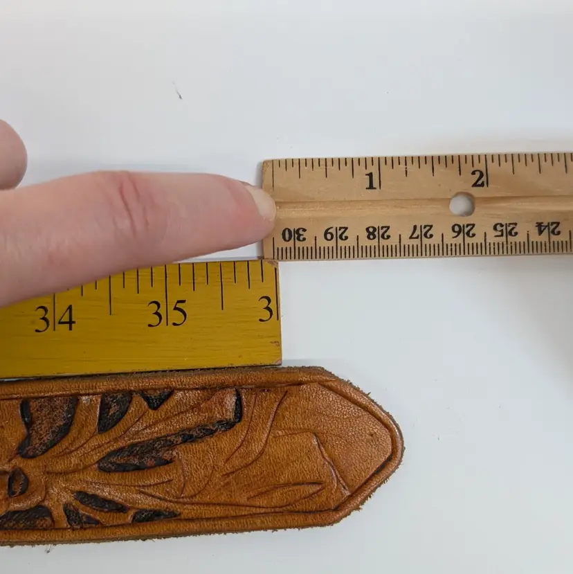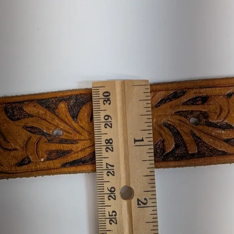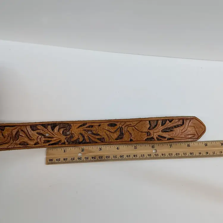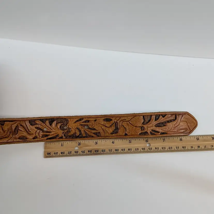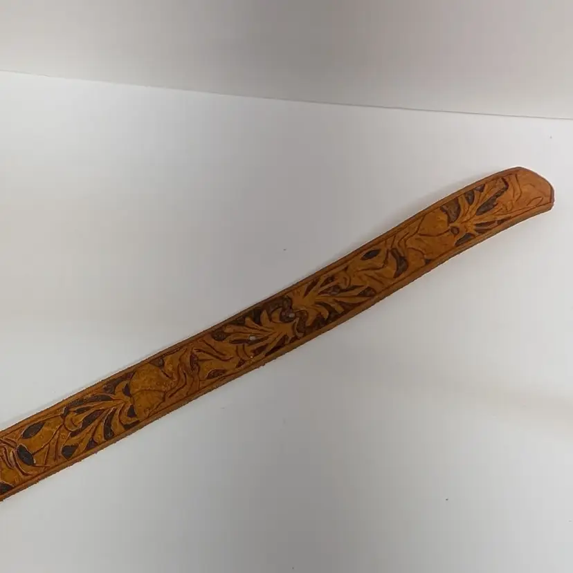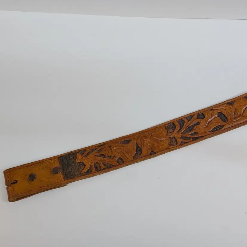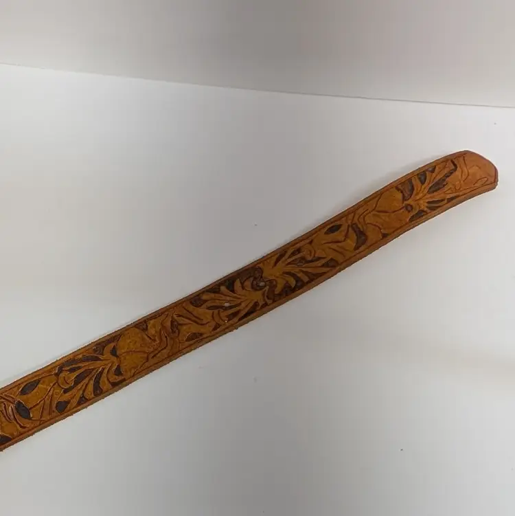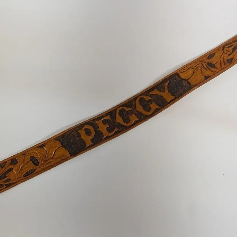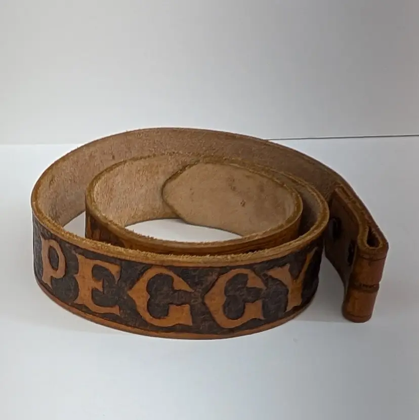 If you are a Peggy or know one this belt is for you! Beautiful, hand tooled leather belt with a floral design and PEGGY in the middle. In nice, used condition and soft leather. The belt is 37" long and the holes are from 28 to 30.5"