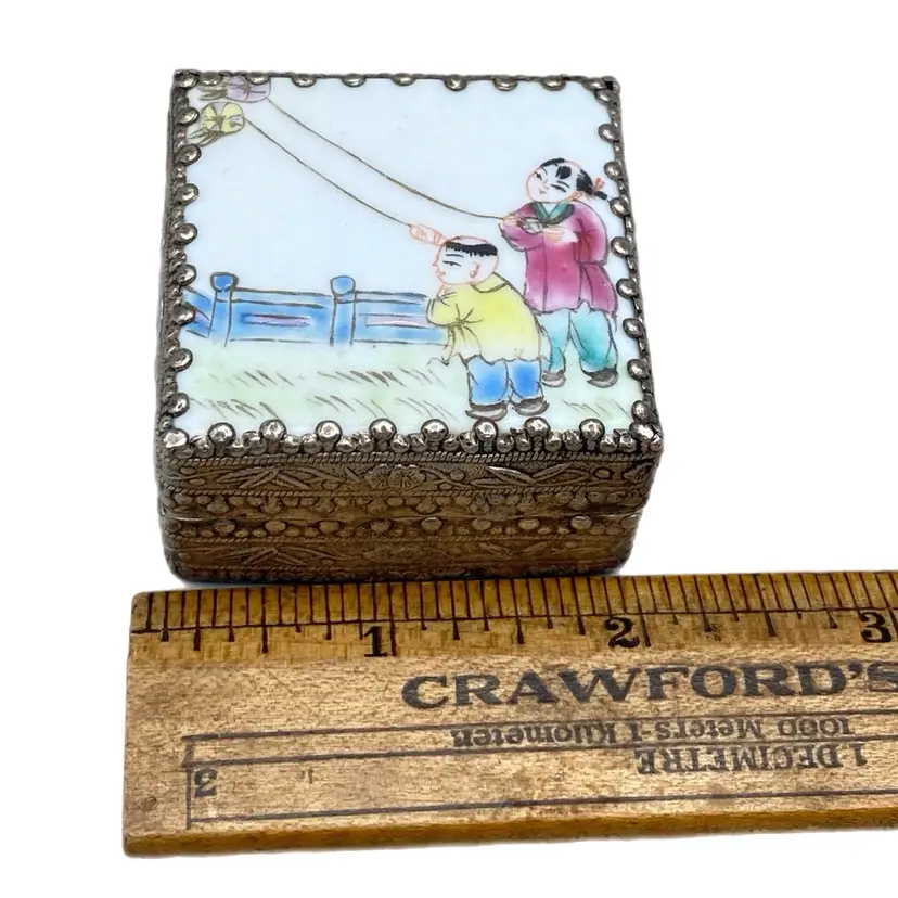 Vintage Asian Trinket Box Hand Painted Porcelain and Metal Silver Wash