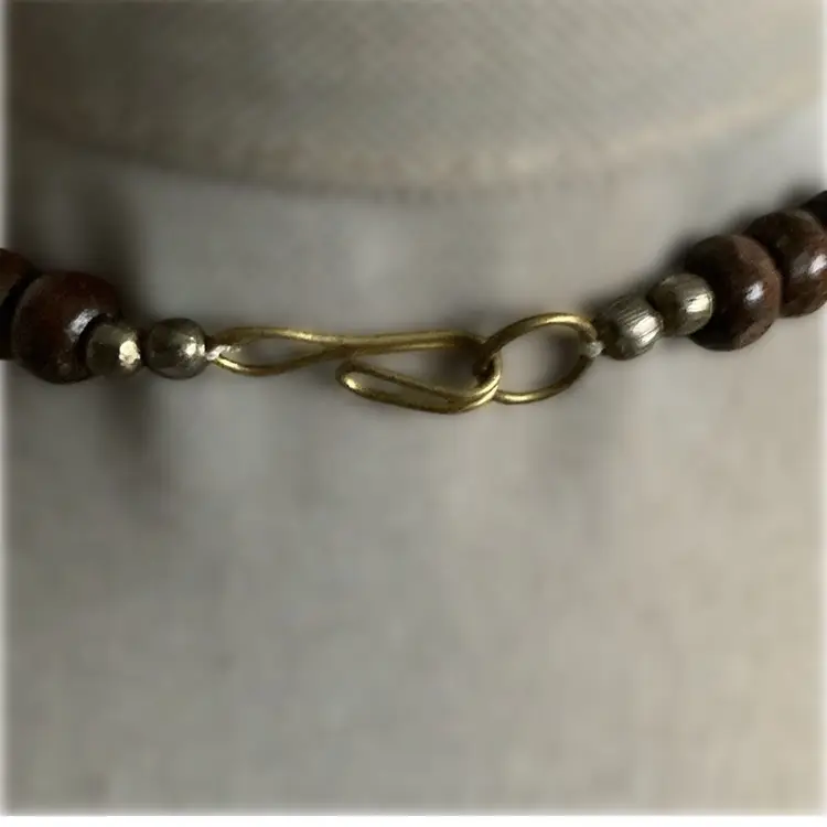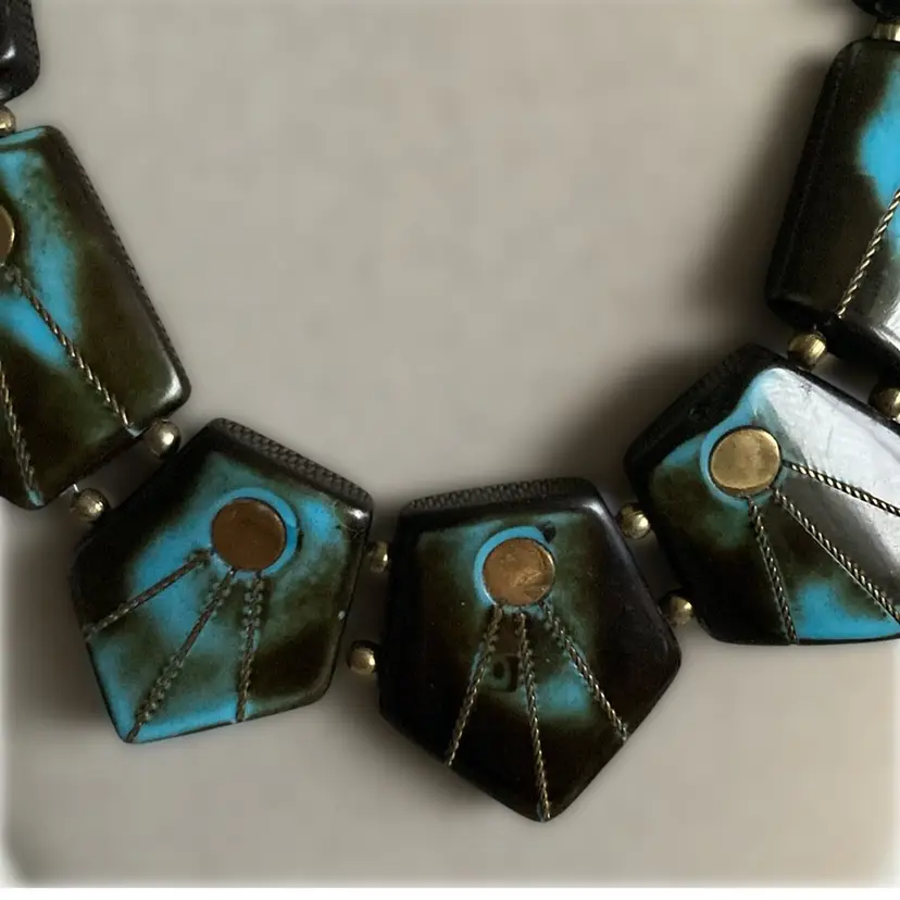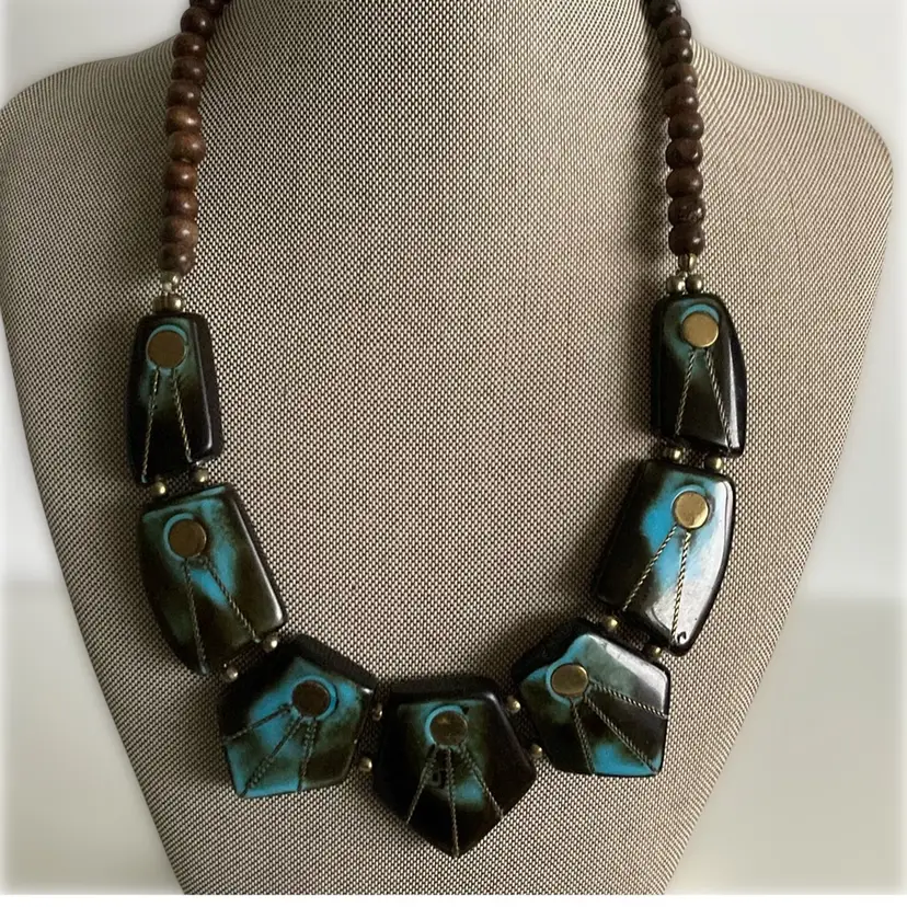Vintage turquoise and brown marbled Lucite statement necklace with copper metal inclusions. There also wood and metal beads. Length measures 13”.