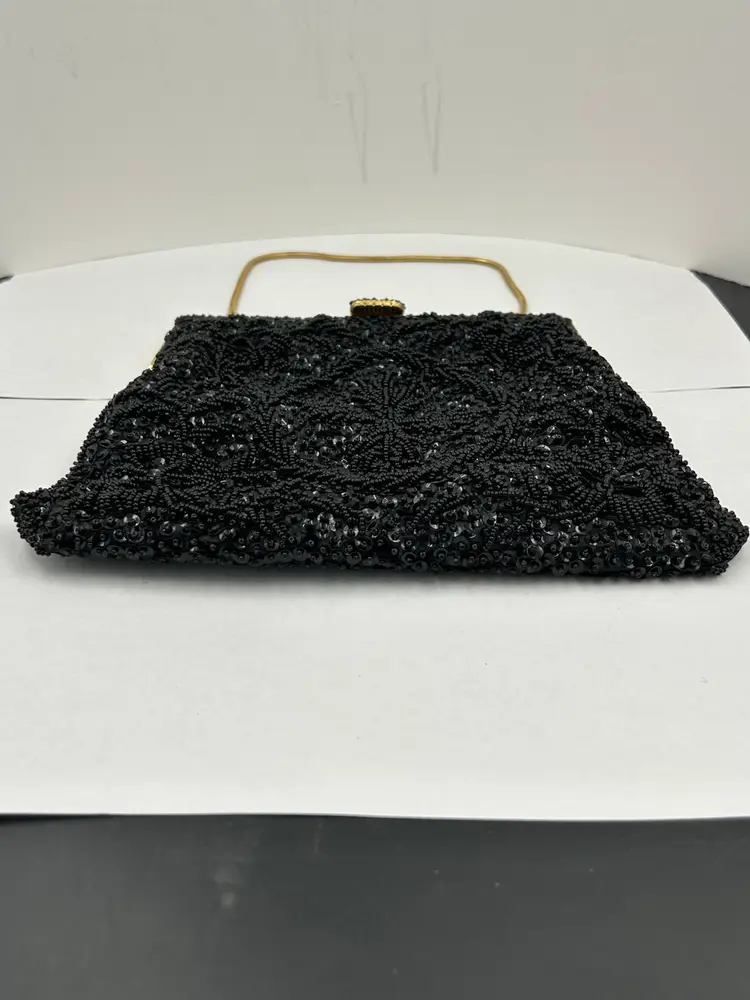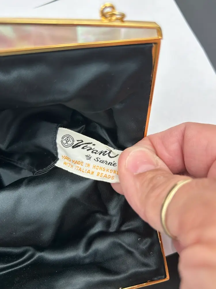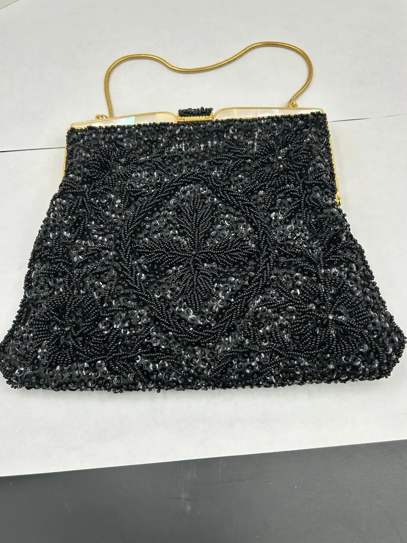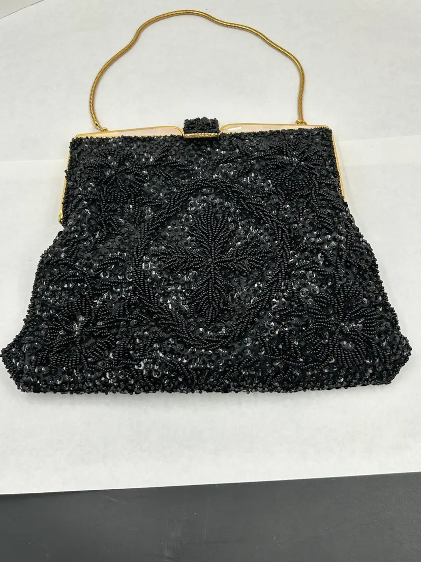 Pristine condition. Gold frame with metal beaded clasp. Made with Italian beads. 9L.X 7.5 W. Drop on chain 6”