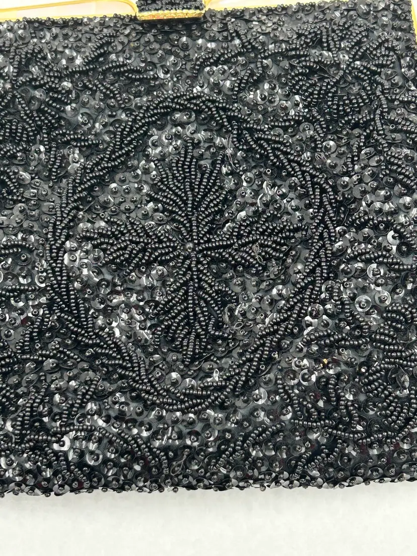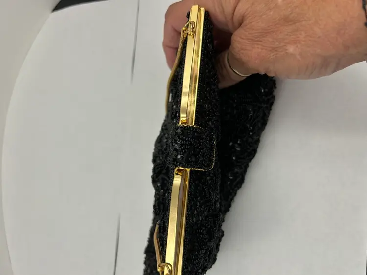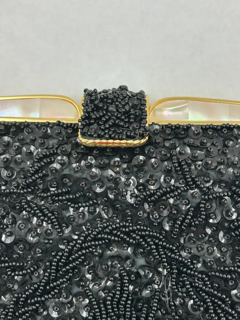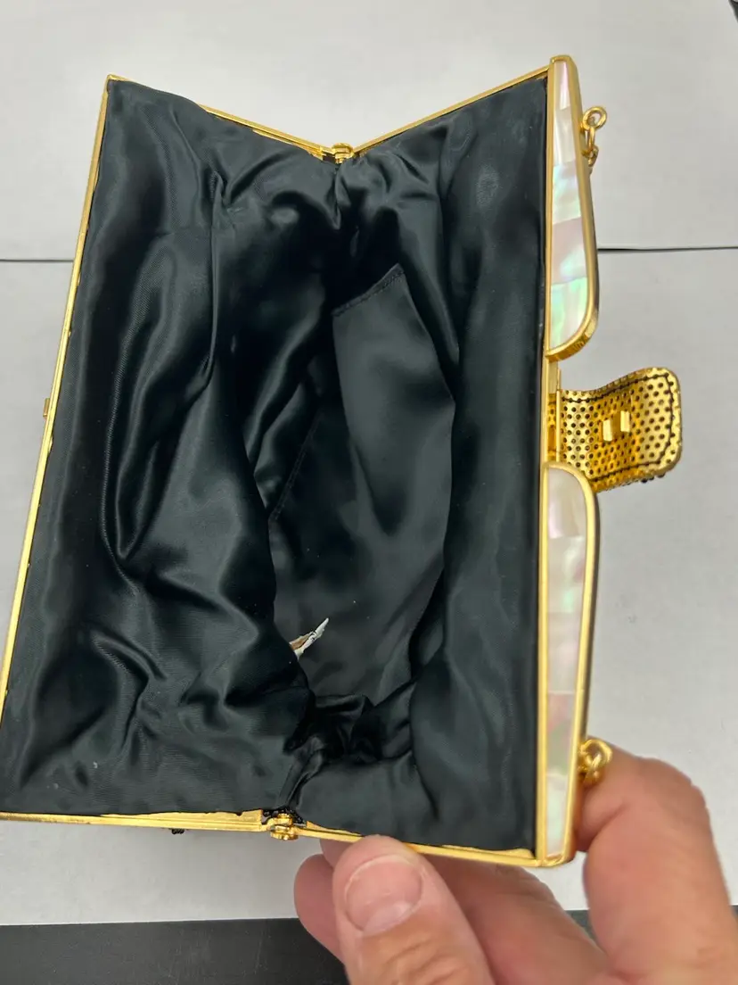 Pristine condition. Gold frame with metal beaded clasp. Made with Italian beads. 9L.X 7.5 W. Drop on chain 6”