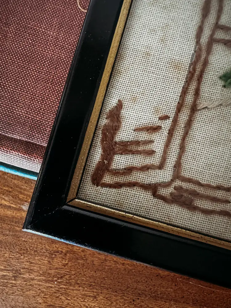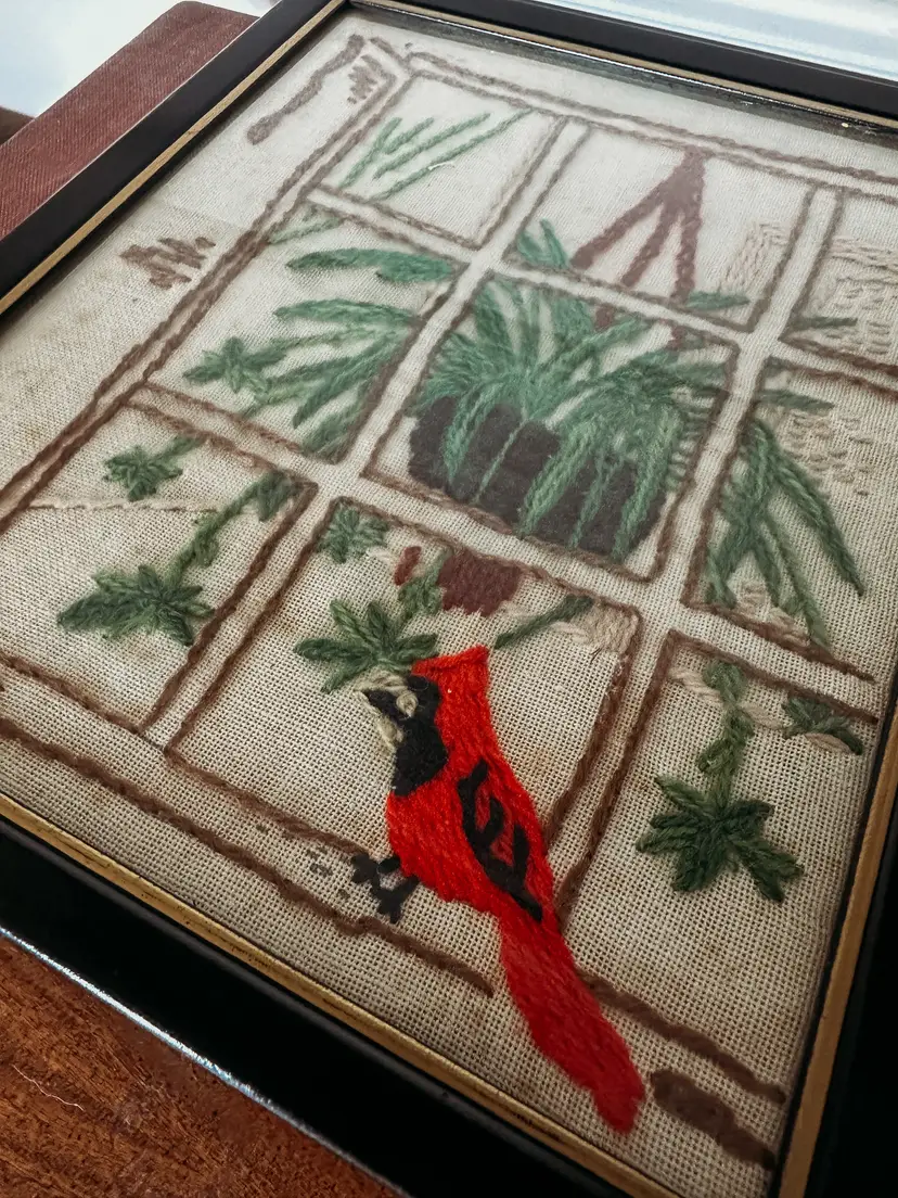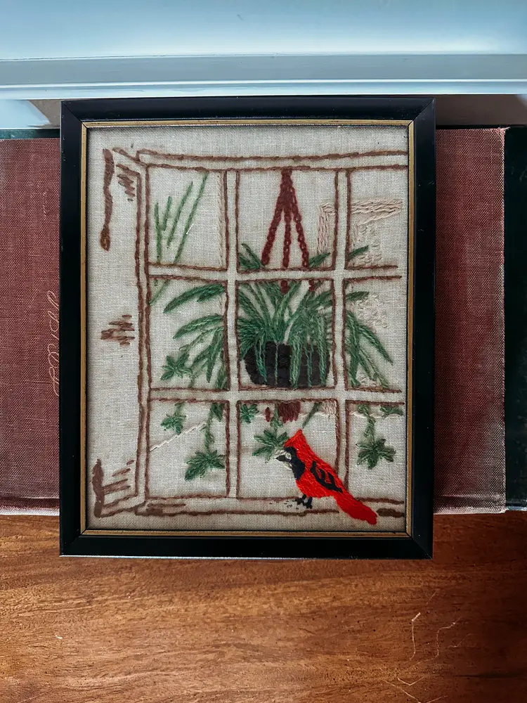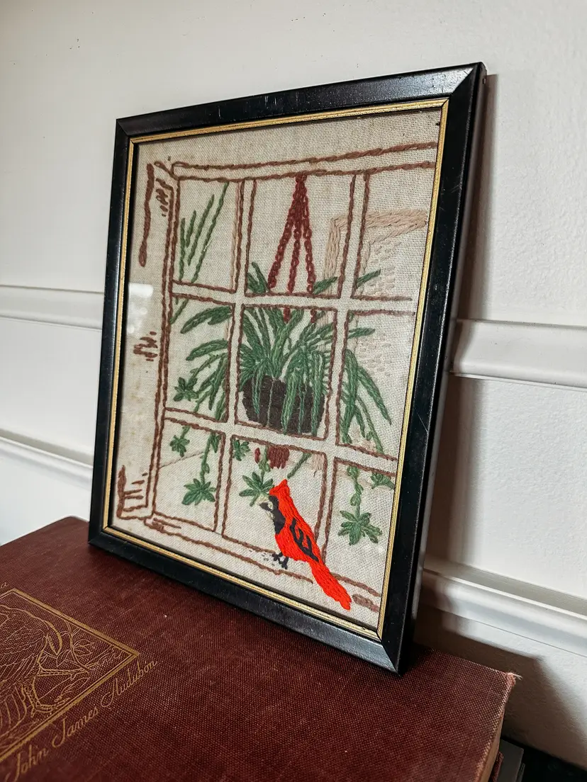 Framed in black and gold, this winter scene featuring a bright red cardinal and a handing plant inside the window is so whimsical. A wonderful addition to any holiday home or gift for the vintage enthusiast! Measures 10.75x8.75"